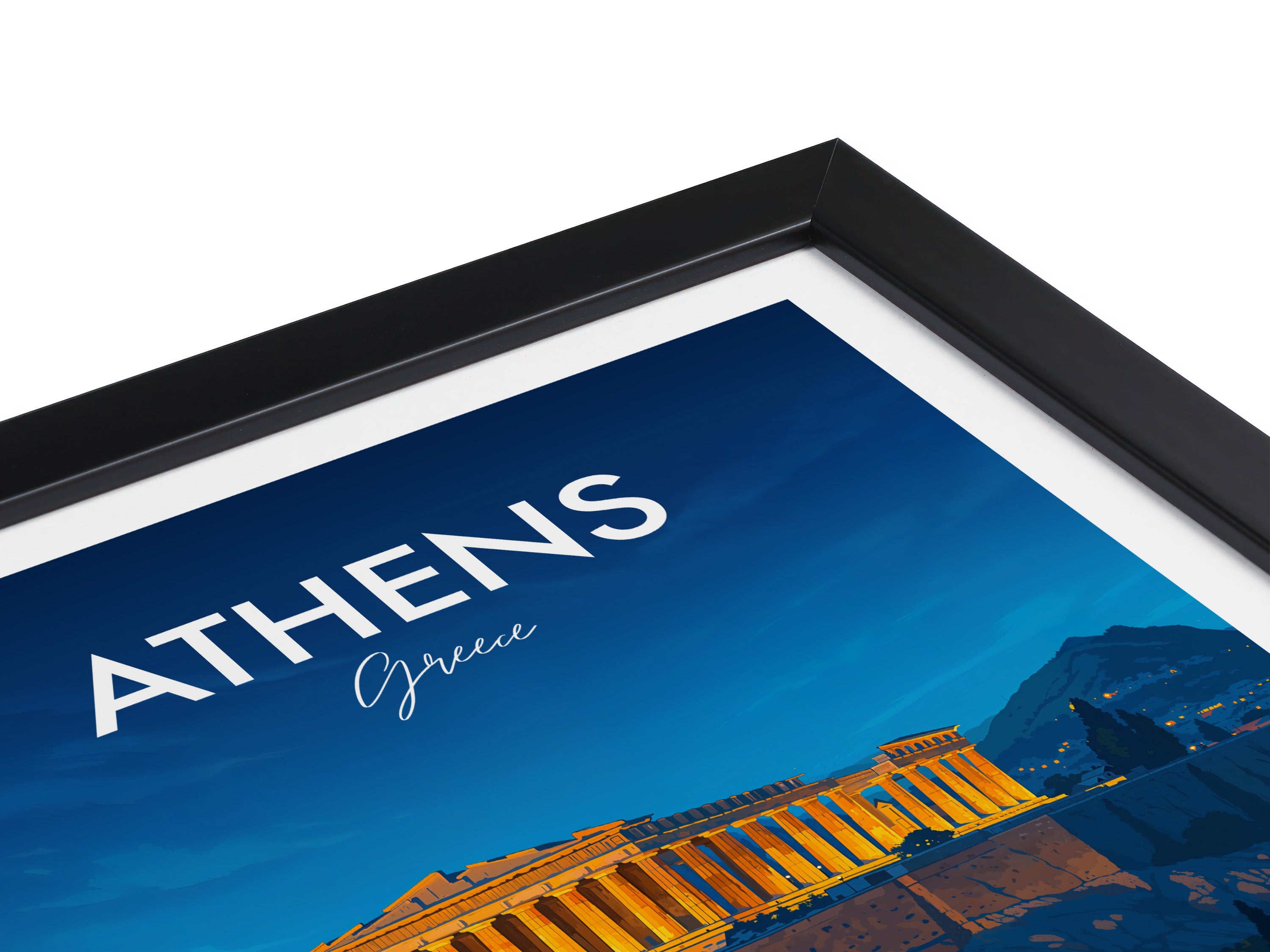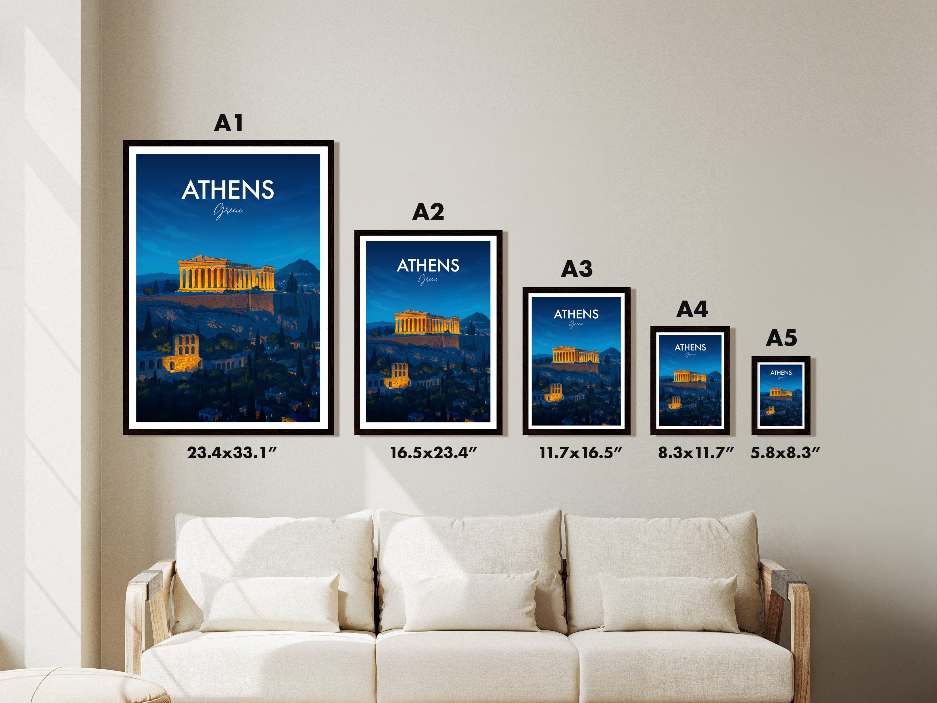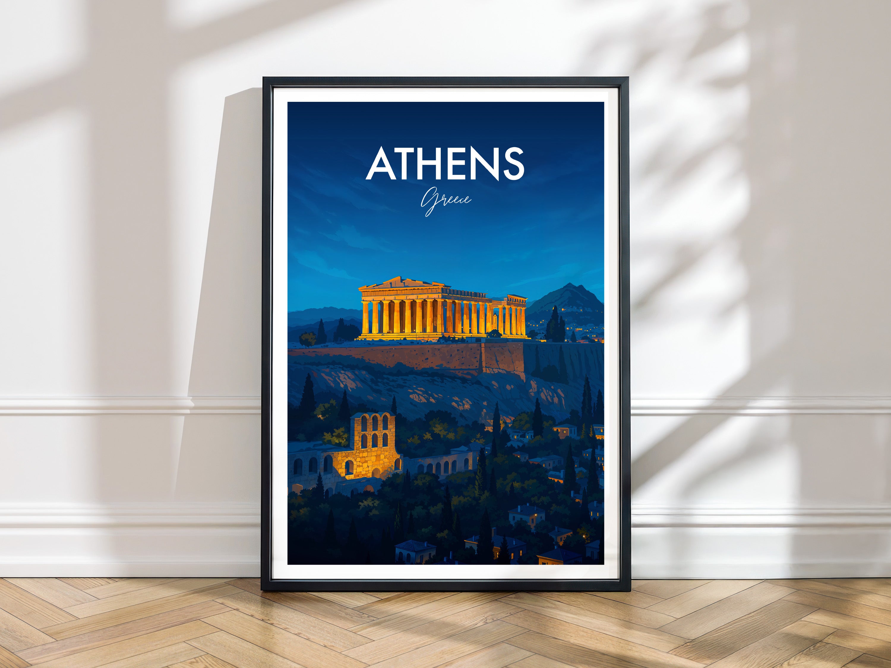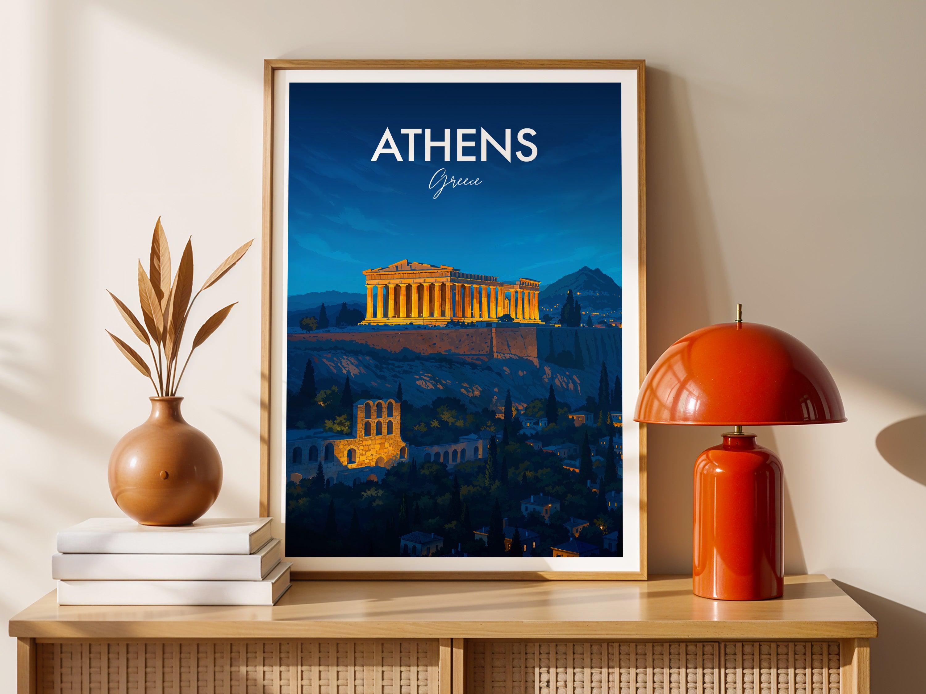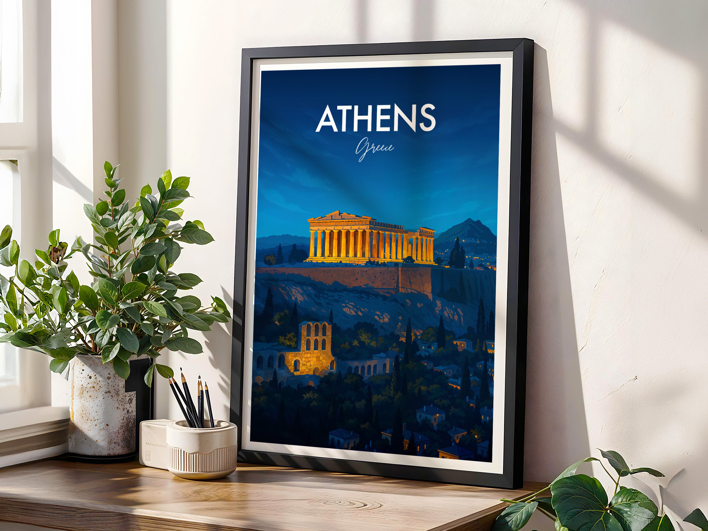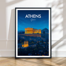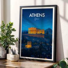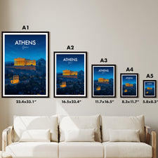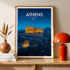 Elevate your space with this striking print of the Acropolis at dusk, set against the vibrant Athens skyline. Perfect for admirers of ancient history and Greek culture.