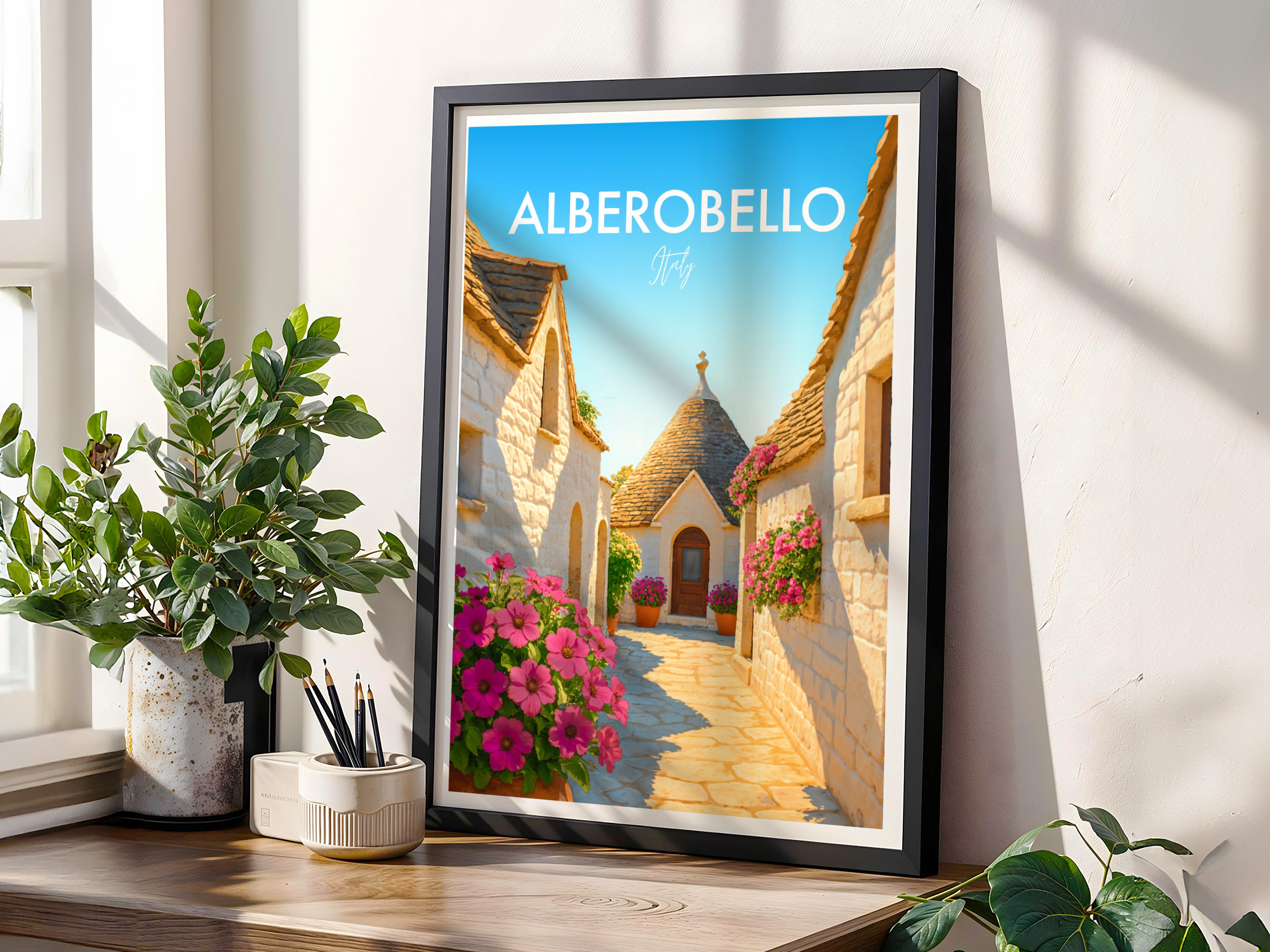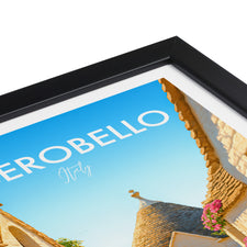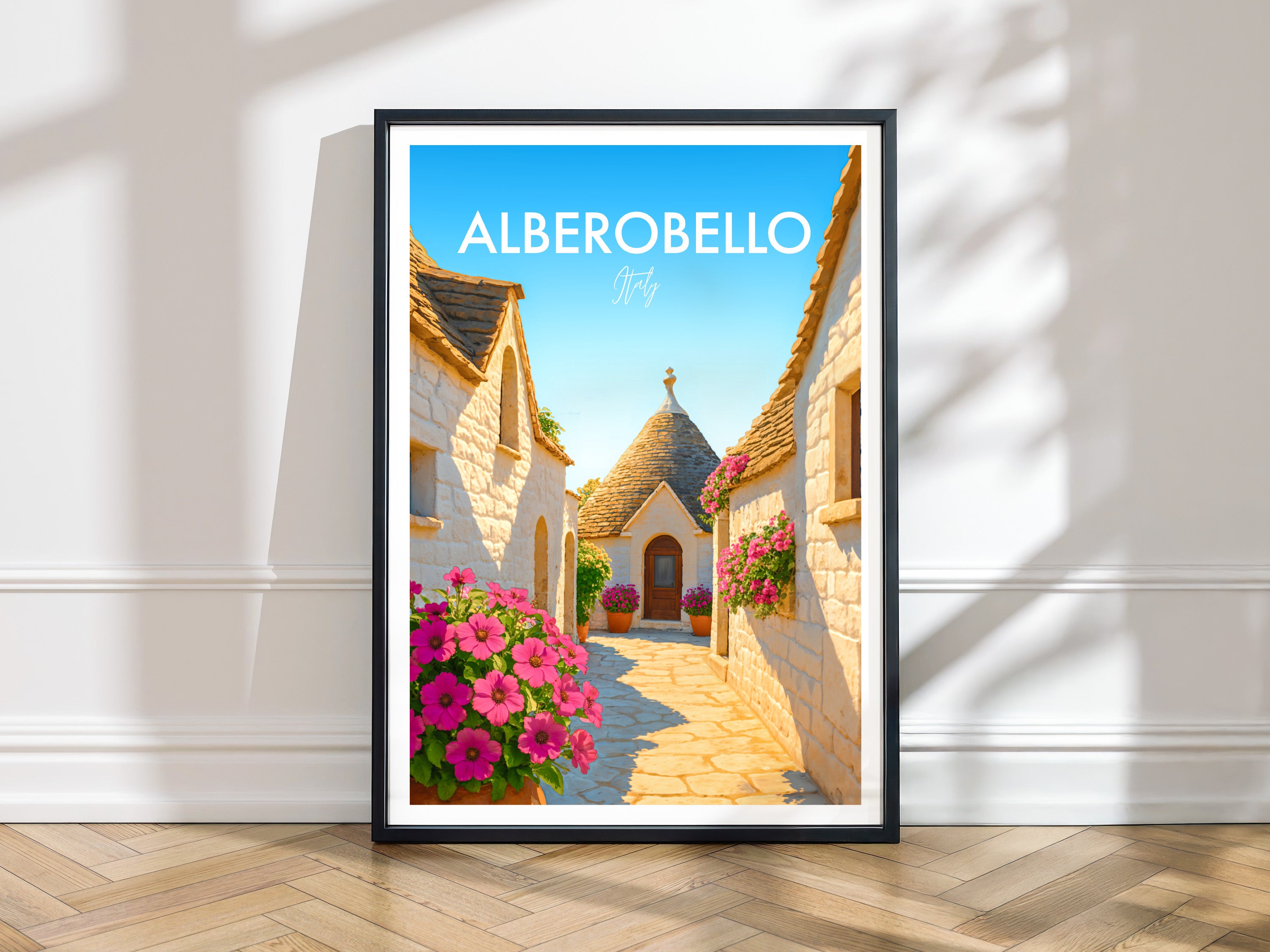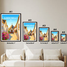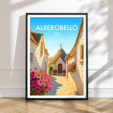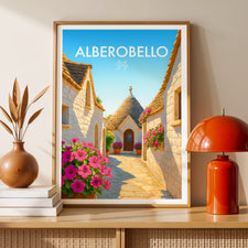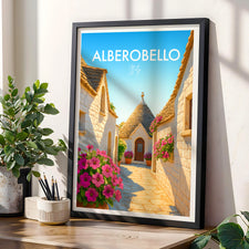 Stroll down iconic trulli-lined streets of Alberobello in this beautiful poster. The unique cone-shaped houses are beautifully captured, showcasing this UNESCO heritage site.