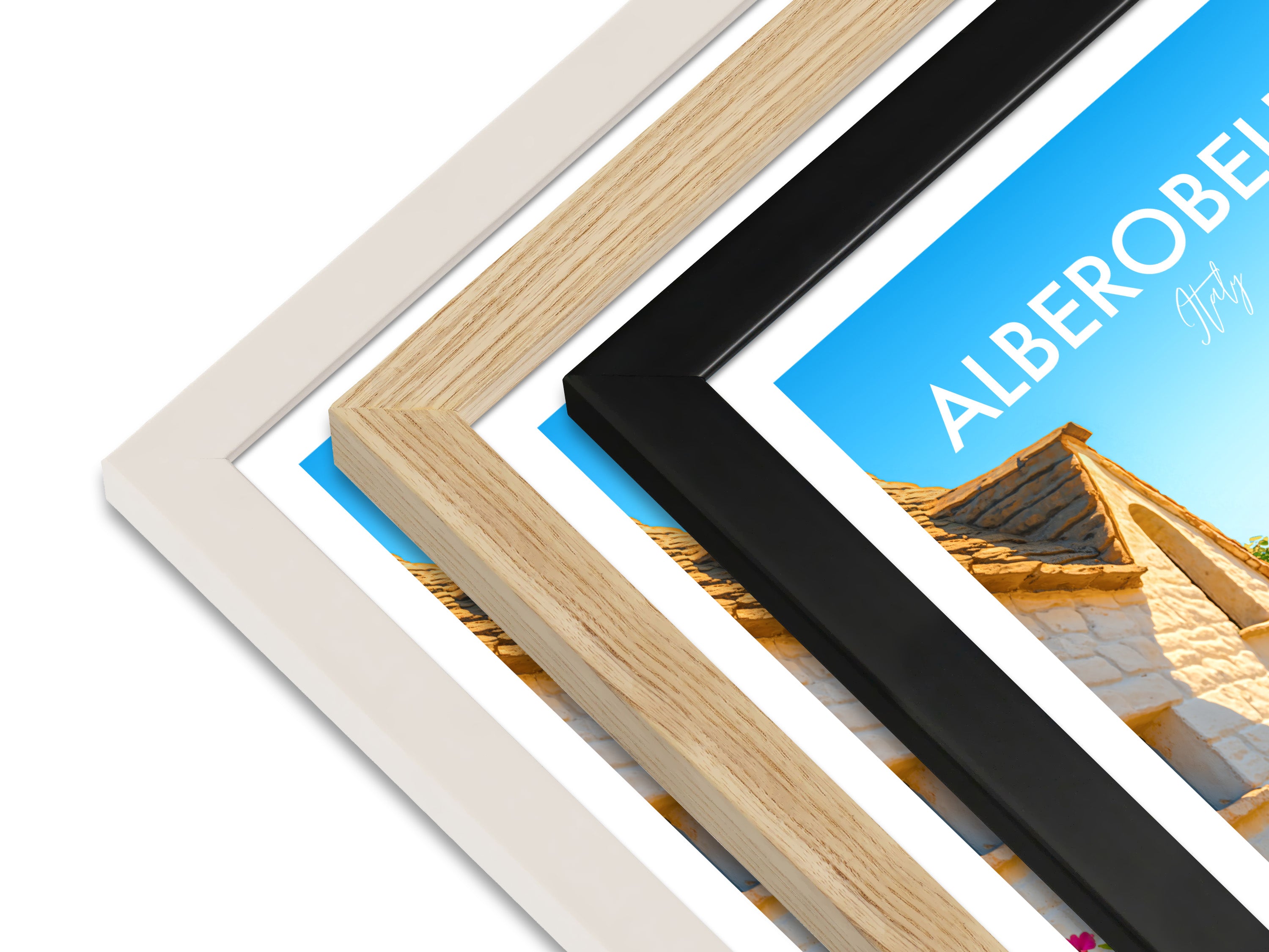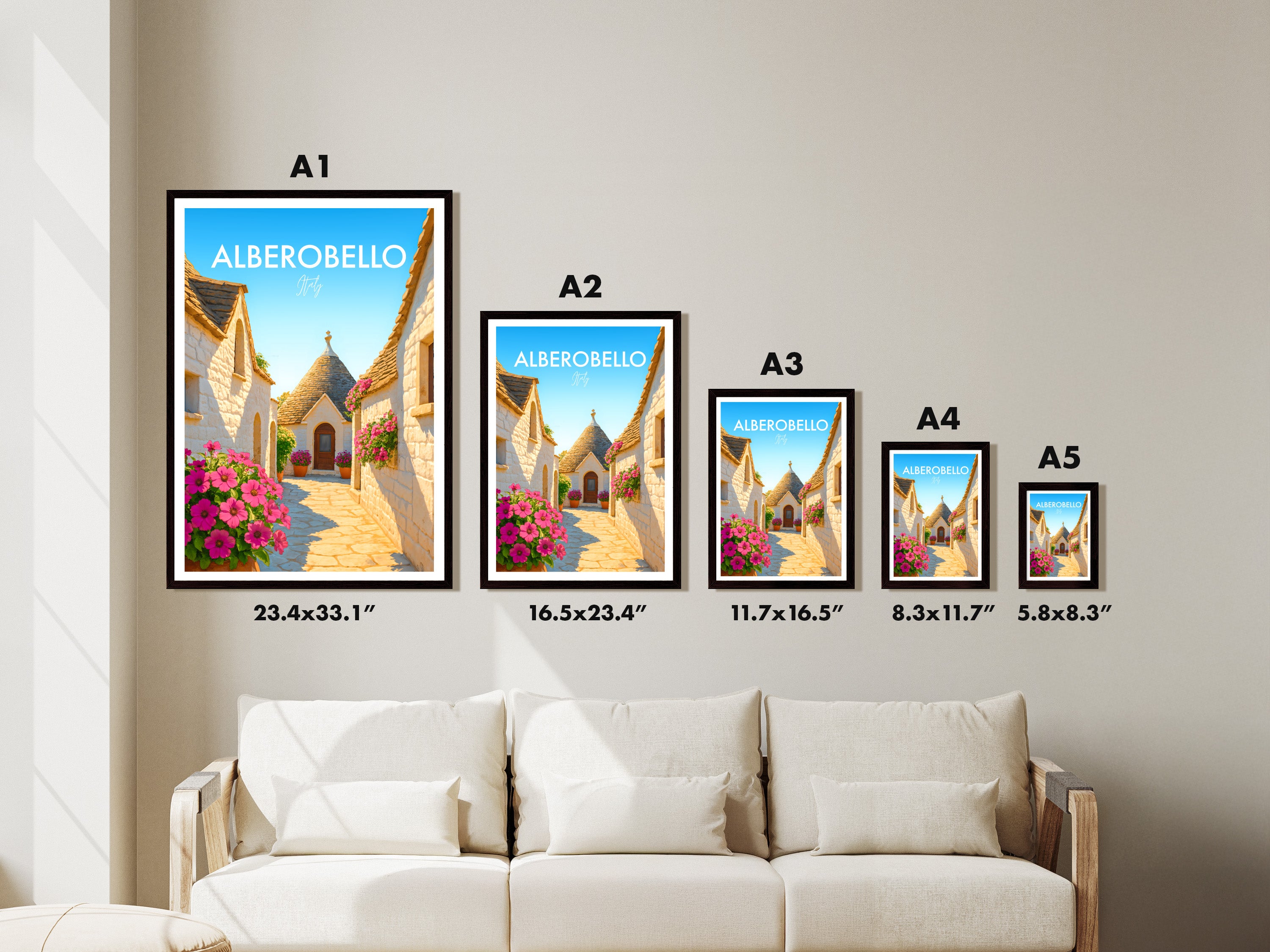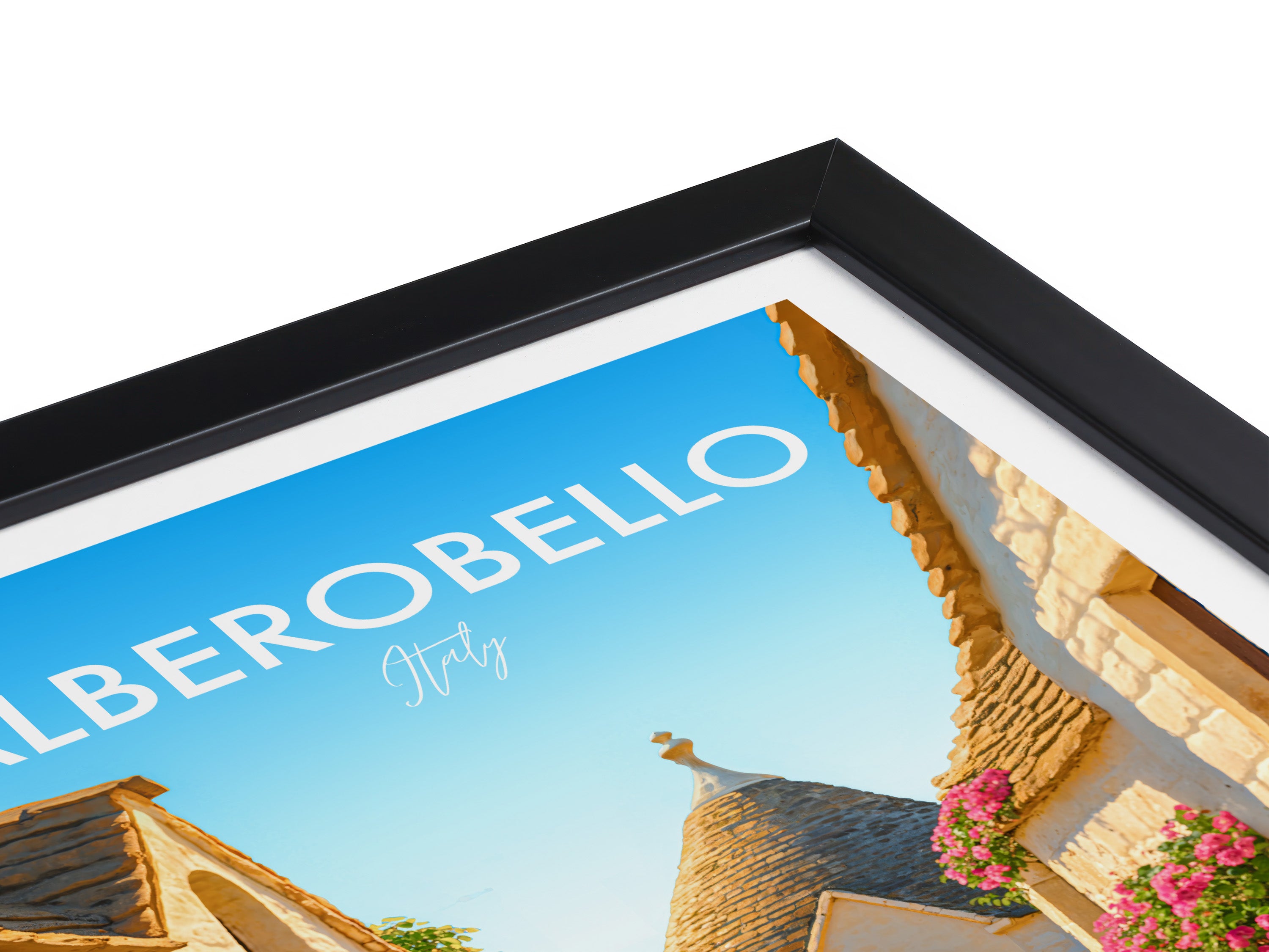 Stroll down iconic trulli-lined streets of Alberobello in this beautiful poster. The unique cone-shaped houses are beautifully captured, showcasing this UNESCO heritage site.