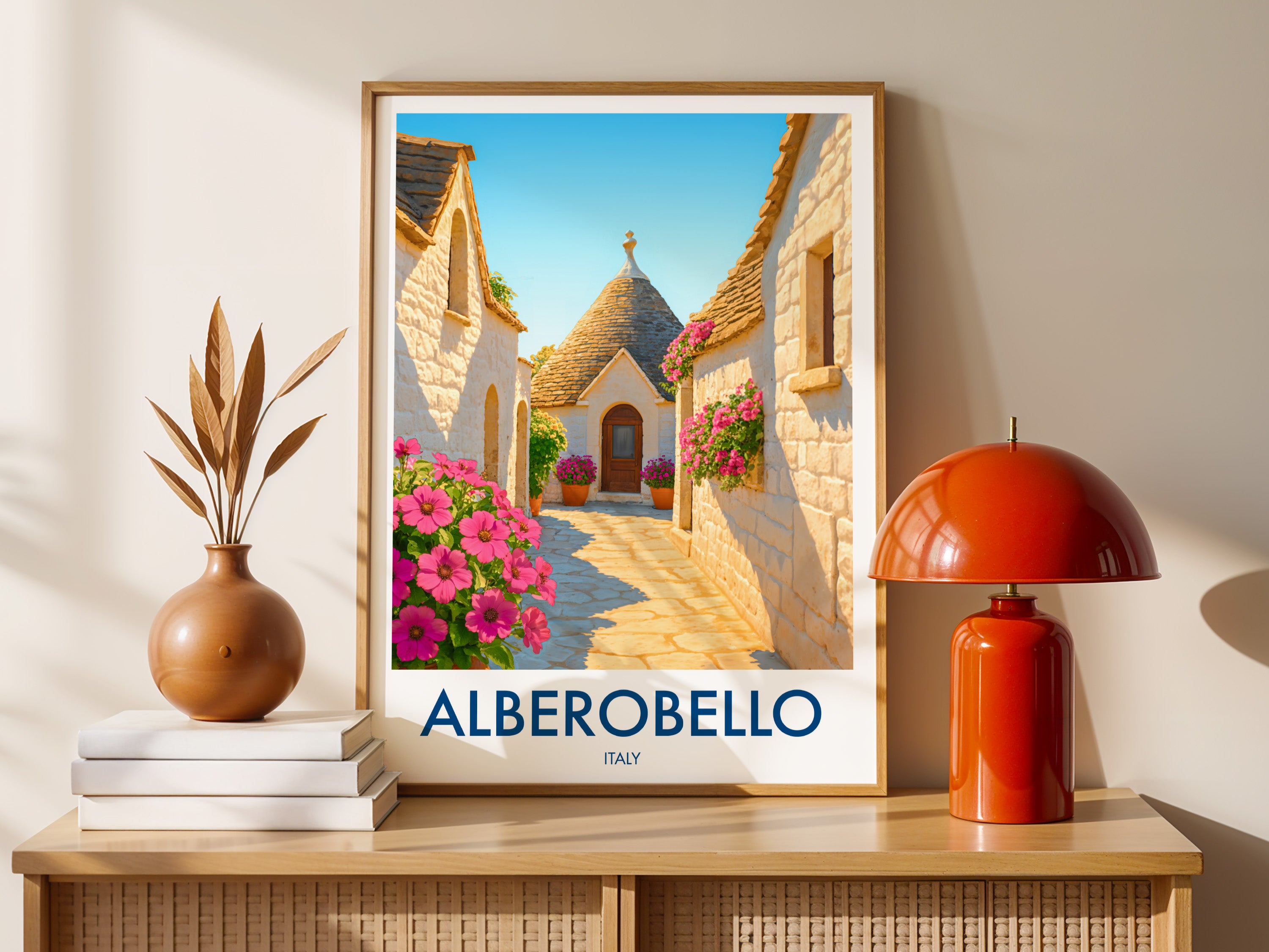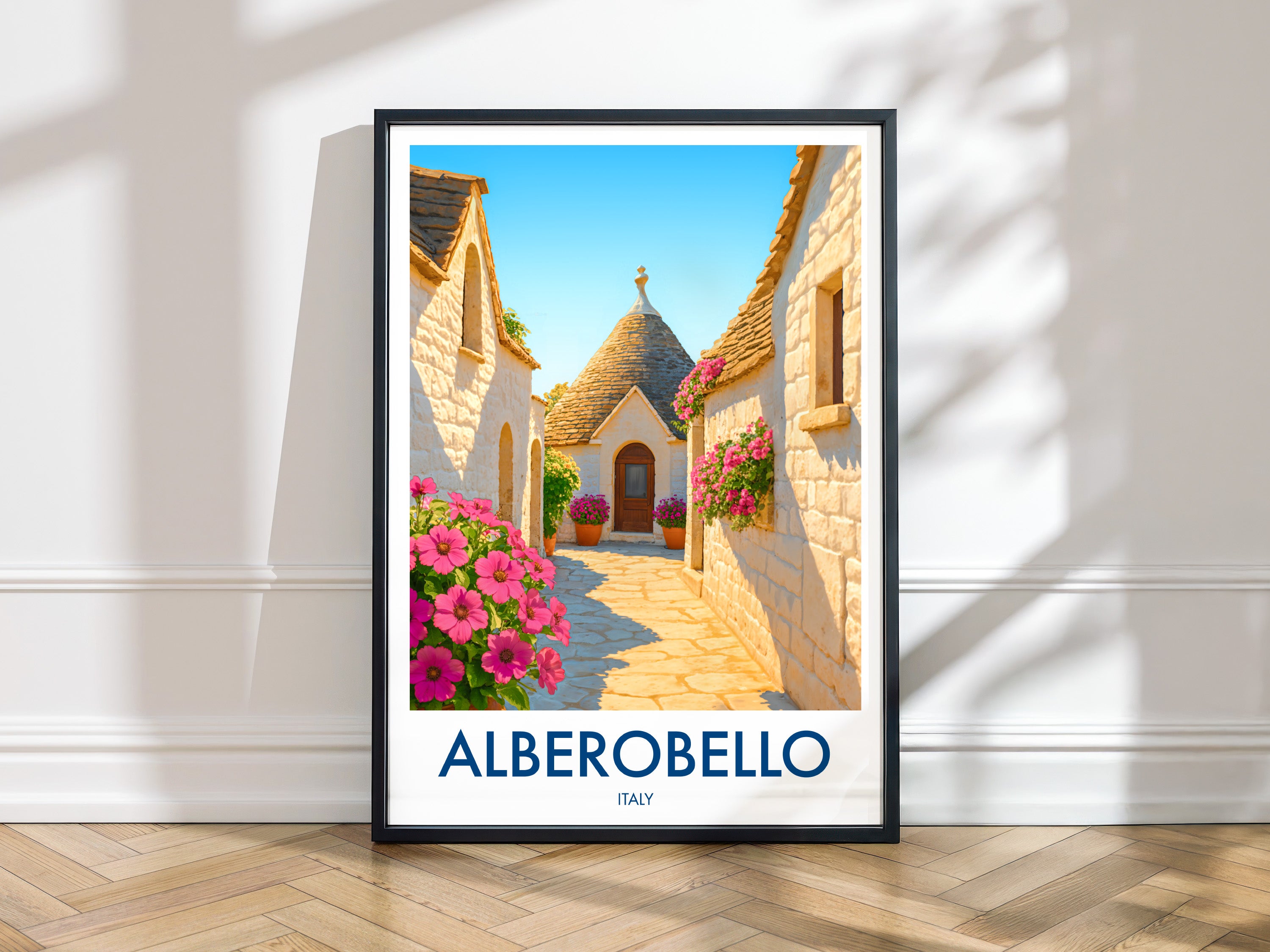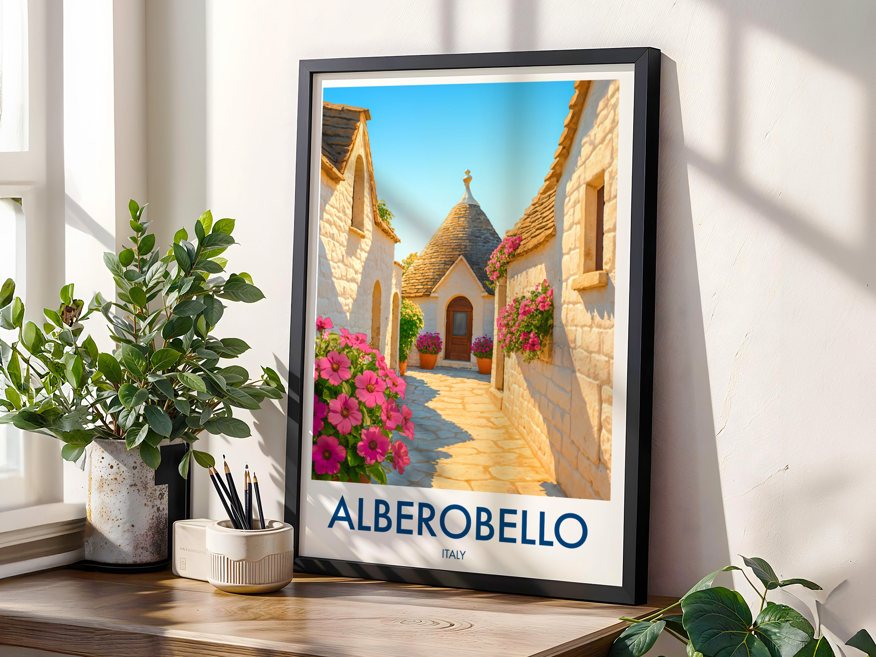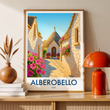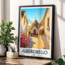 Stroll down iconic trulli-lined streets of Alberobello in this beautiful poster. The unique cone-shaped houses are beautifully captured, showcasing this UNESCO heritage site.