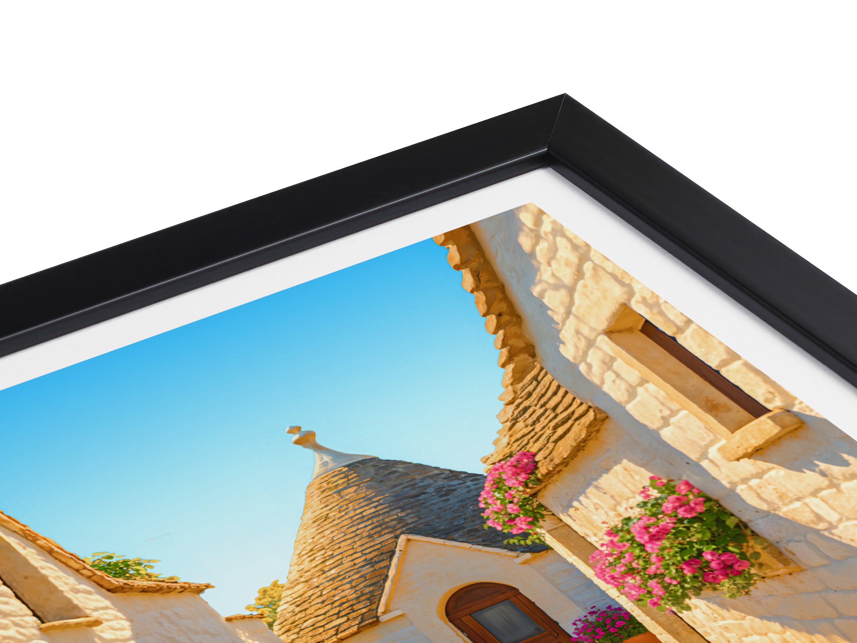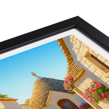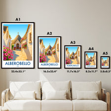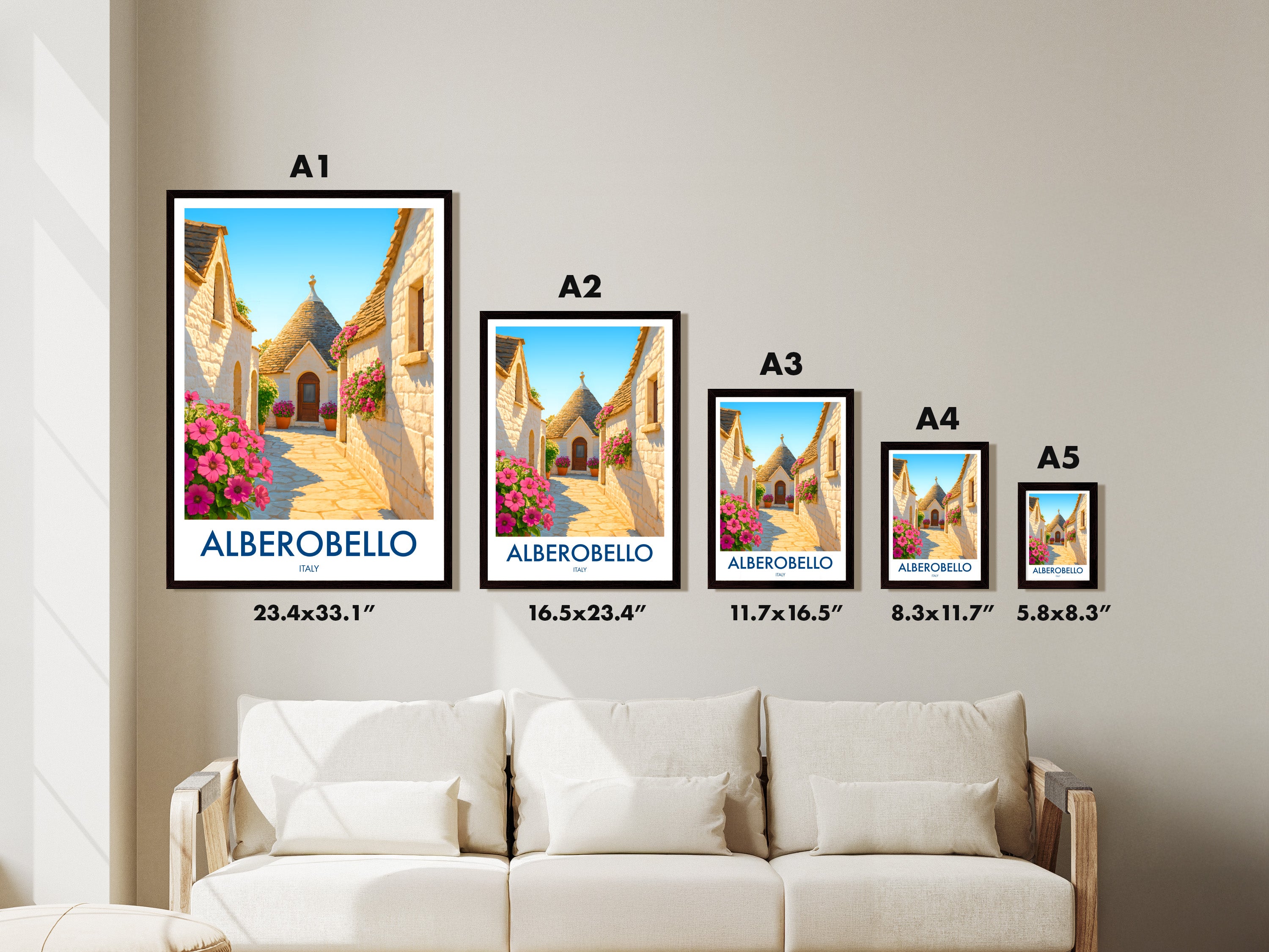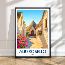 Stroll down iconic trulli-lined streets of Alberobello in this beautiful poster. The unique cone-shaped houses are beautifully captured, showcasing this UNESCO heritage site.