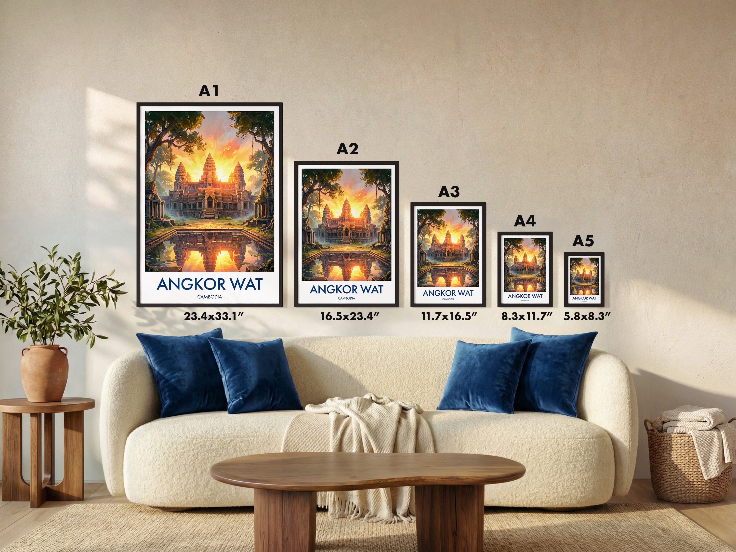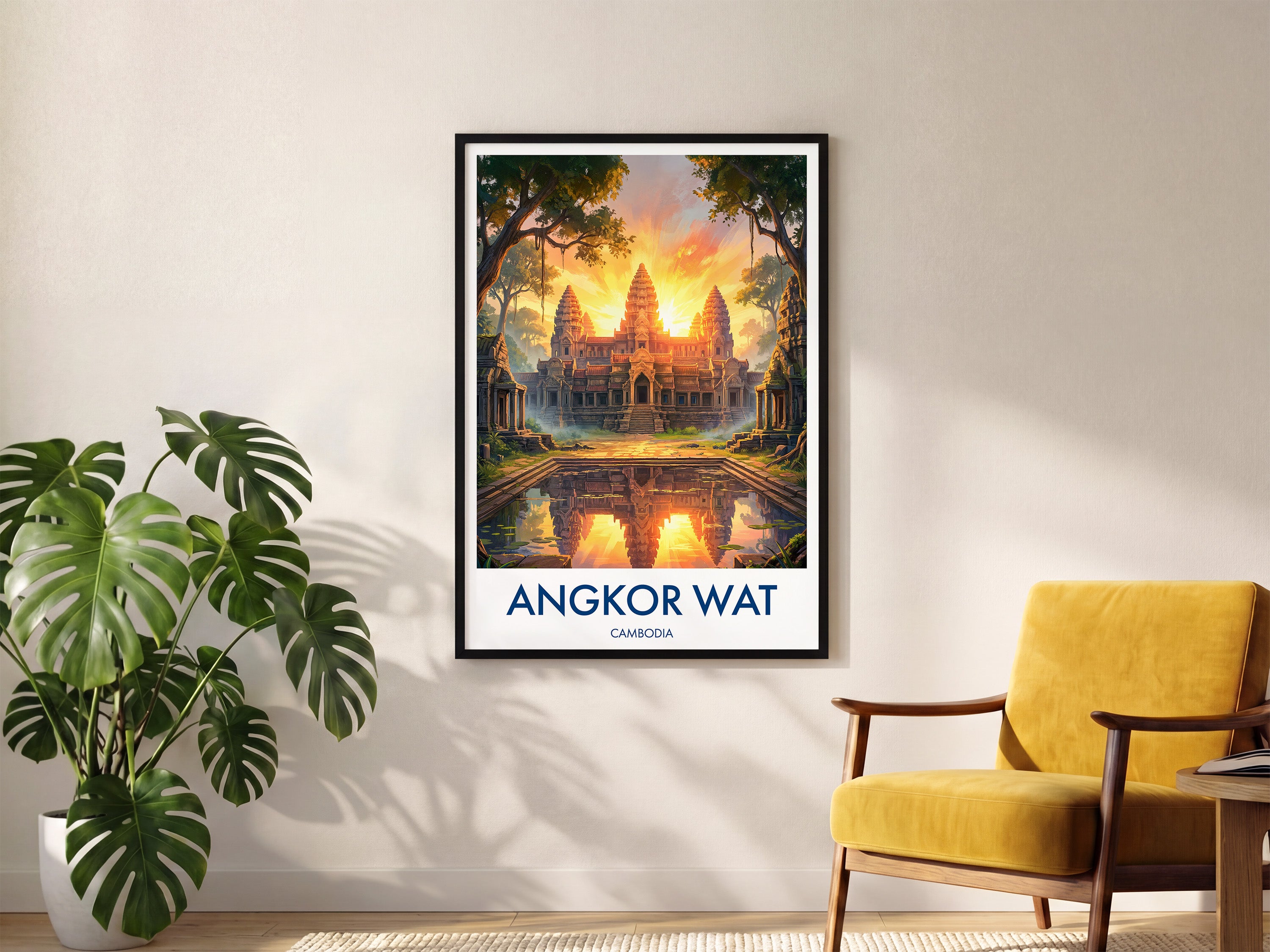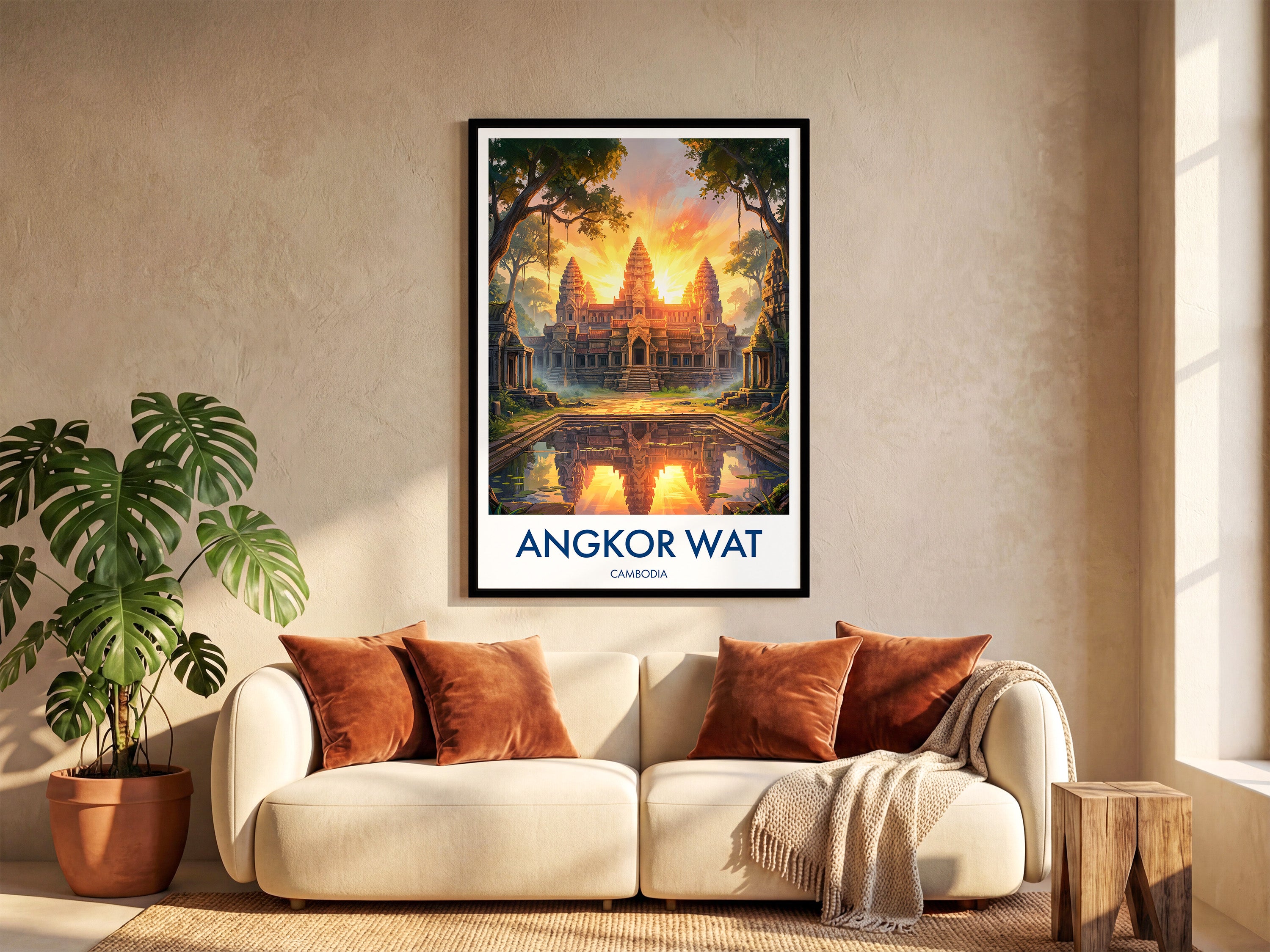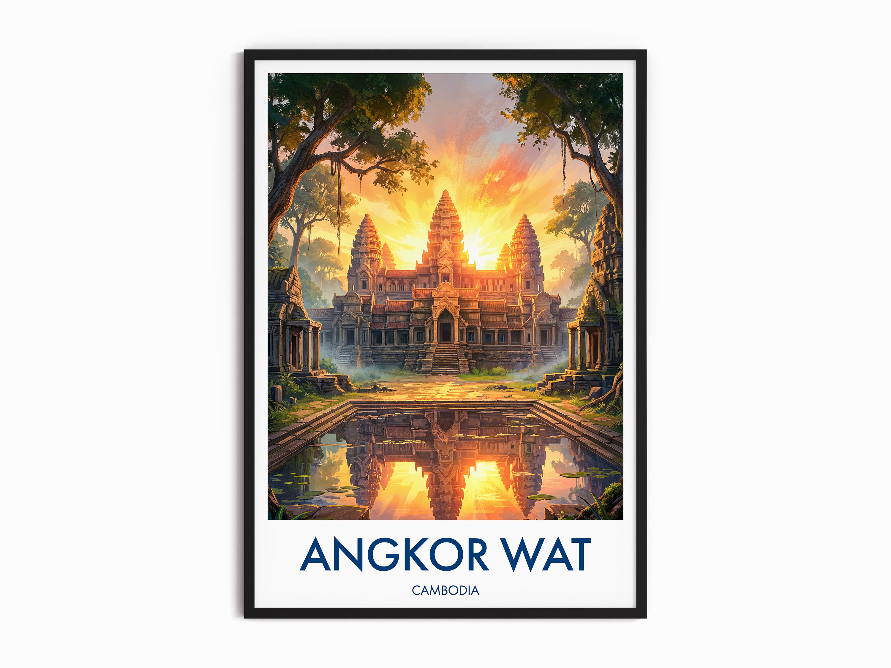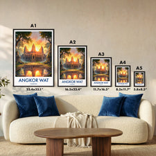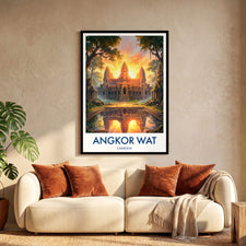 Bring home the charm of Cambodia with this Angkor Wat print, inspired by the iconic Buddhist Temple. This travel poster art beautifully captures the grandeur of one of the world's most visited wonders. Ideal as wall art decor for travellers, this unique Angkor Wat travel print makes a perfect gift or statement piece for your living space.