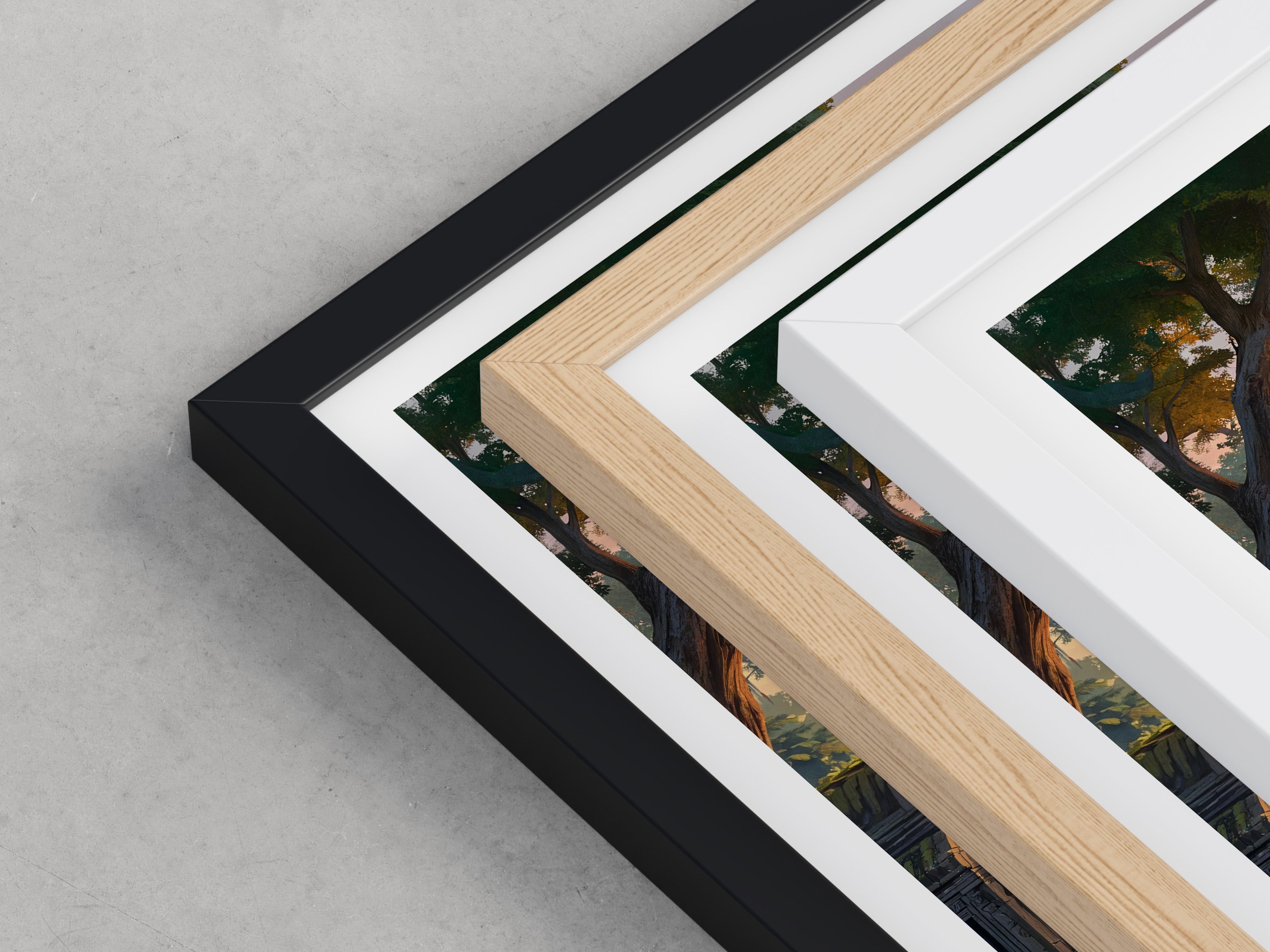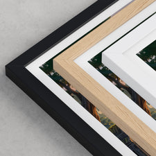 Framed options use sustainably sourced wooden frames in black, white, or natural wood, ready to hang.