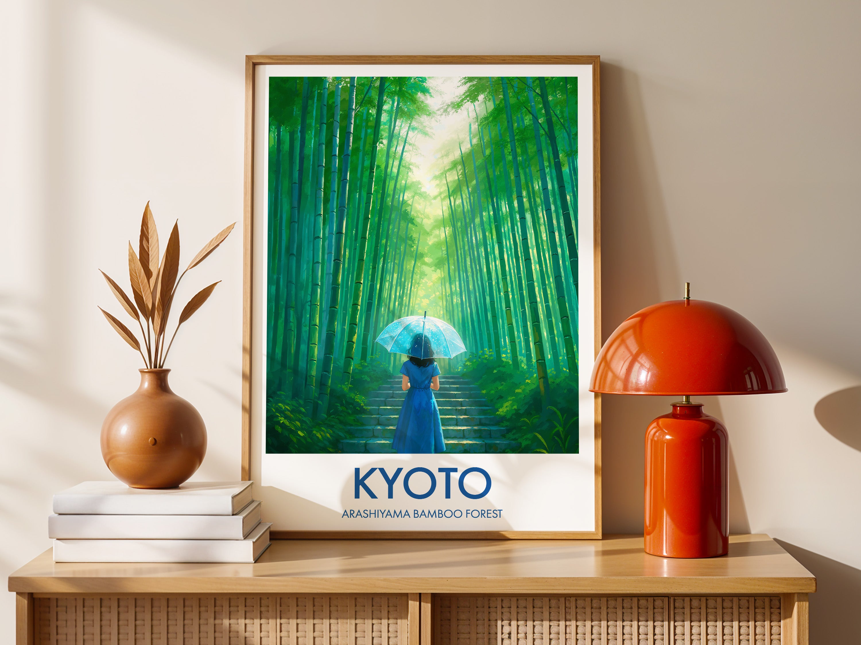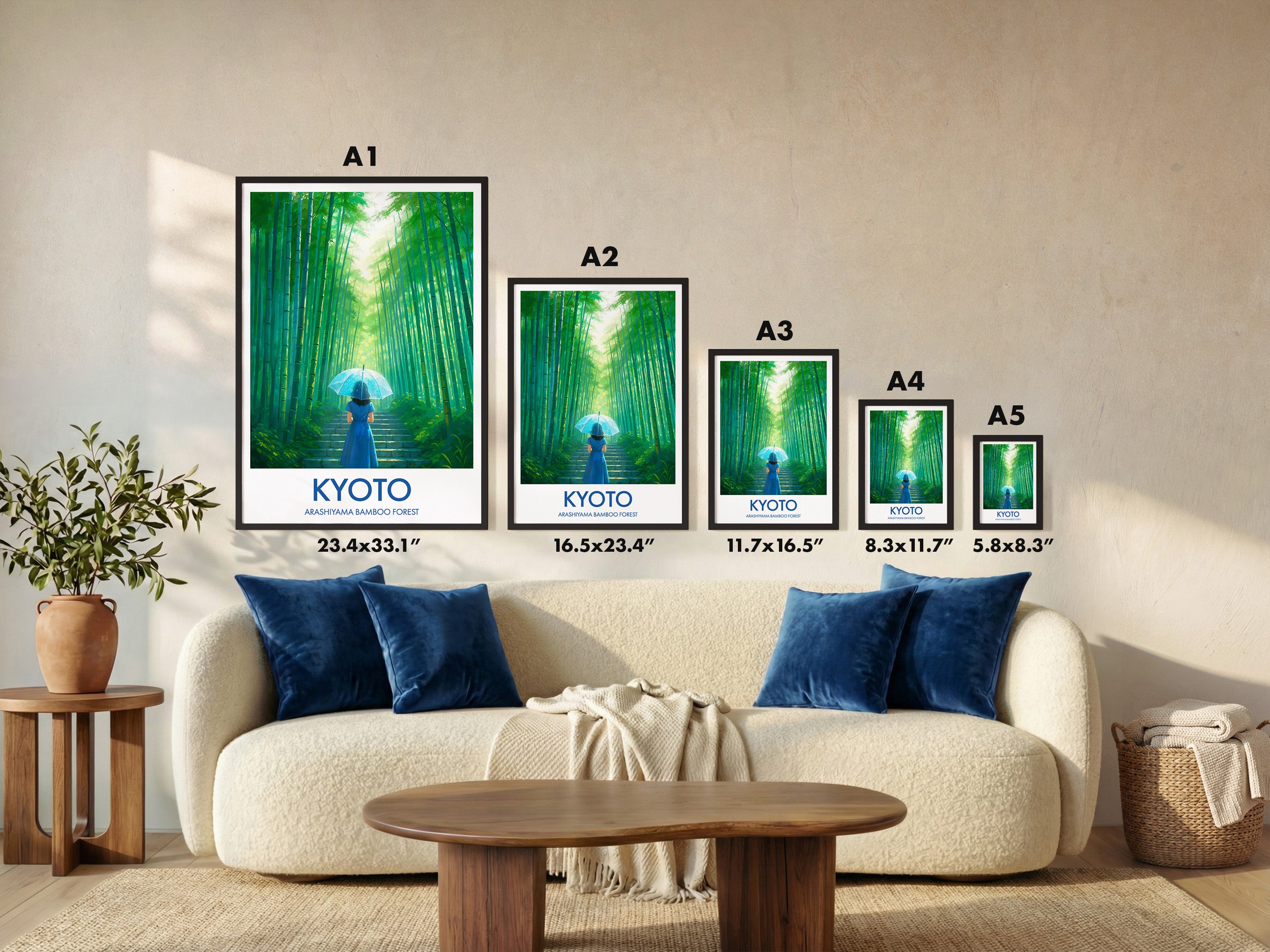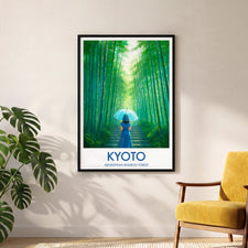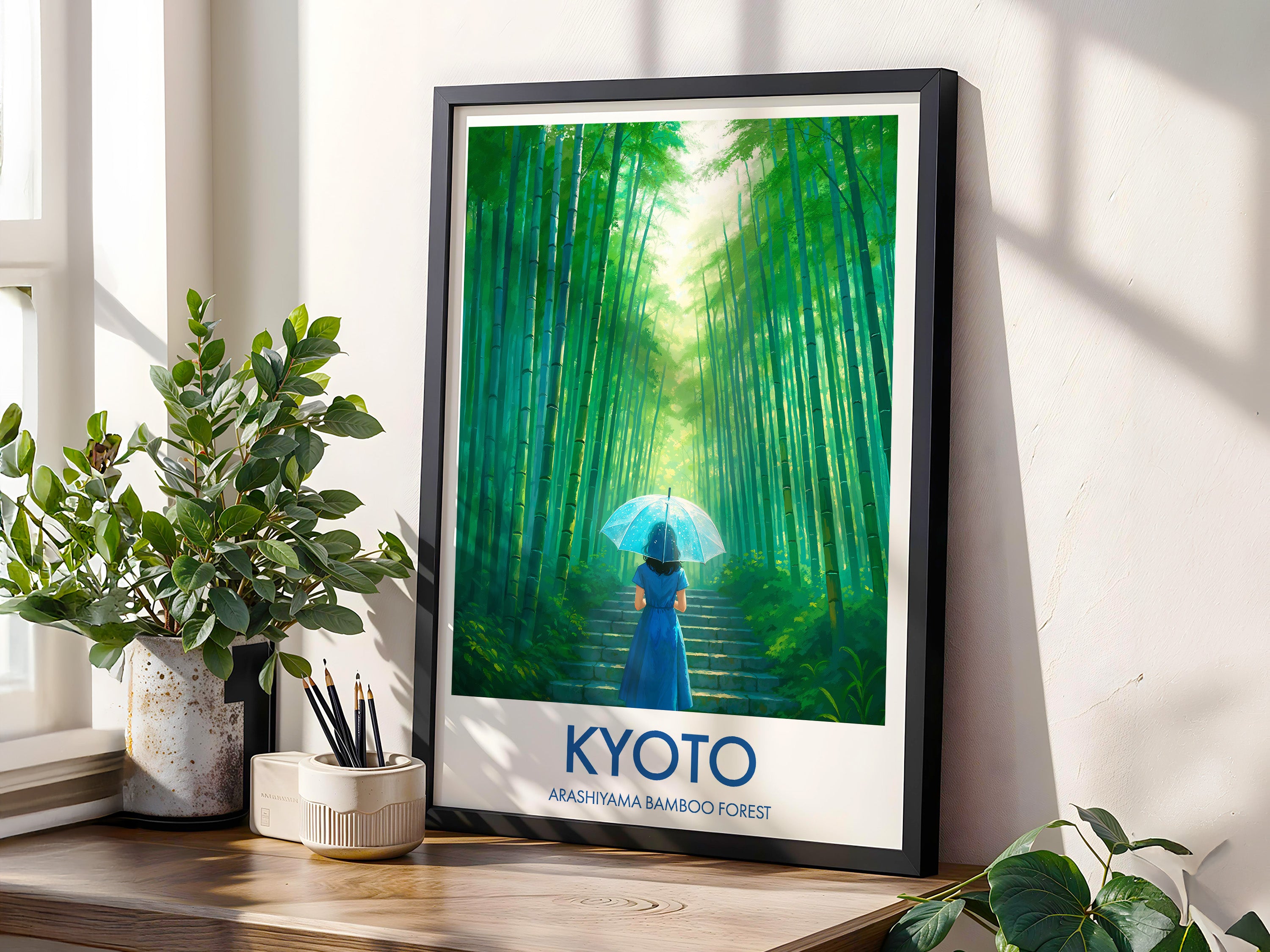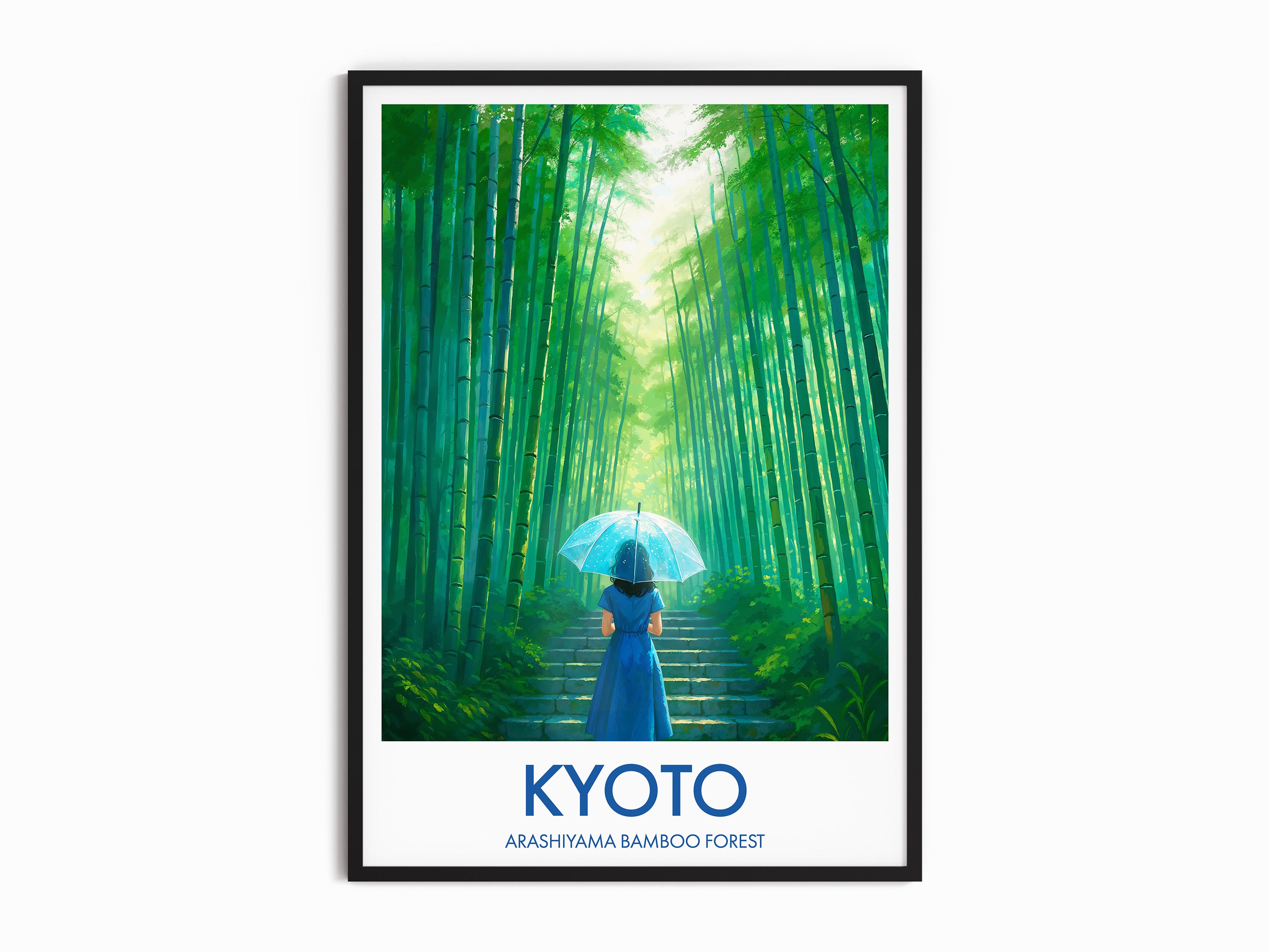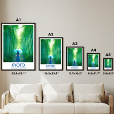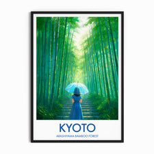 Explore the serenity of Kyoto with this stunning print of the Arashiyama Bamboo Forest. Depicting tranquil greens and sunlit paths, it's perfect for adding a touch of calm to any space.