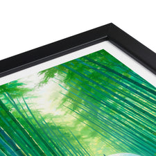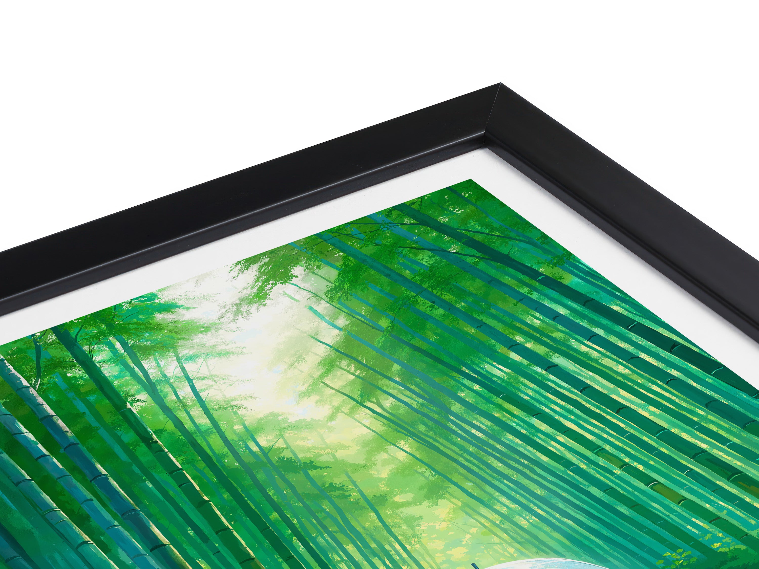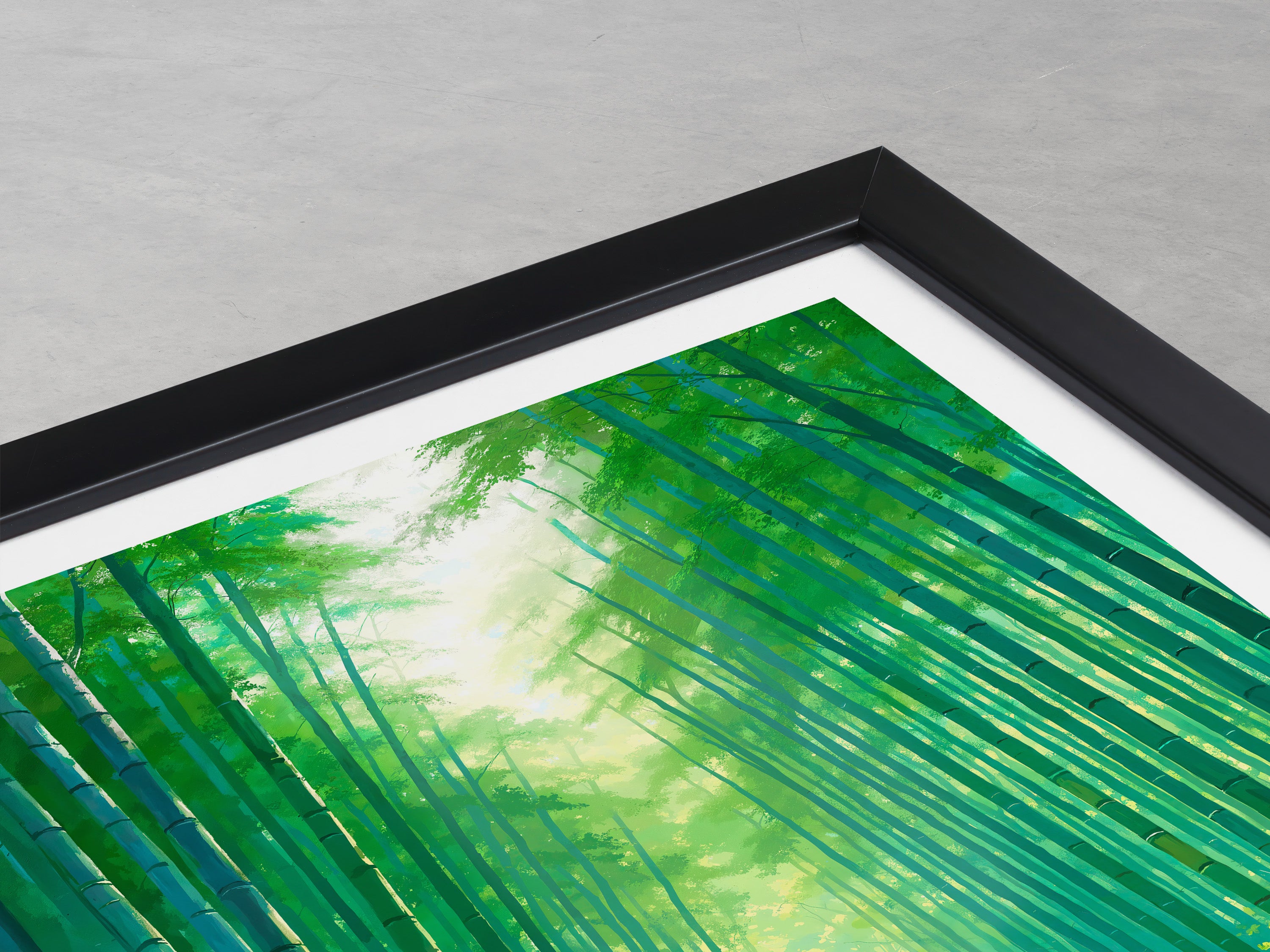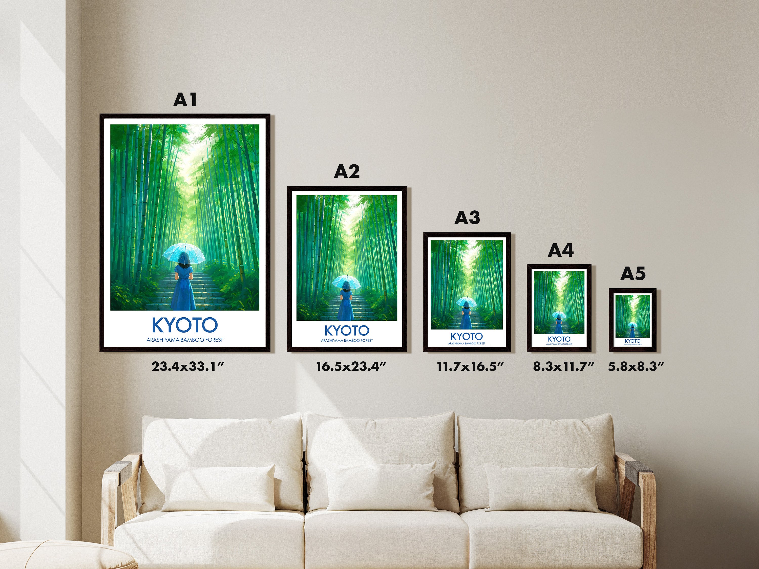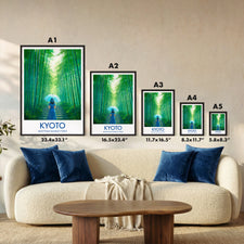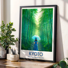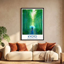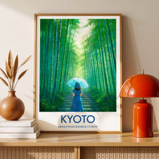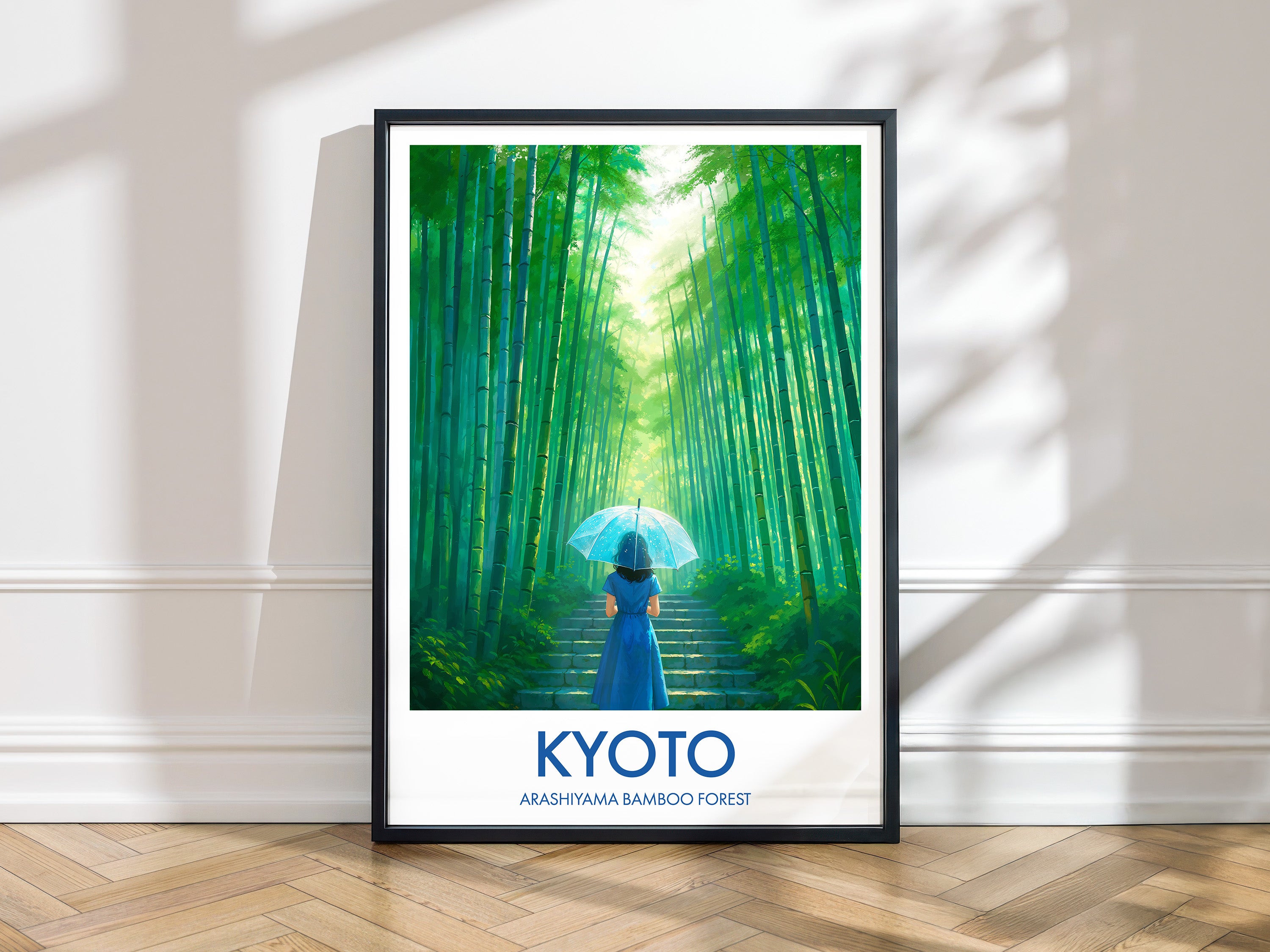 Explore the serenity of Kyoto with this stunning print of the Arashiyama Bamboo Forest. Depicting tranquil greens and sunlit paths, it's perfect for adding a touch of calm to any space.