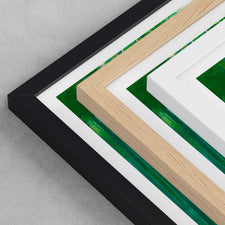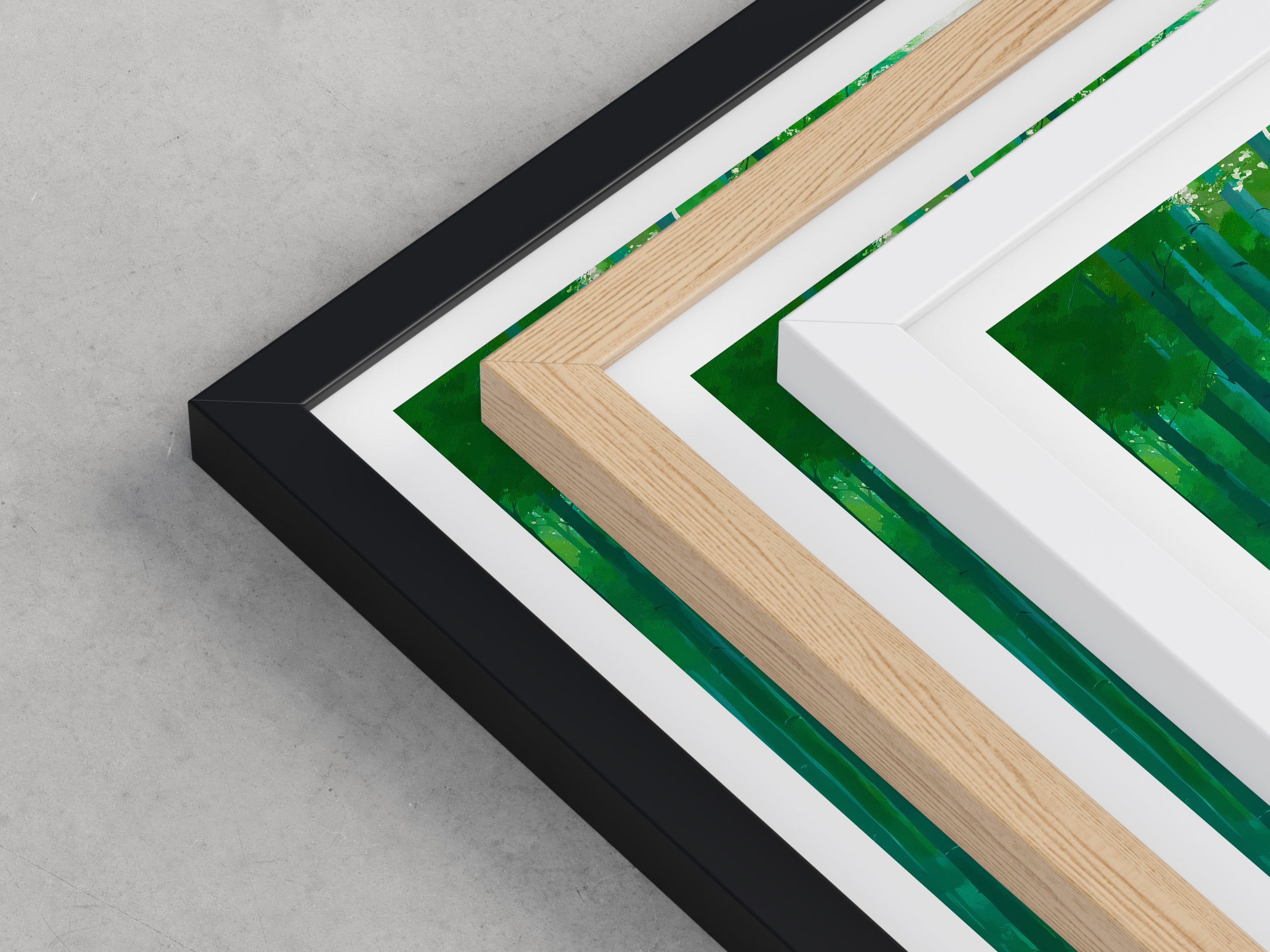 Framed options use sustainably sourced wooden frames in black, white, or natural wood, ready to hang.