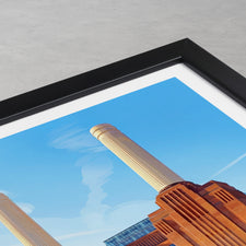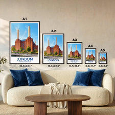 Celebrate London’s iconic architecture with this traditional travel poster of Battersea Power Station. This artwork pays homage to the historic power station's distinctive chimneys and imposing brick facade. Perfect for lovers of British engineering and London art, this print captures the essence of urban restoration and landmark preservation. Add a piece of London's rich history to your walls with this design.