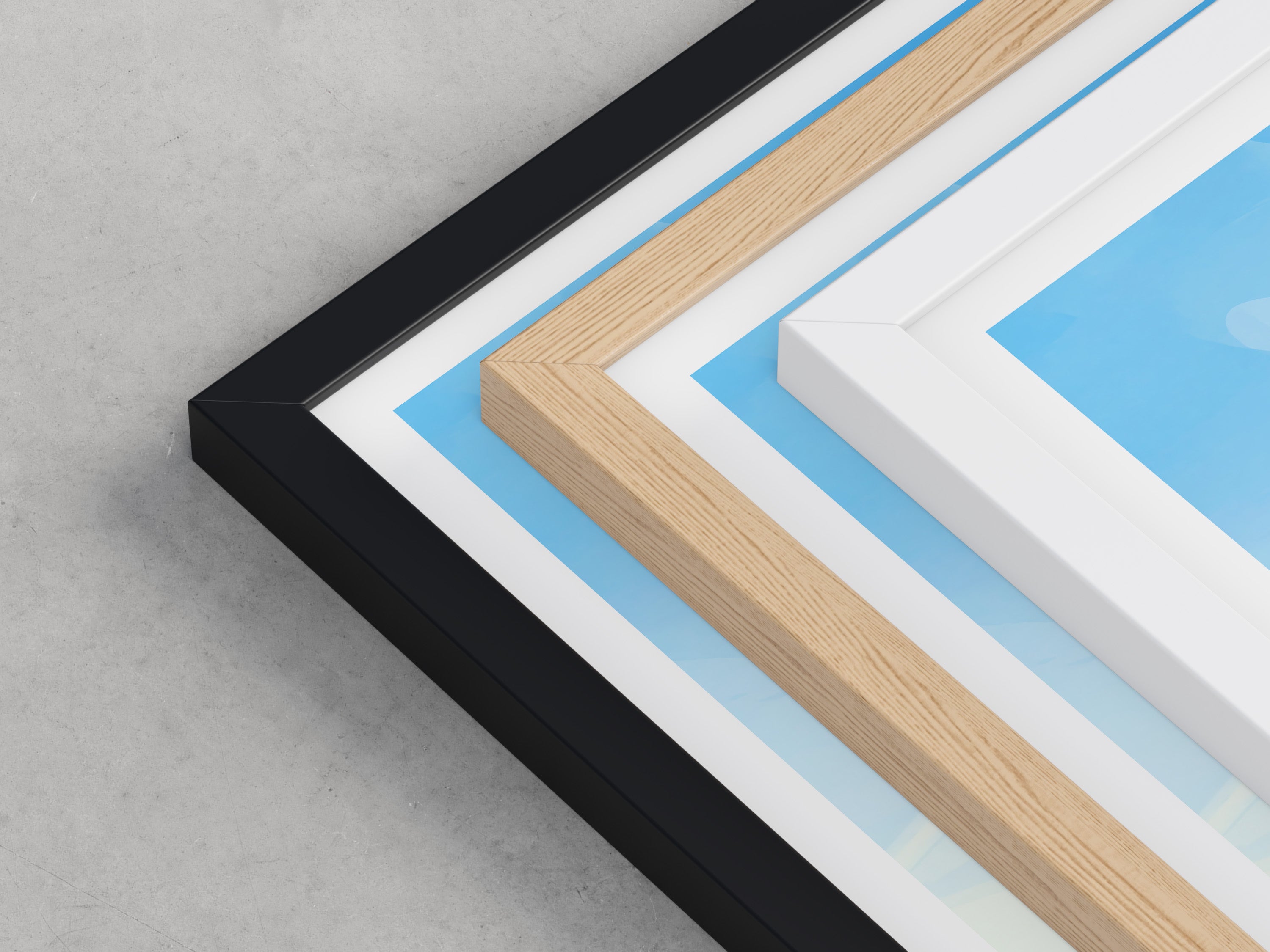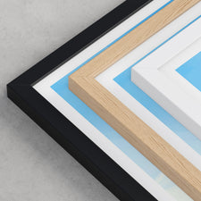 Framed options use sustainably sourced wooden frames in black, white, or natural wood, ready to hang.