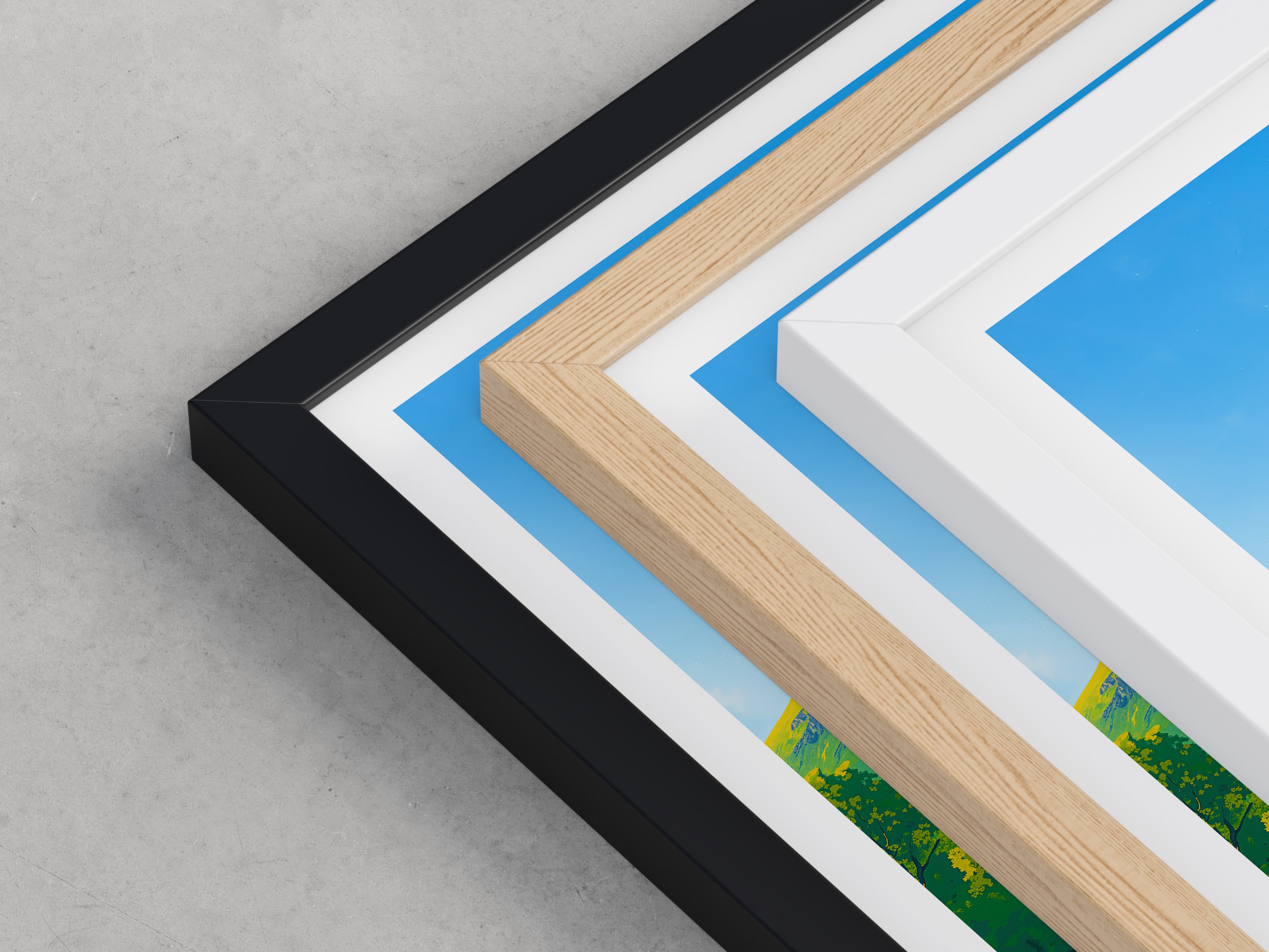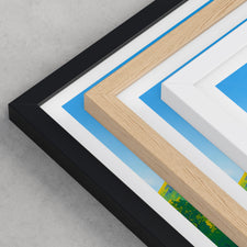 Framed options use sustainably sourced wooden frames in black, white, or natural wood, ready to hang.