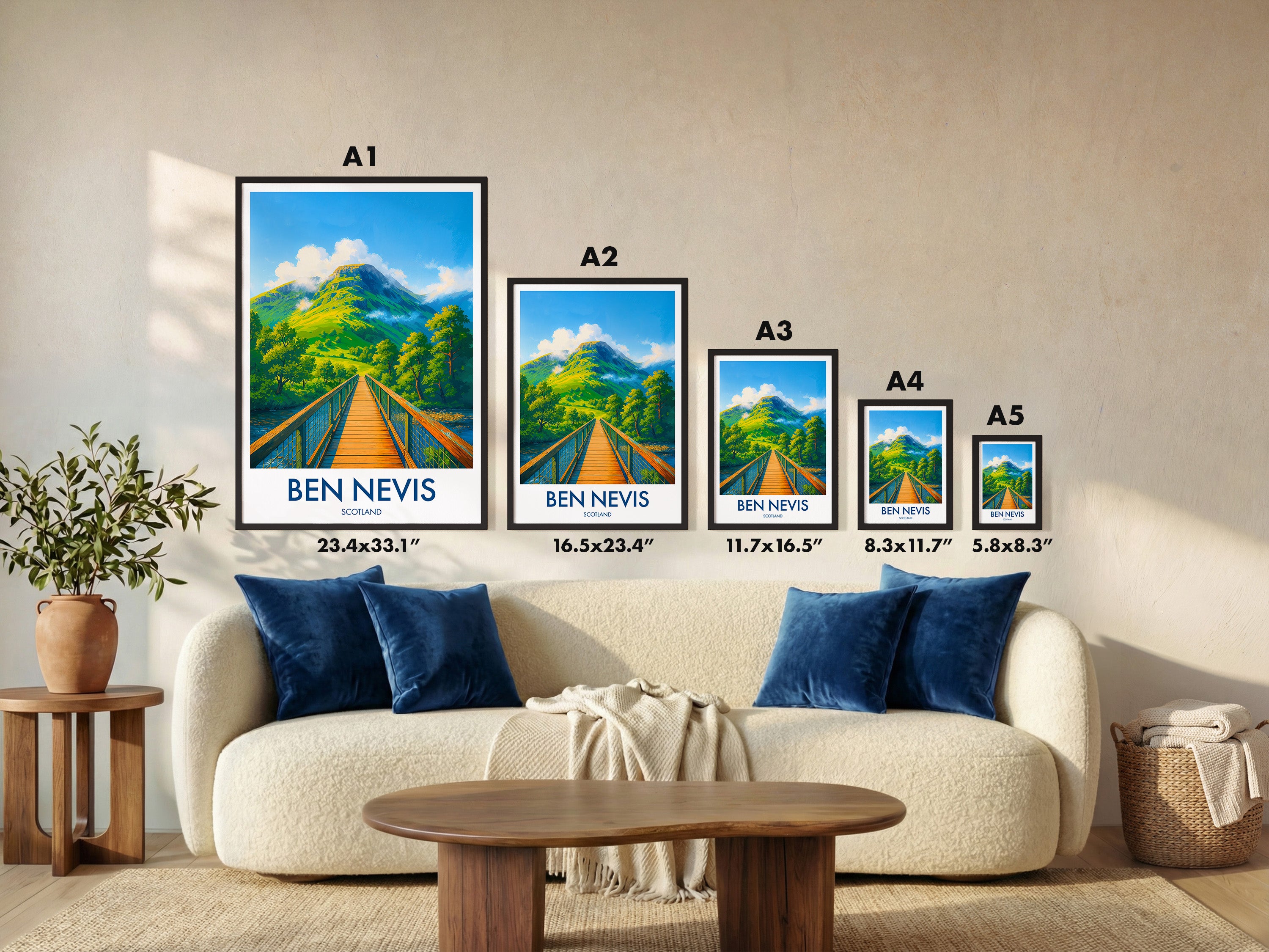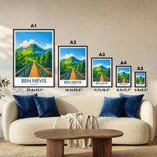 Admire Ben Nevis, Scotland's and the UK's highest peak, through this striking illustrated poster. Perfect for nature enthusiasts and lovers of Scotland's spectacular mountainous landscapes.