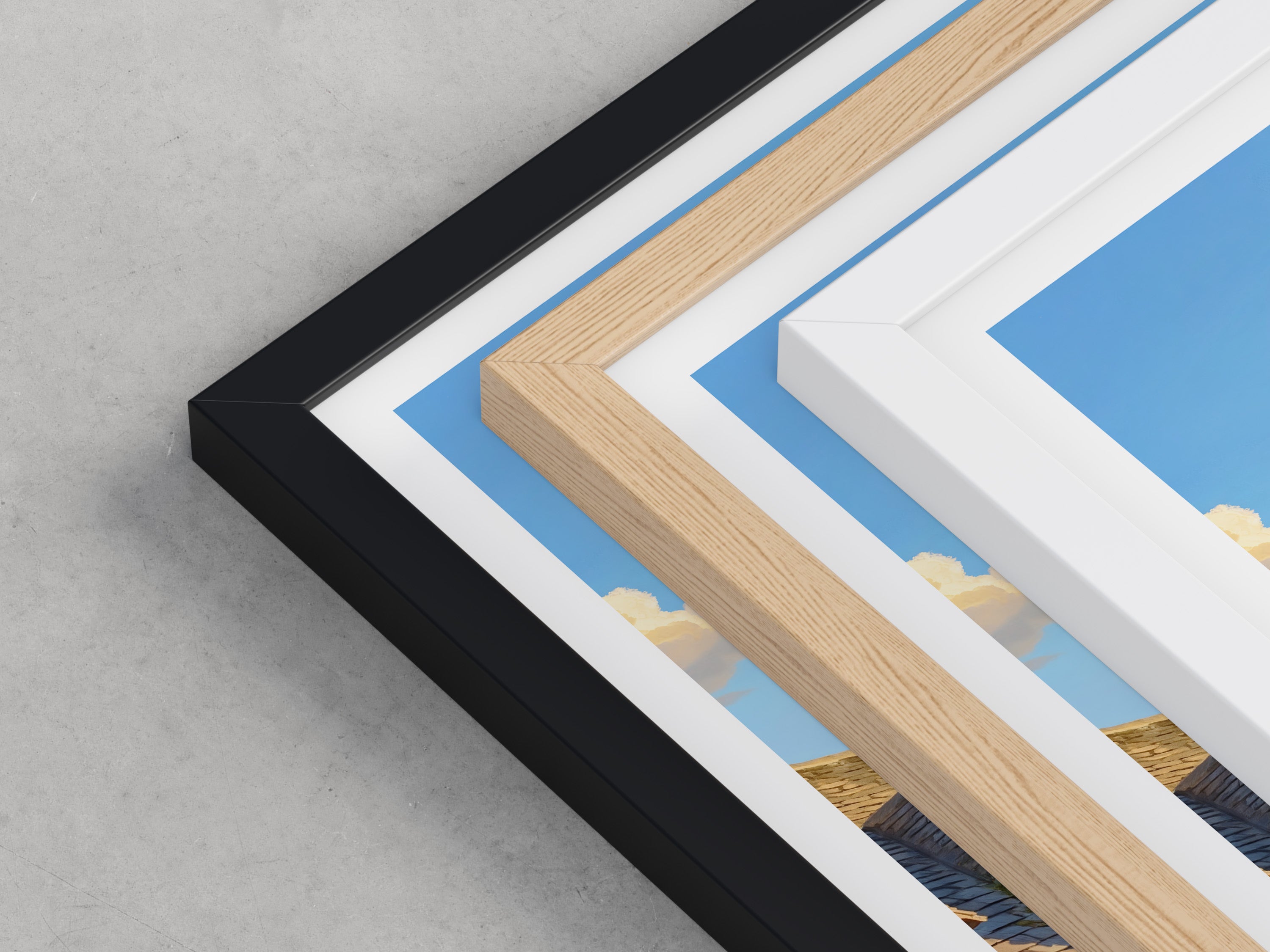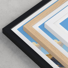 Framed options use sustainably sourced wooden frames in black, white, or natural wood, ready to hang.