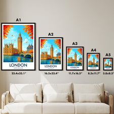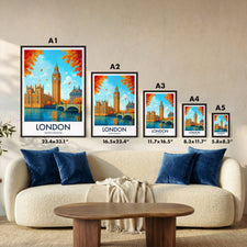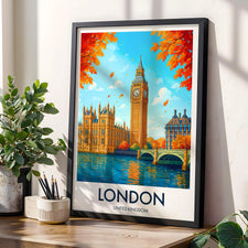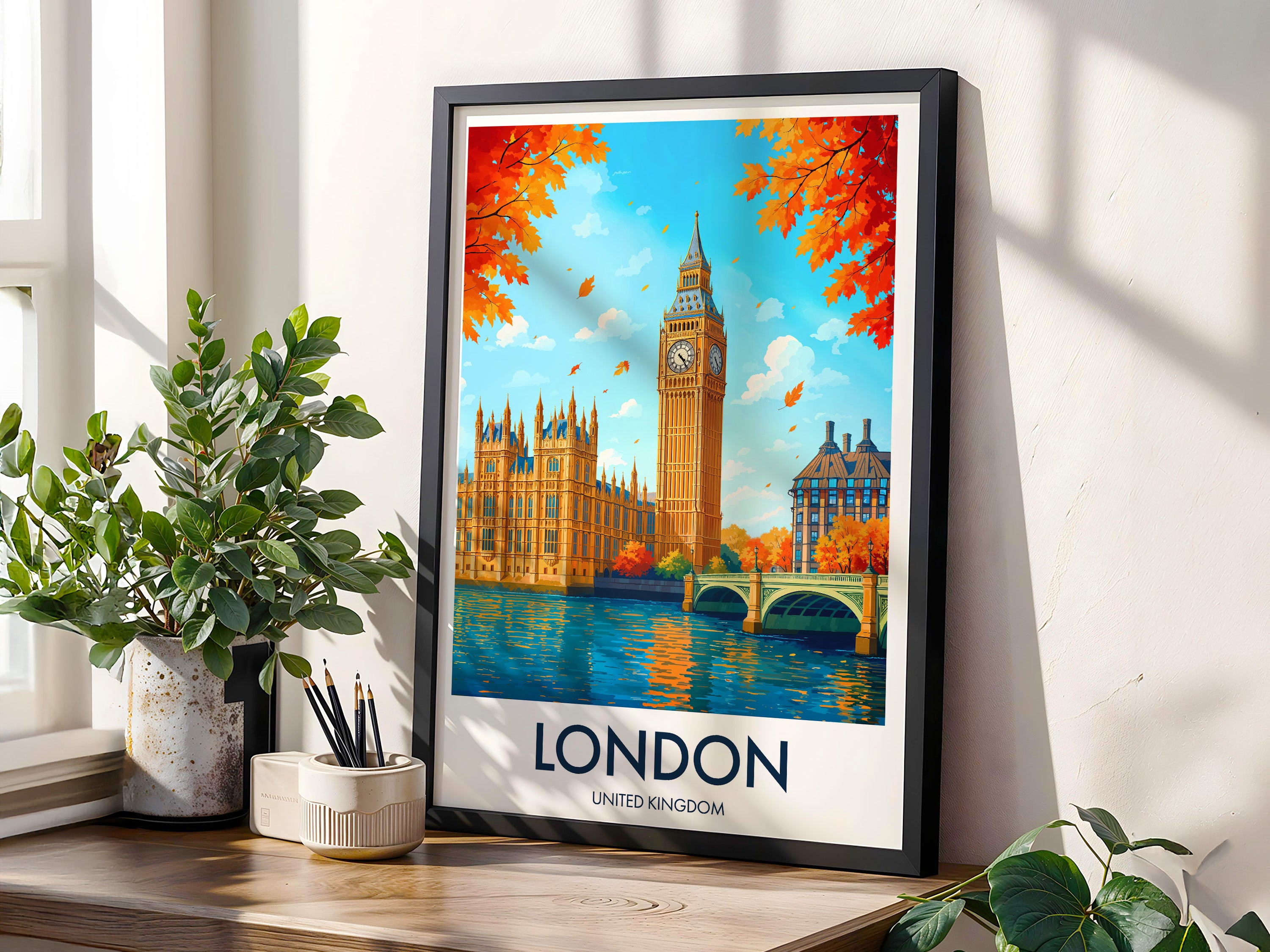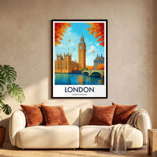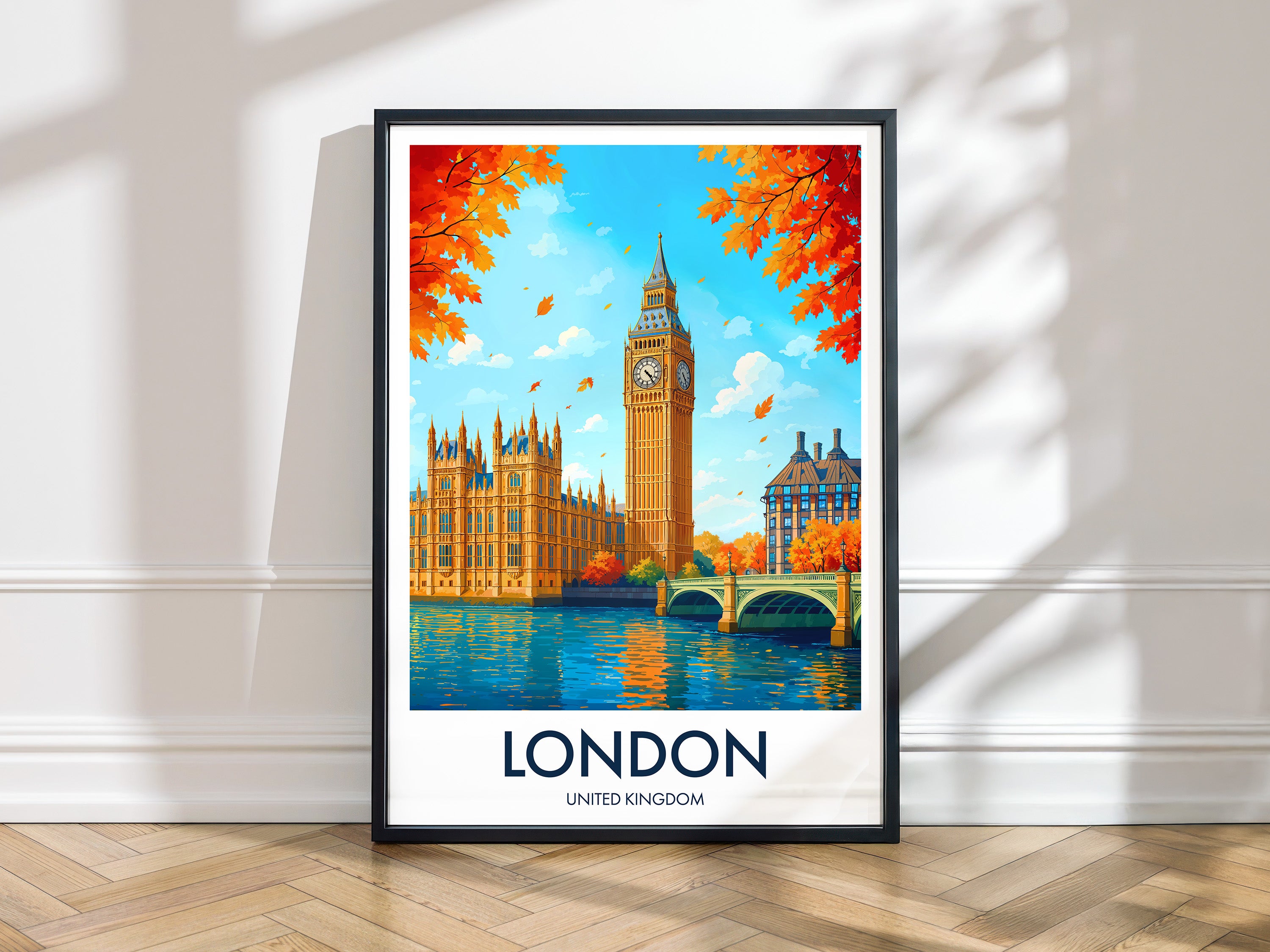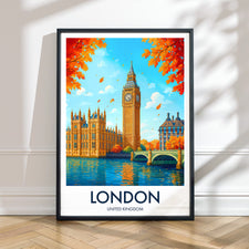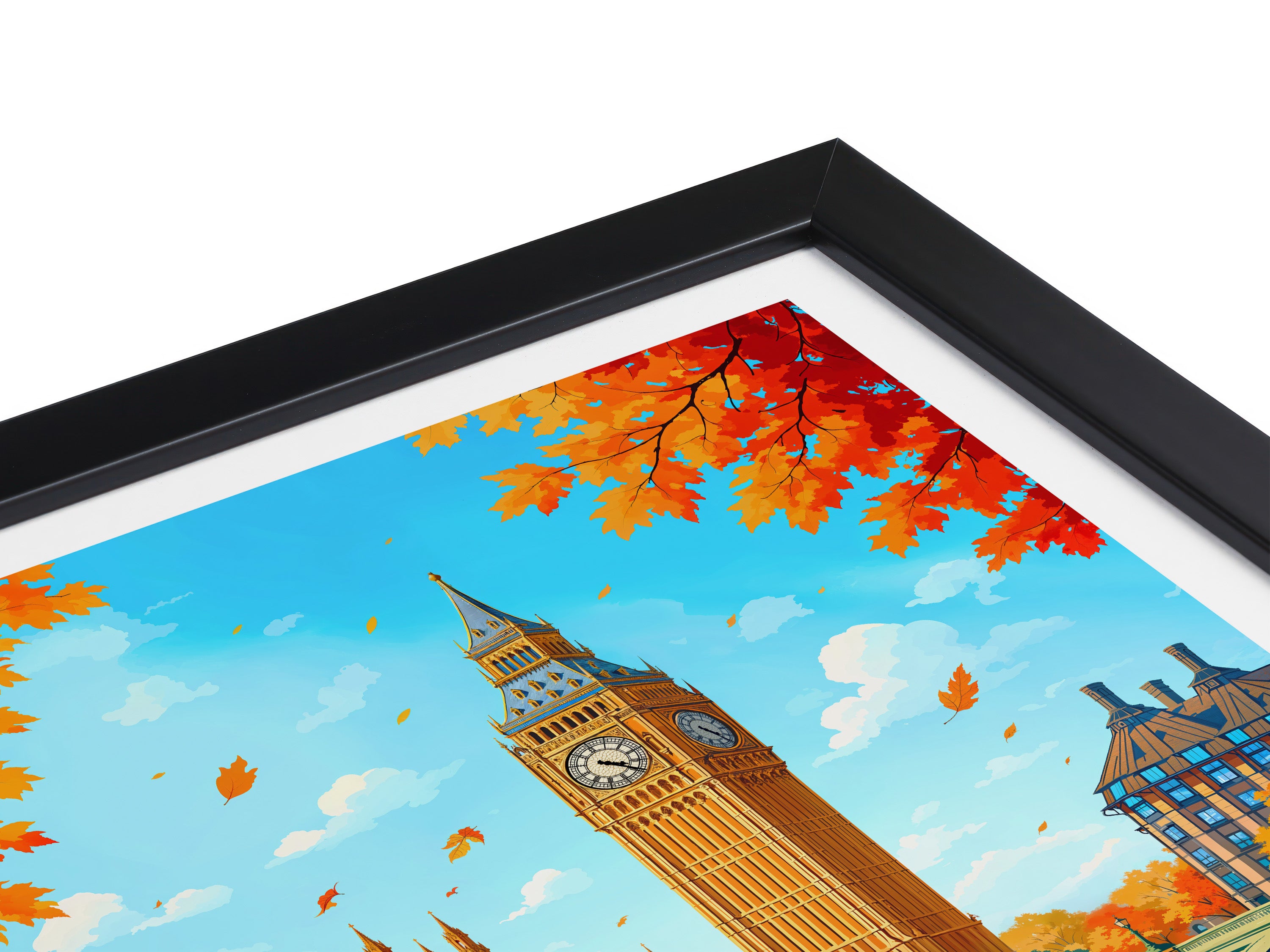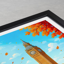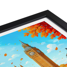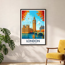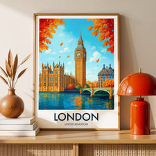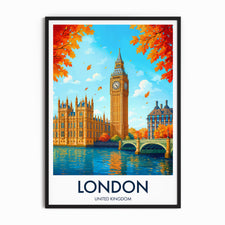 Capture the essence of London with this vibrant Big Ben print. Featuring the iconic Westminster landmark and a vivid autumn backdrop, it's a perfect representation of London's timeless charm and beauty.
