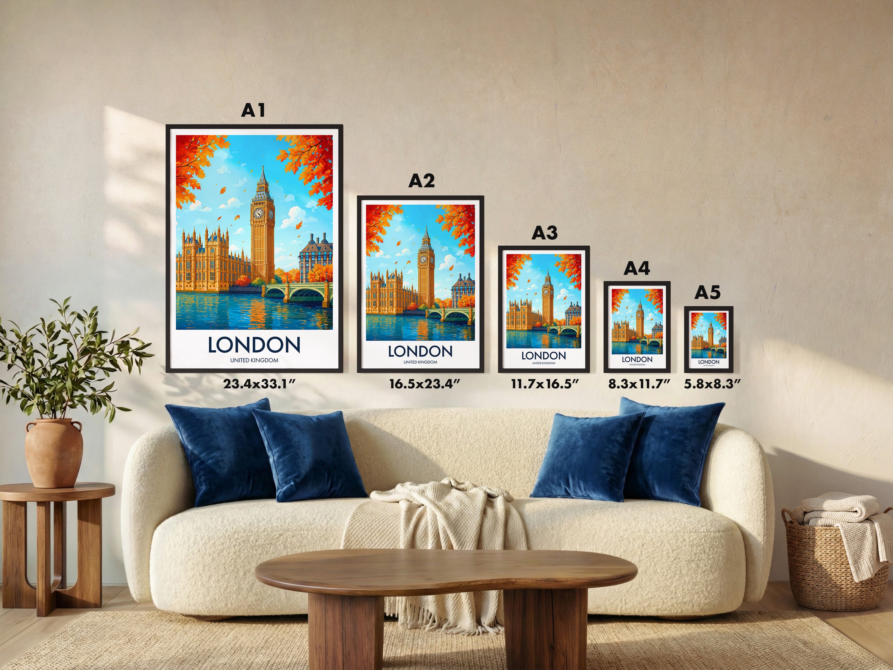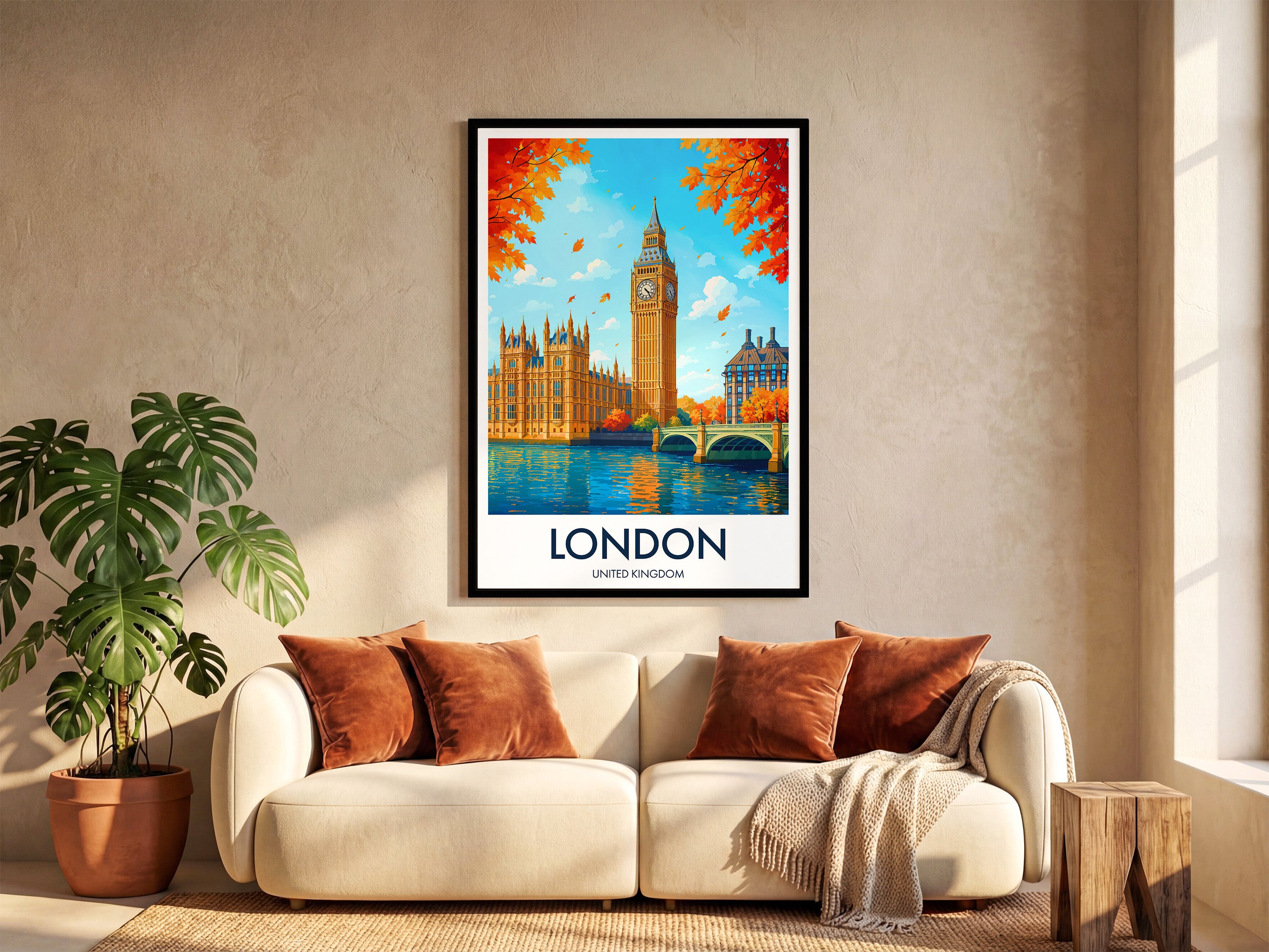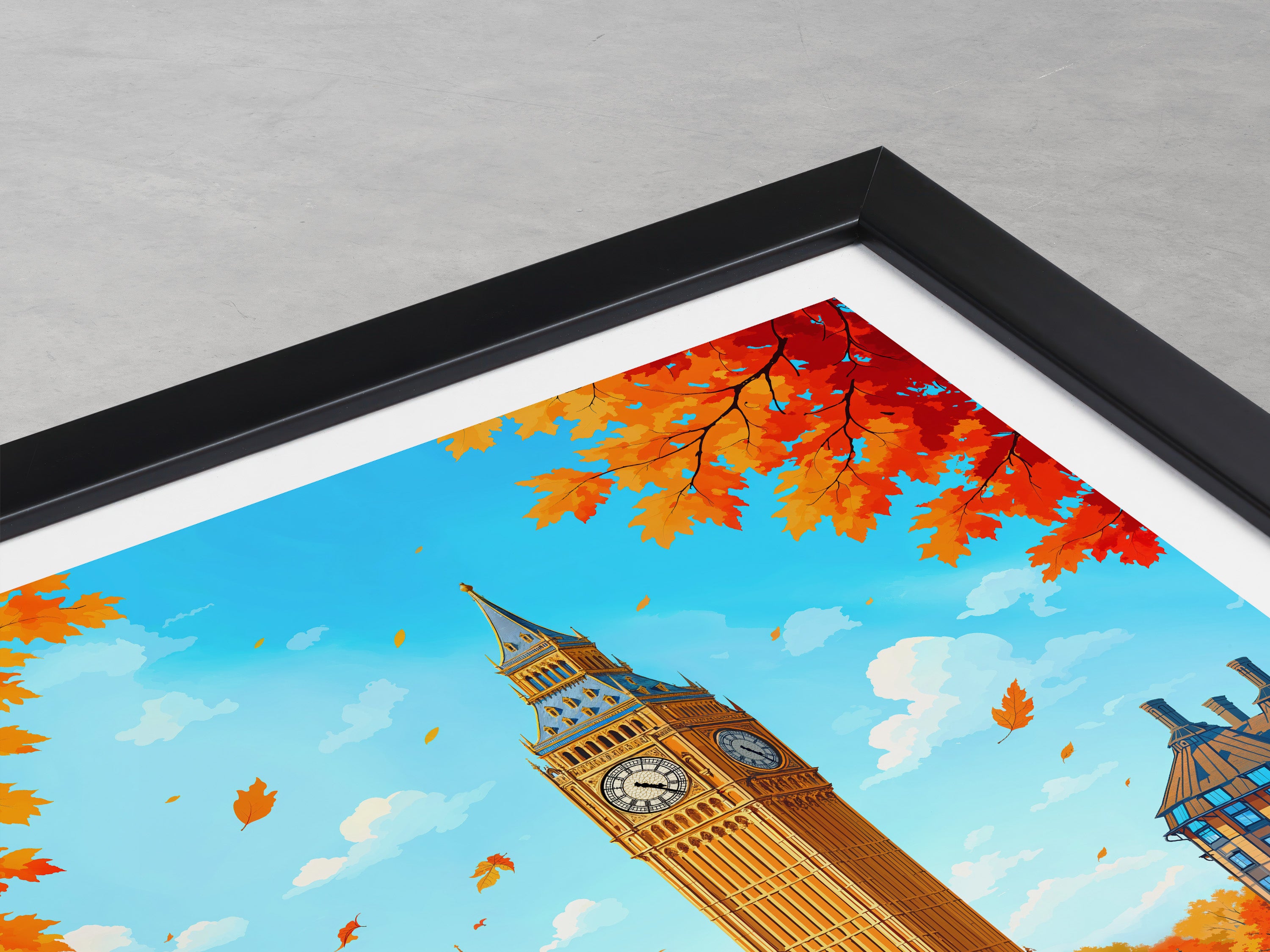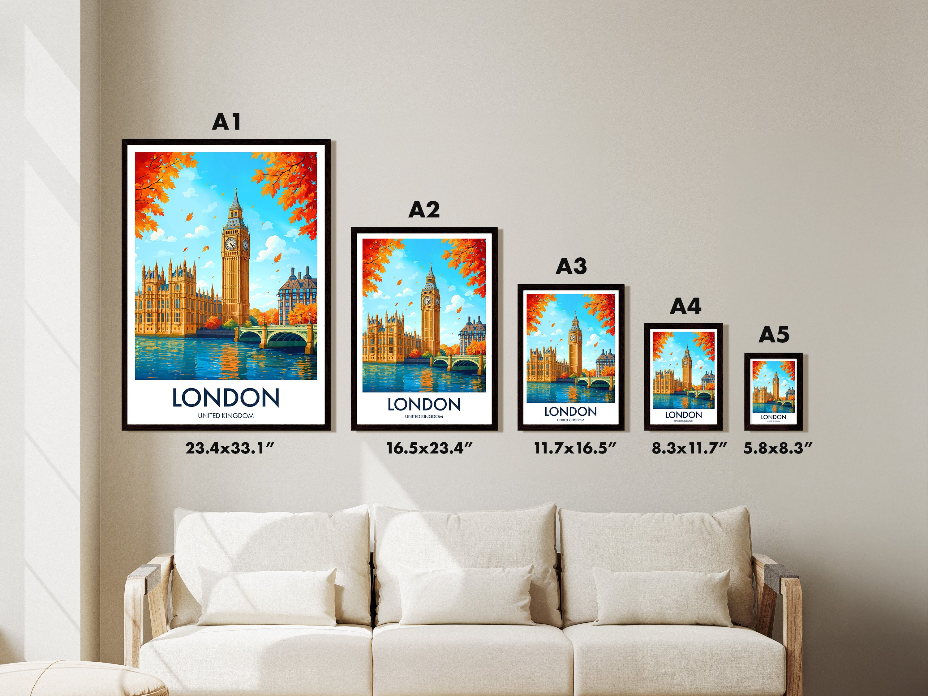 Capture the essence of London with this vibrant Big Ben print. Featuring the iconic Westminster landmark and a vivid autumn backdrop, it's a perfect representation of London's timeless charm and beauty.
