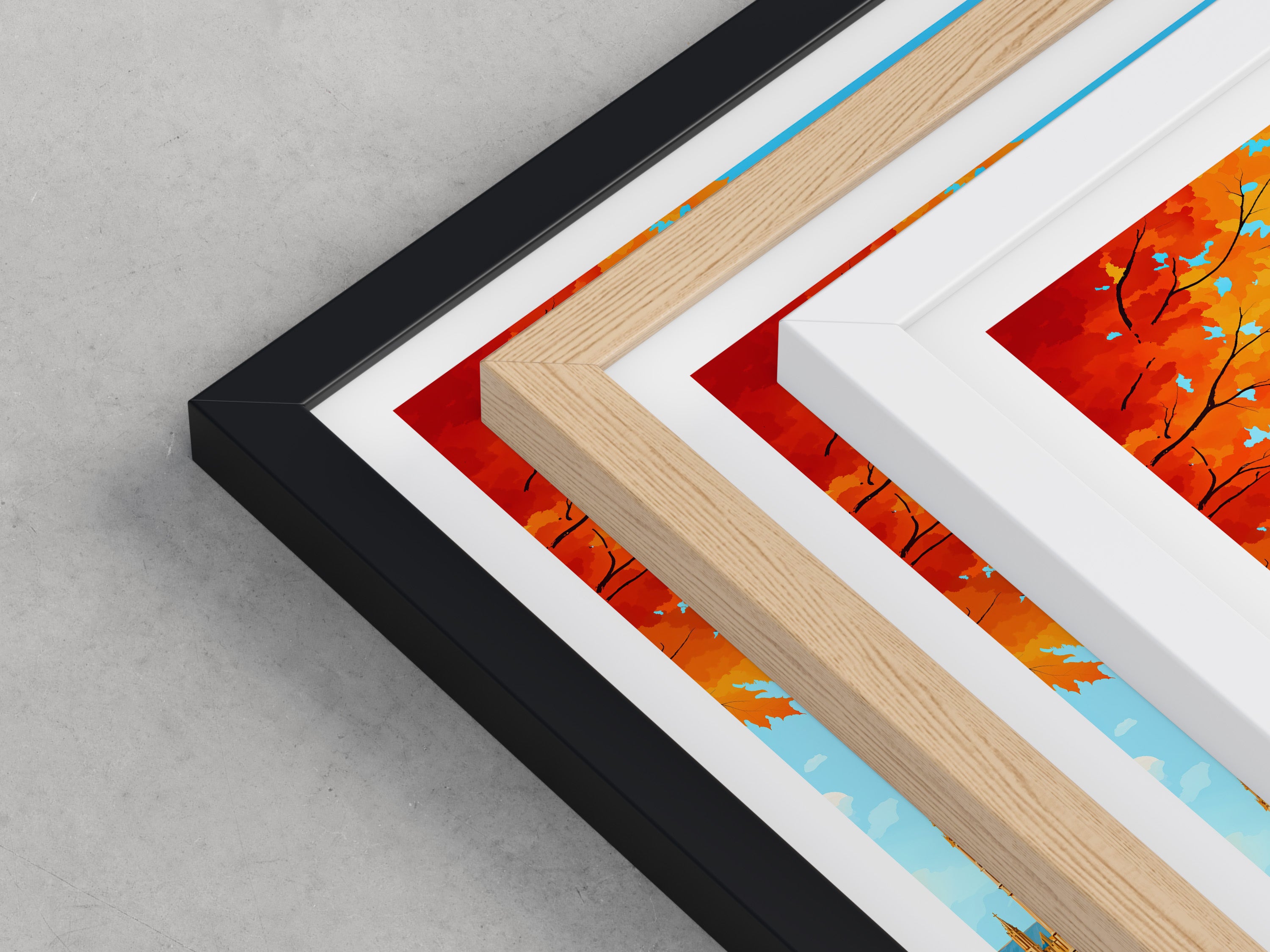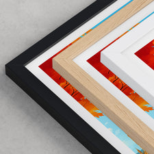 Framed options use sustainably sourced wooden frames in black, white, or natural wood, ready to hang.