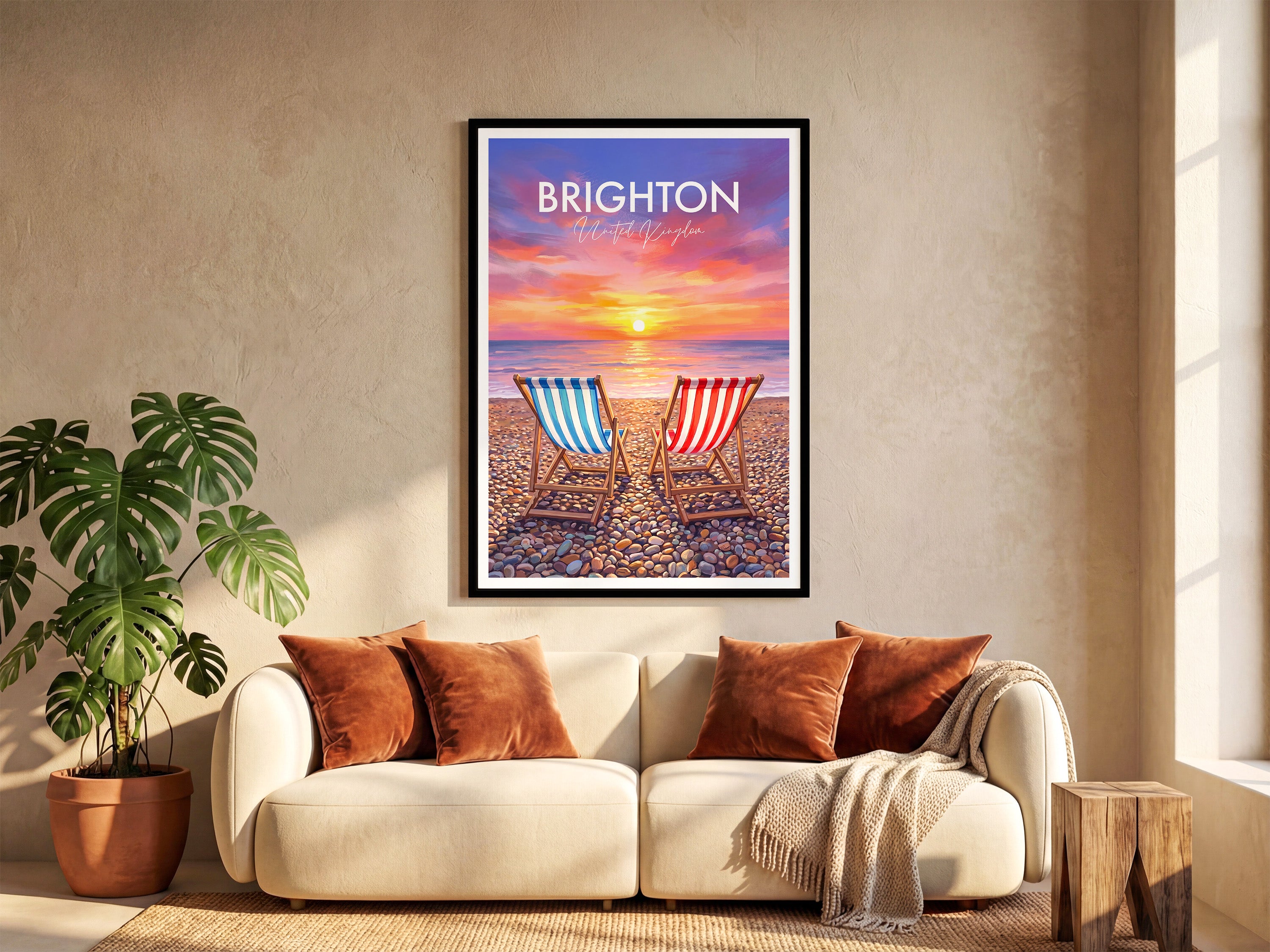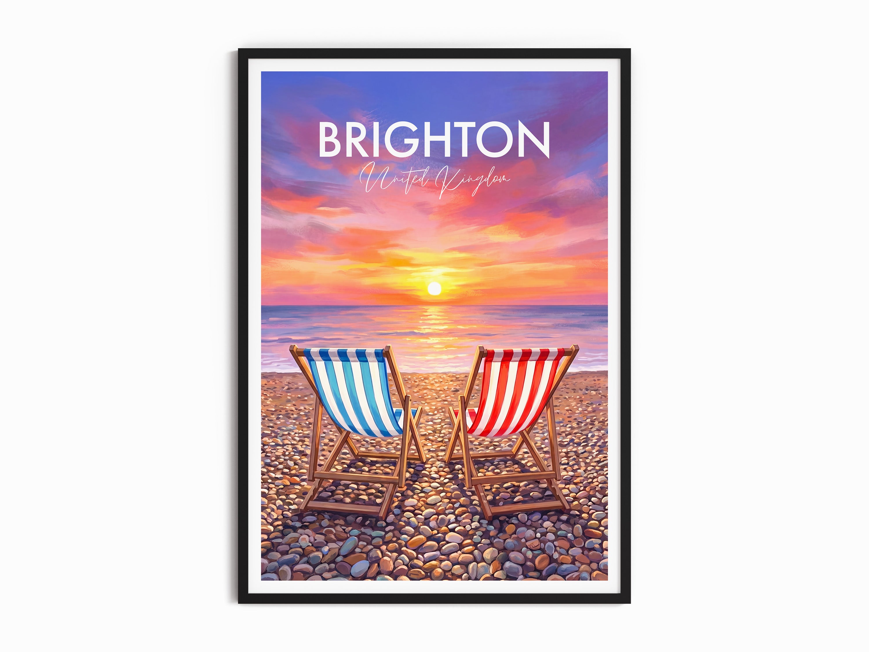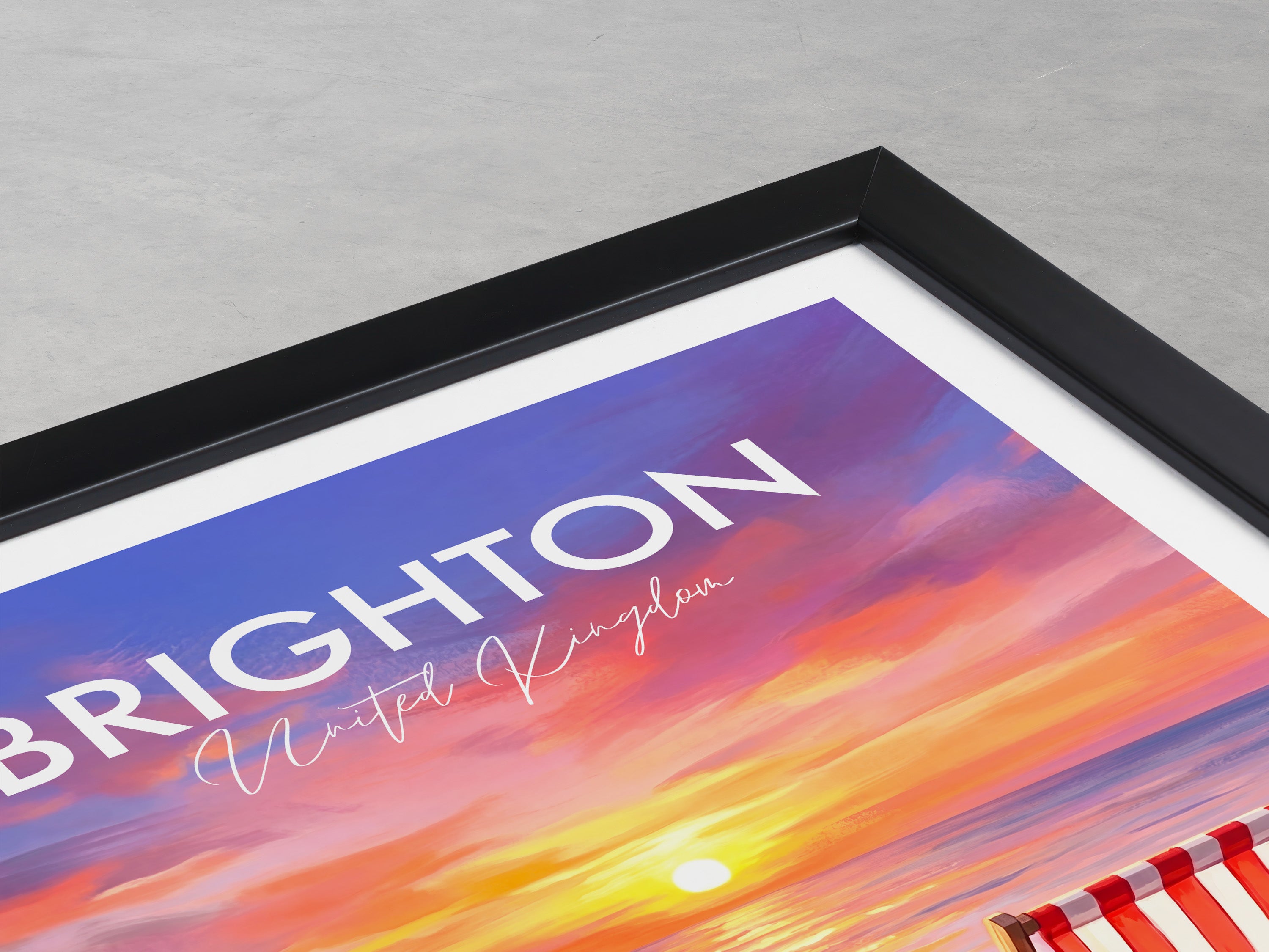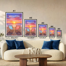 Bring the vibrant seaside to your home with this Brighton Beach Sunset print, inspired by the iconic Brighton seafront in the United Kingdom. This digitally illustrated travel poster captures the golden skies and the peaceful charm of Brighton, making it a wonderful keepsake or a gift for lovers of the British coast.