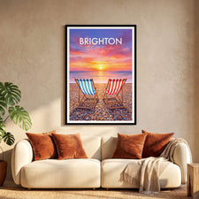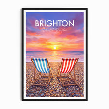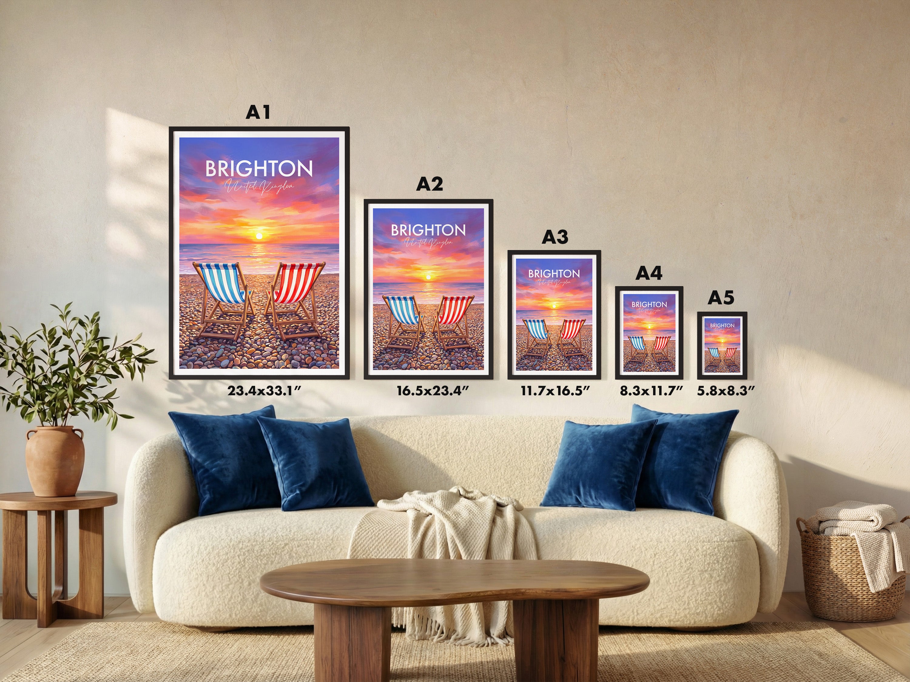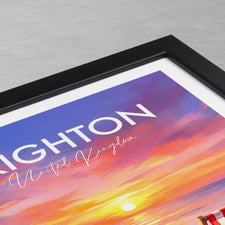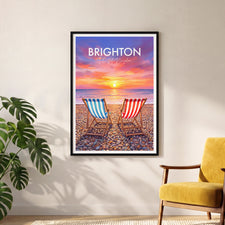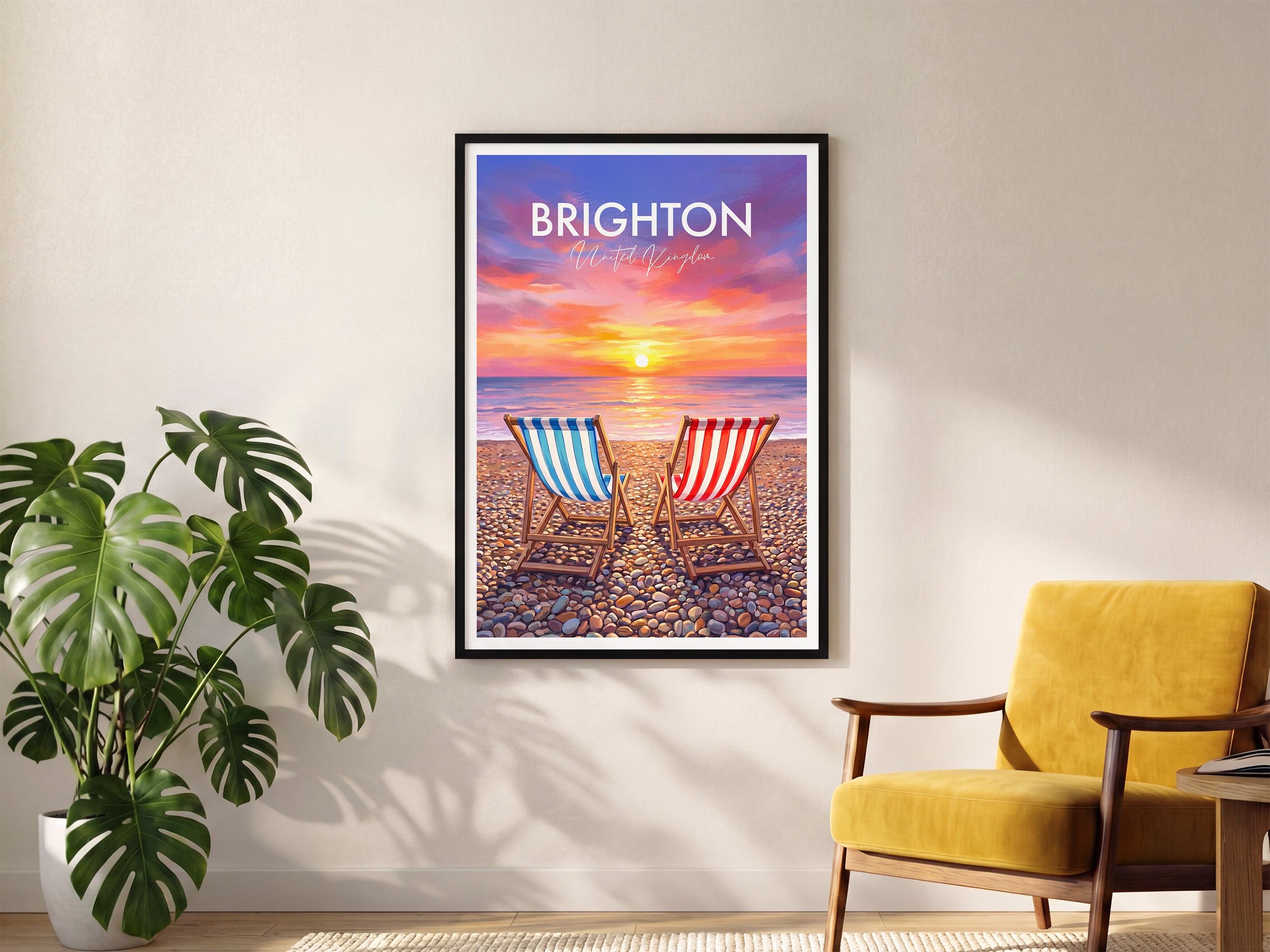 Bring the vibrant seaside to your home with this Brighton Beach Sunset print, inspired by the iconic Brighton seafront in the United Kingdom. This digitally illustrated travel poster captures the golden skies and the peaceful charm of Brighton, making it a wonderful keepsake or a gift for lovers of the British coast.