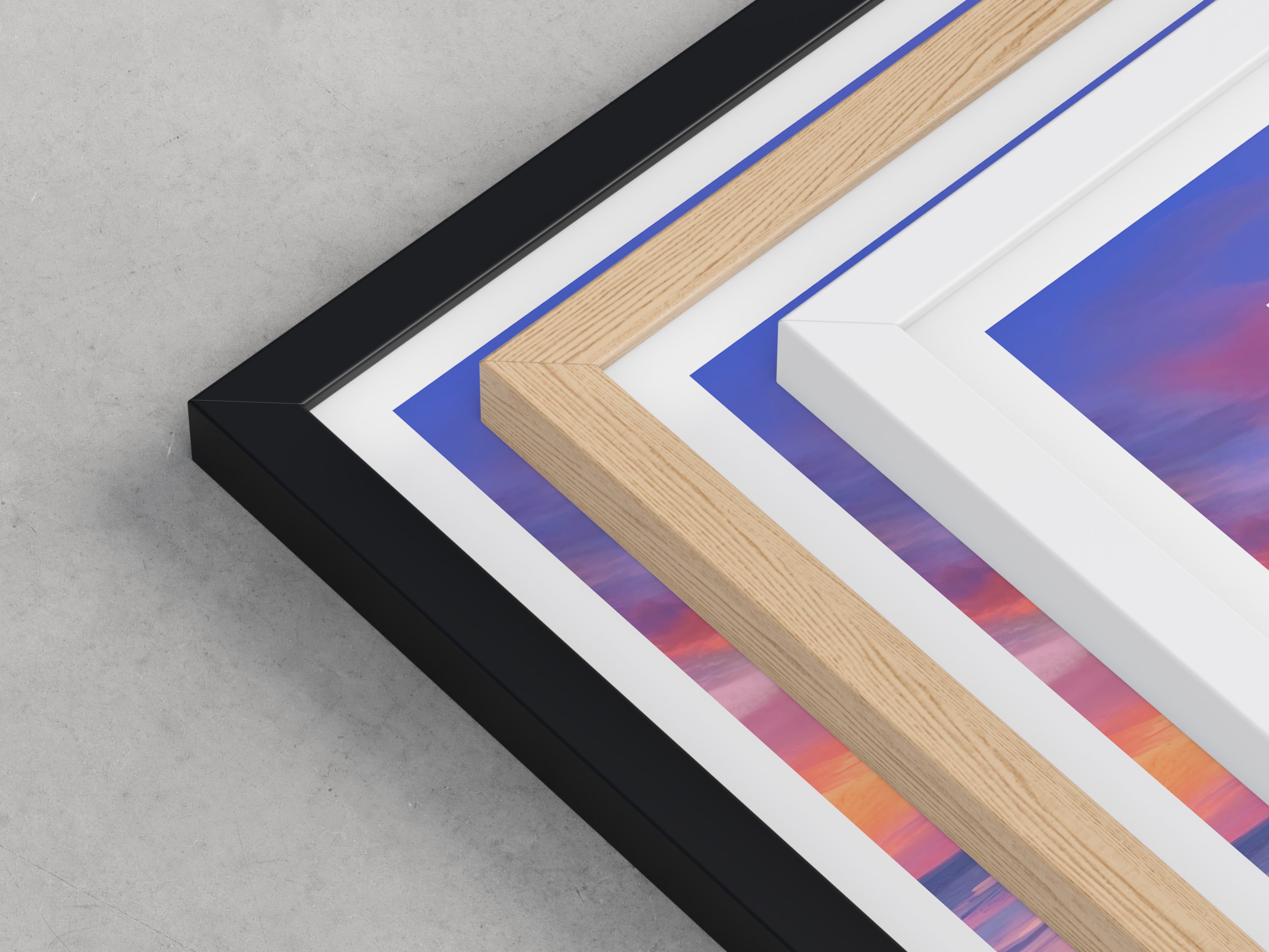 Framed options use sustainably sourced wooden frames in black, white, or natural wood, ready to hang.