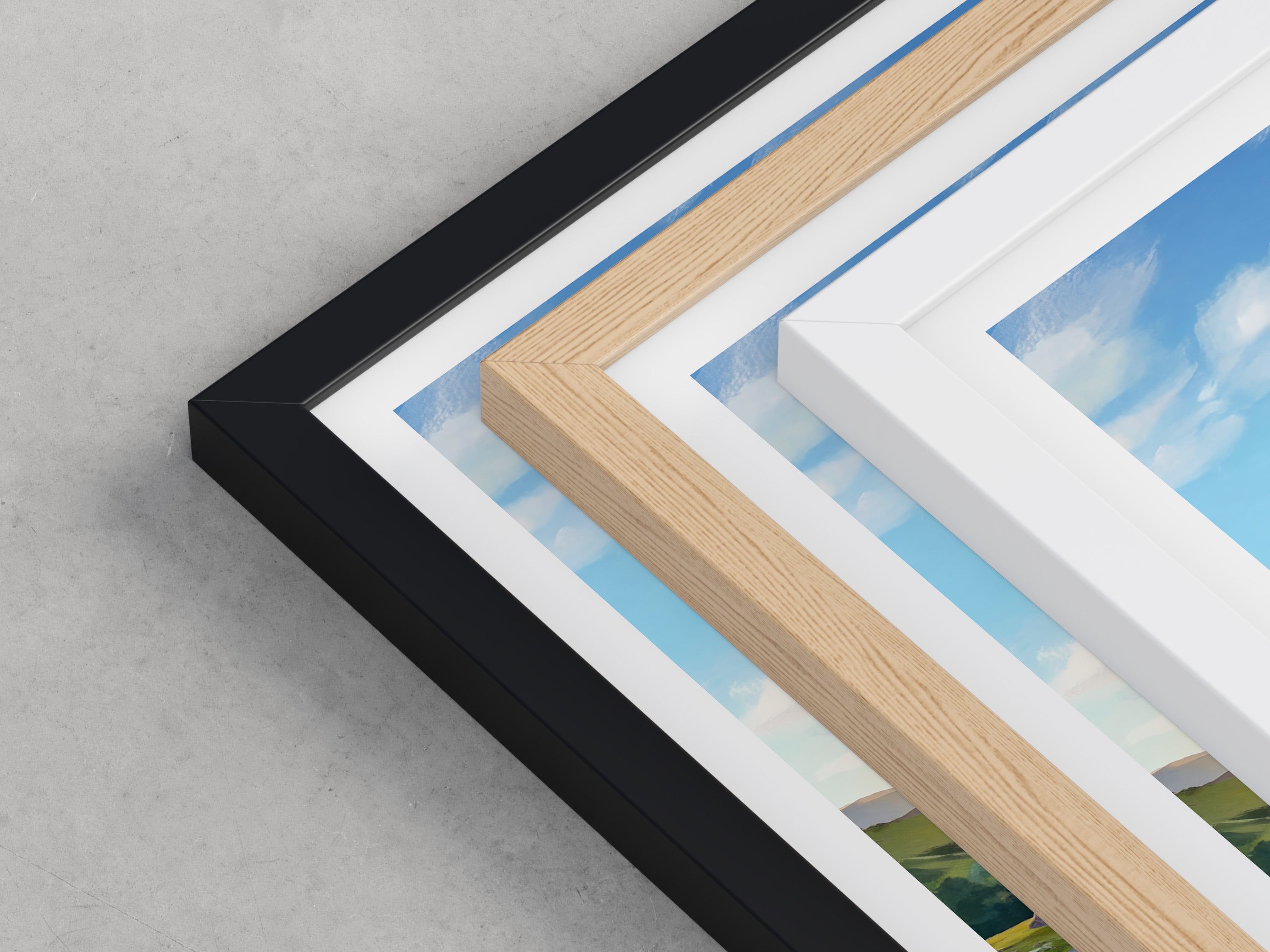 Framed options use sustainably sourced wooden frames in black, white, or natural wood, ready to hang.