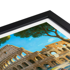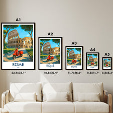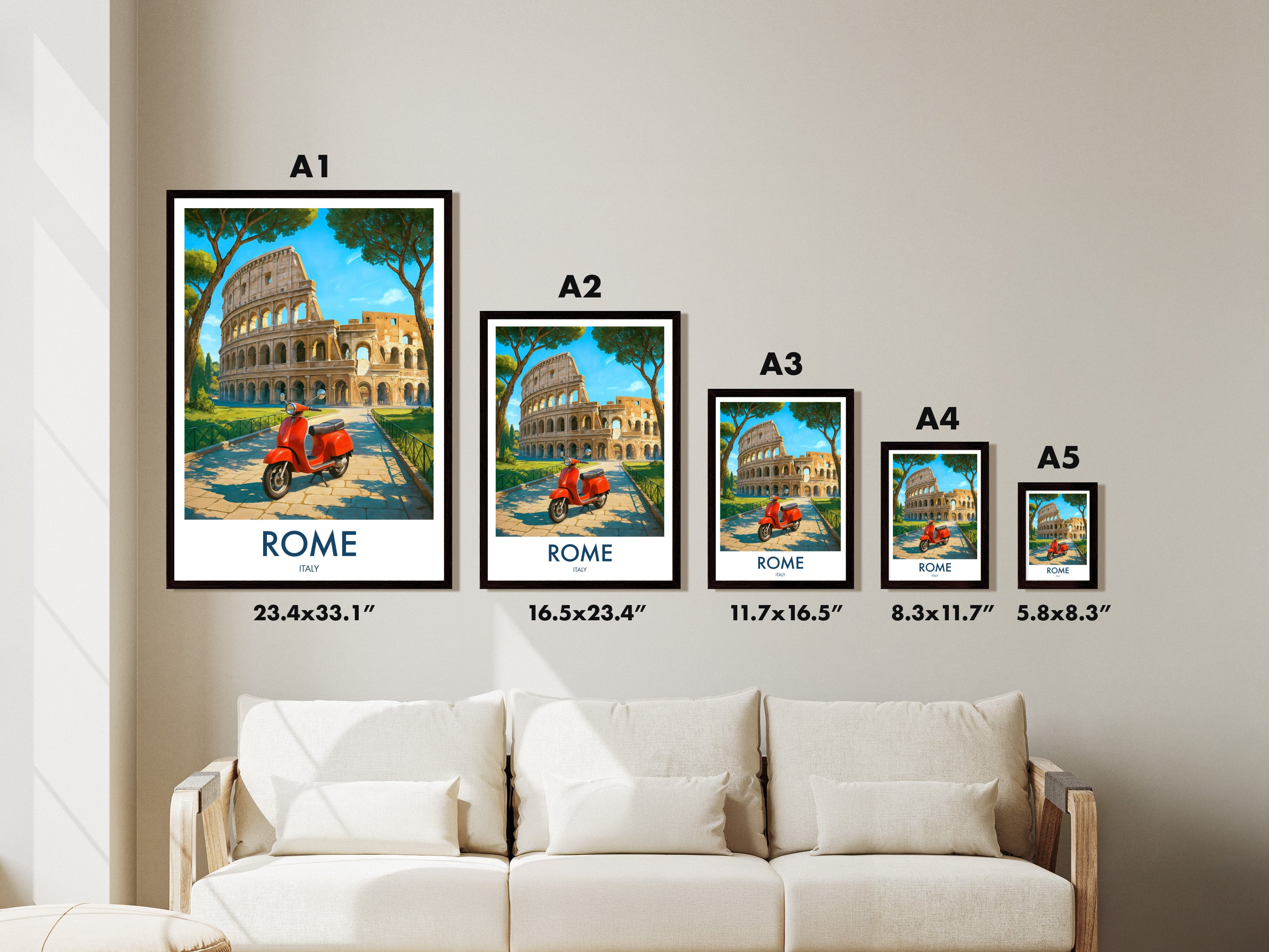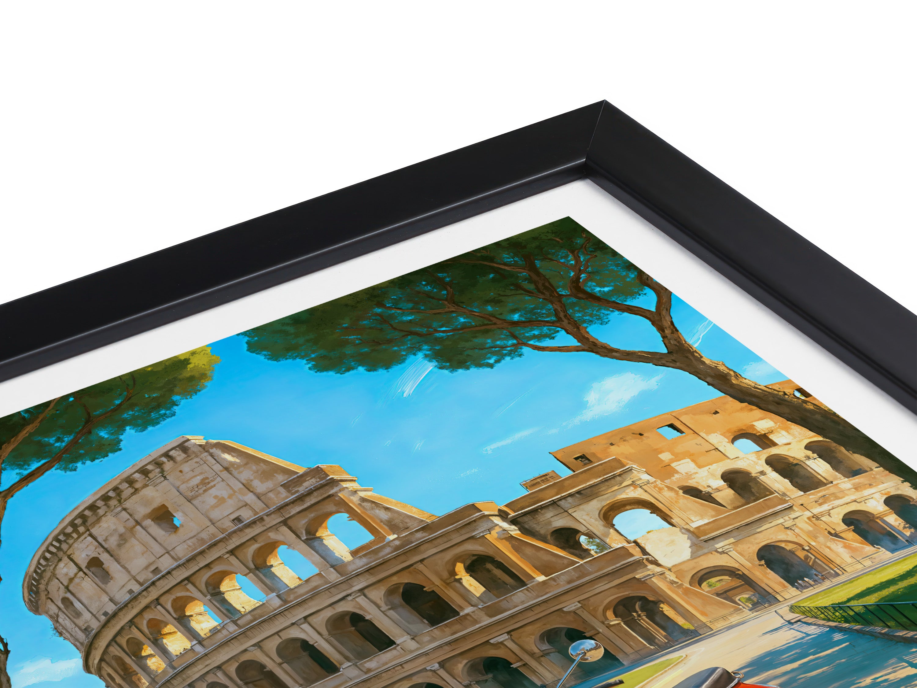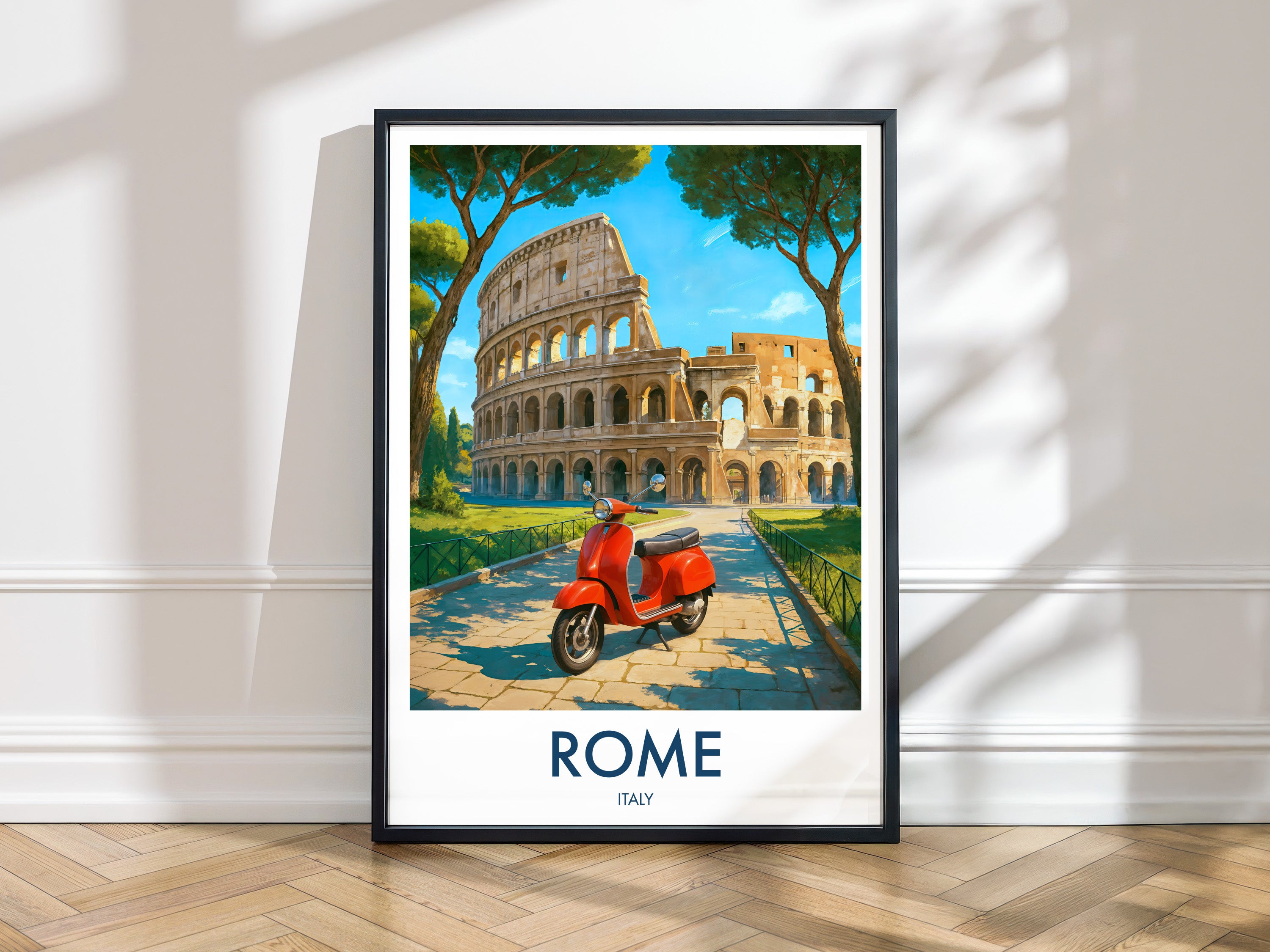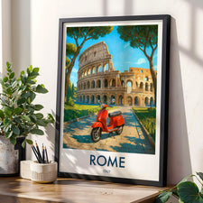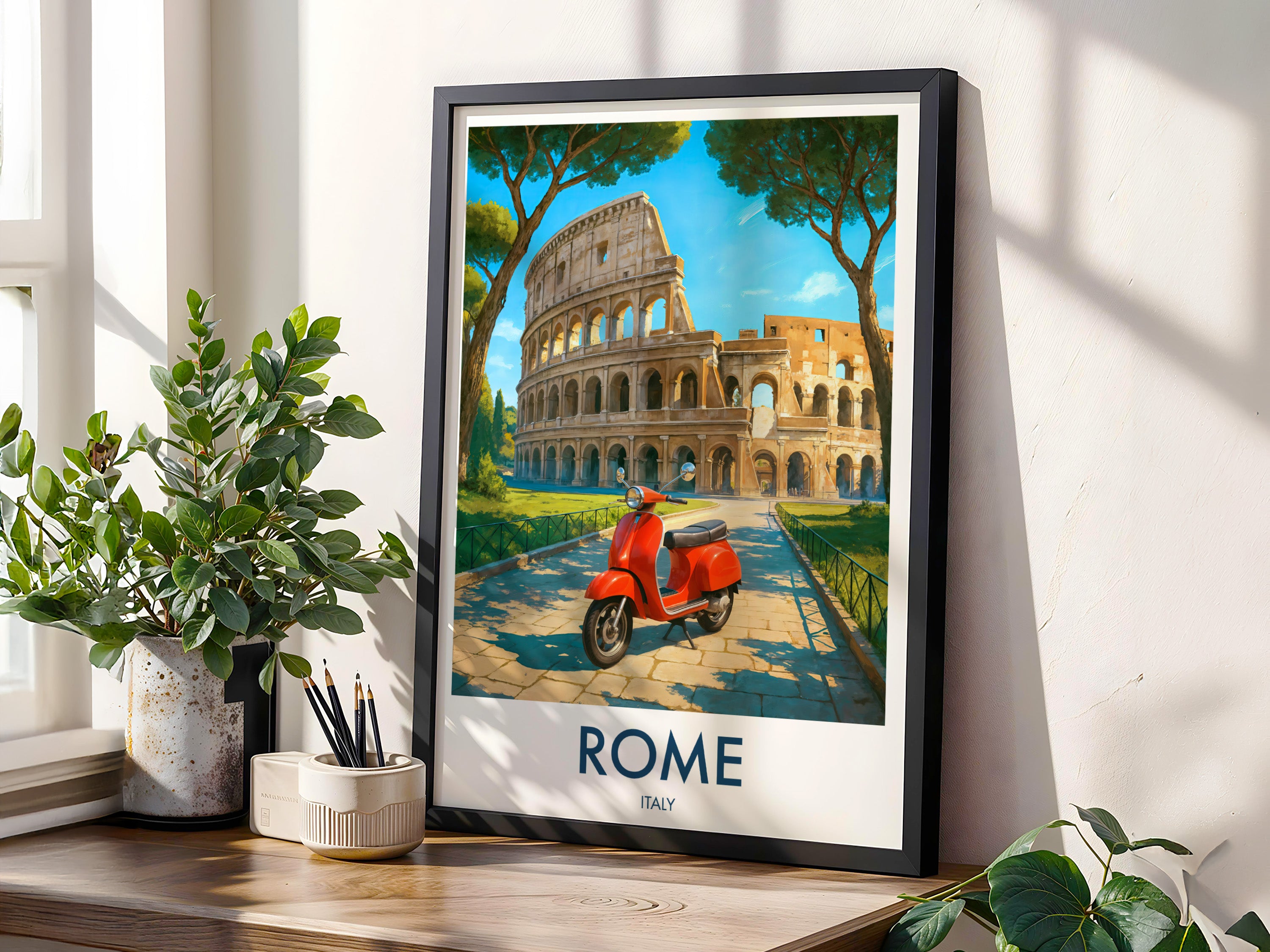 Capture the essence of Rome with this artistic print of the Colosseum and red scooter. A vibrant print that brings the historic city's atmosphere right into your living space.