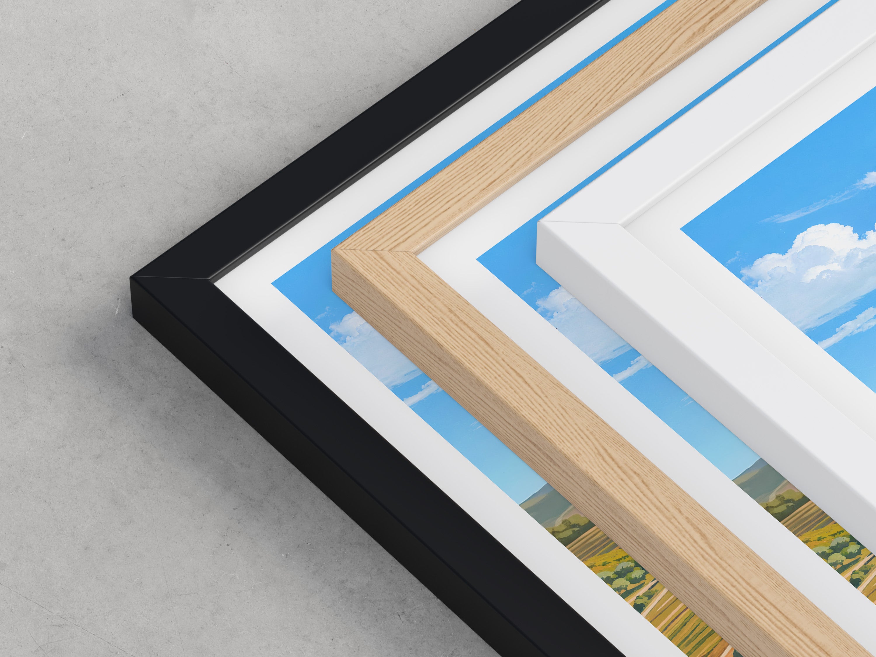 Framed options use sustainably sourced wooden frames in black, white, or natural wood, ready to hang.