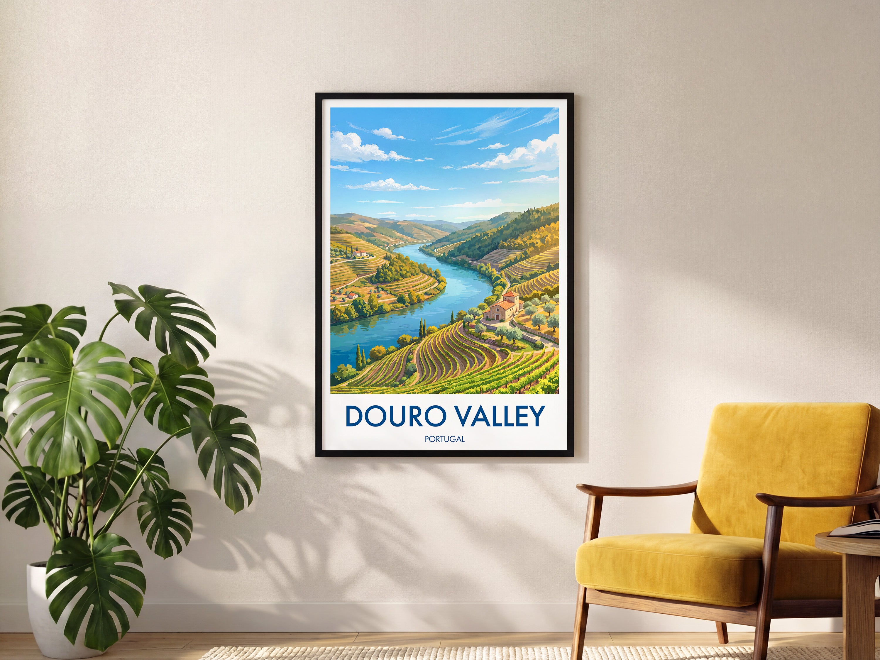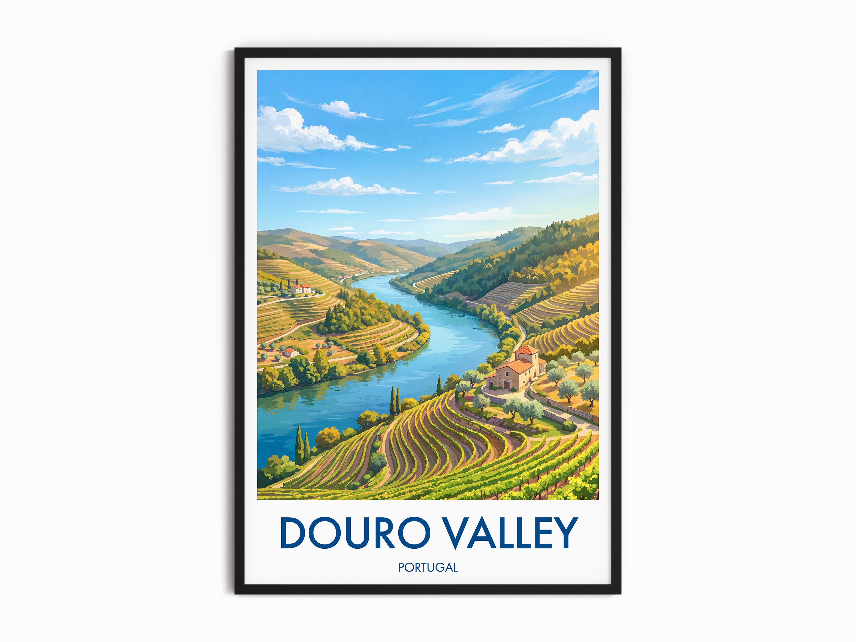 Celebrate the breathtaking scenery of the Douro Valley with this Portugal travel poster featuring Porto's famous terraced vineyards and winding river views. Ideal for wall art in your home or as a thoughtful gift, this illustrated print brings a touch of Portugal to your decor. The Douro Valley landscape captures the essence of wine country and European charm.
