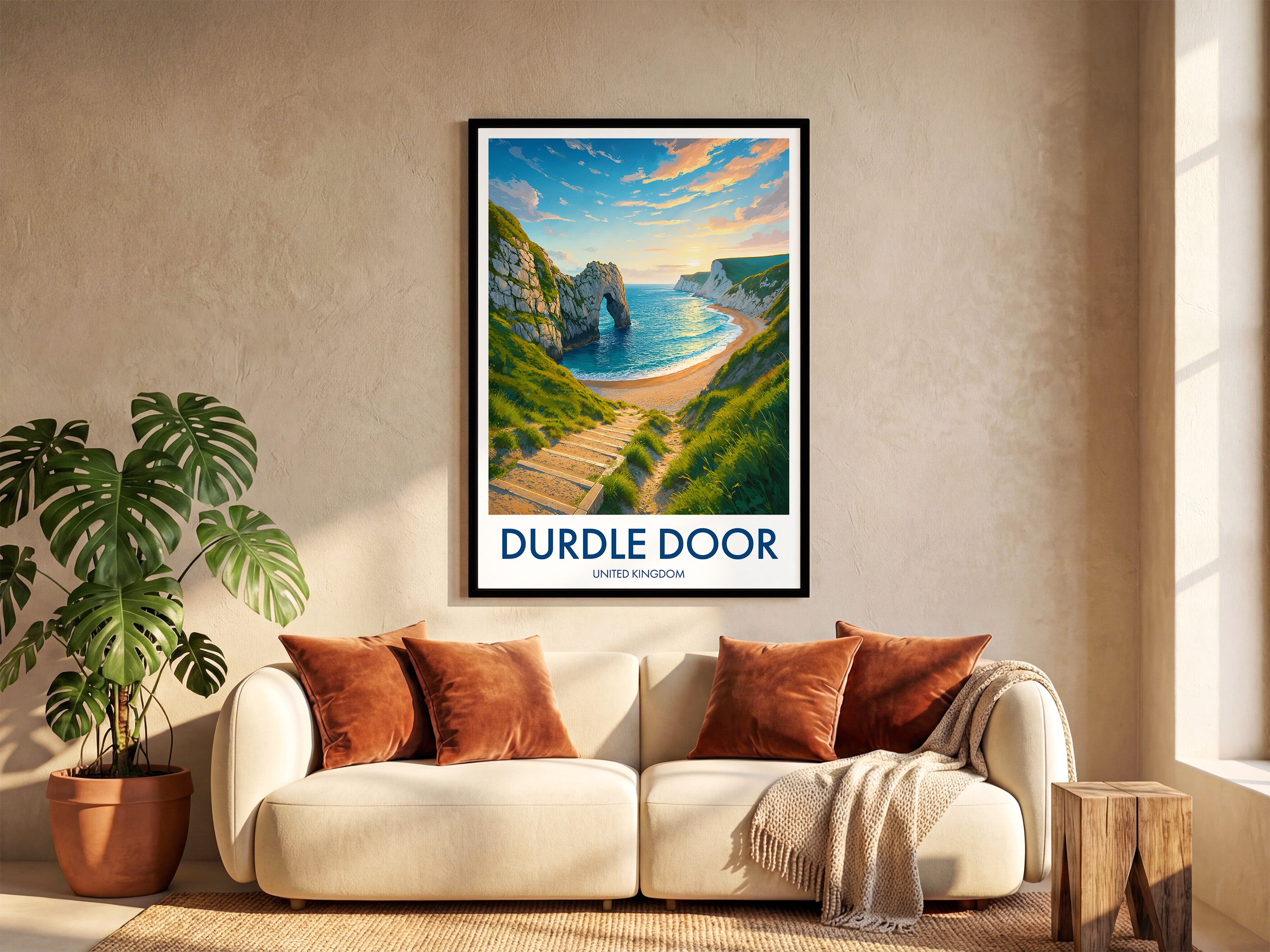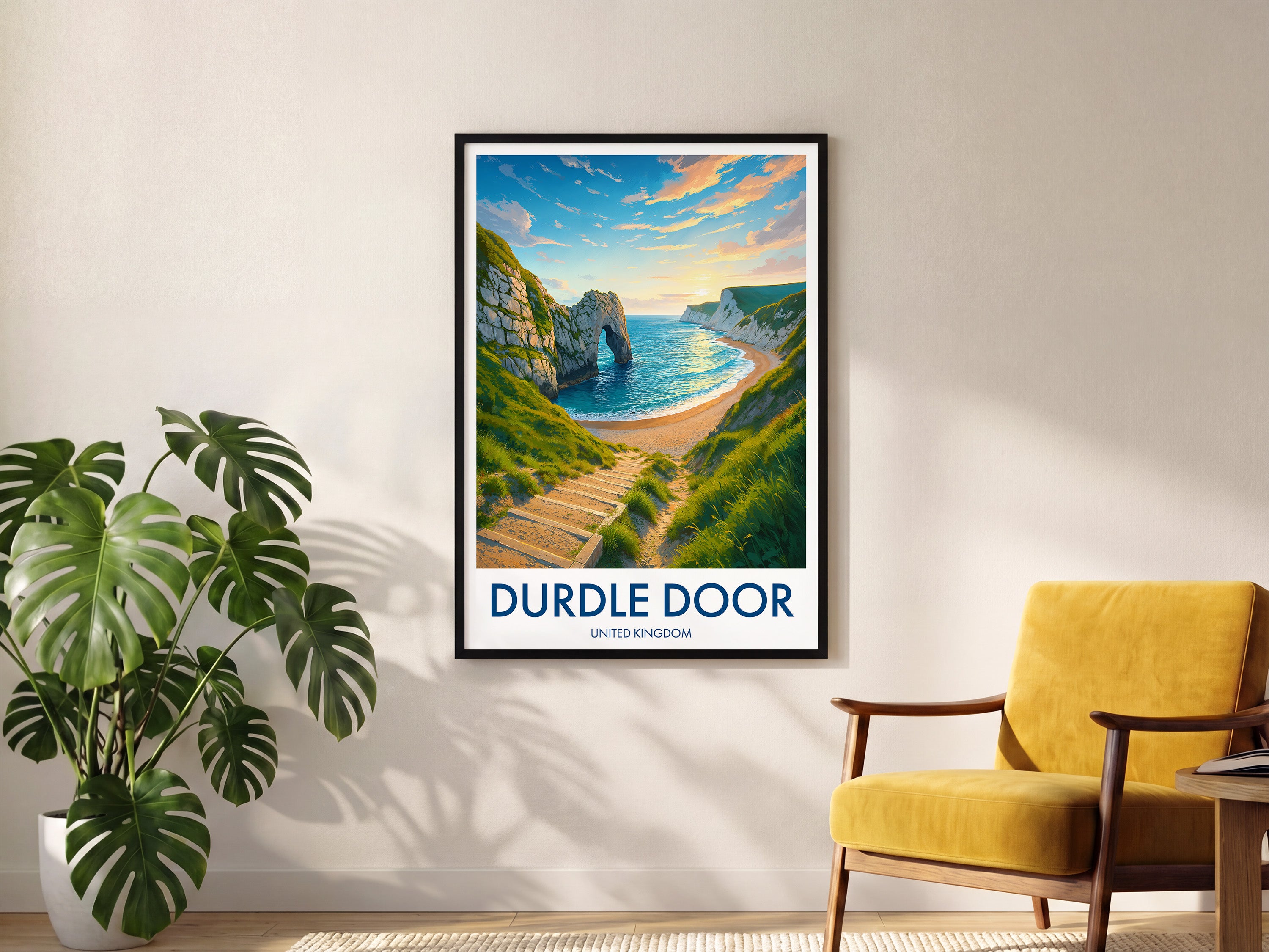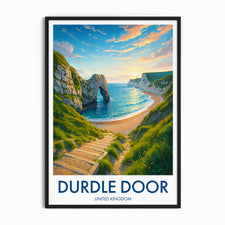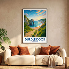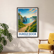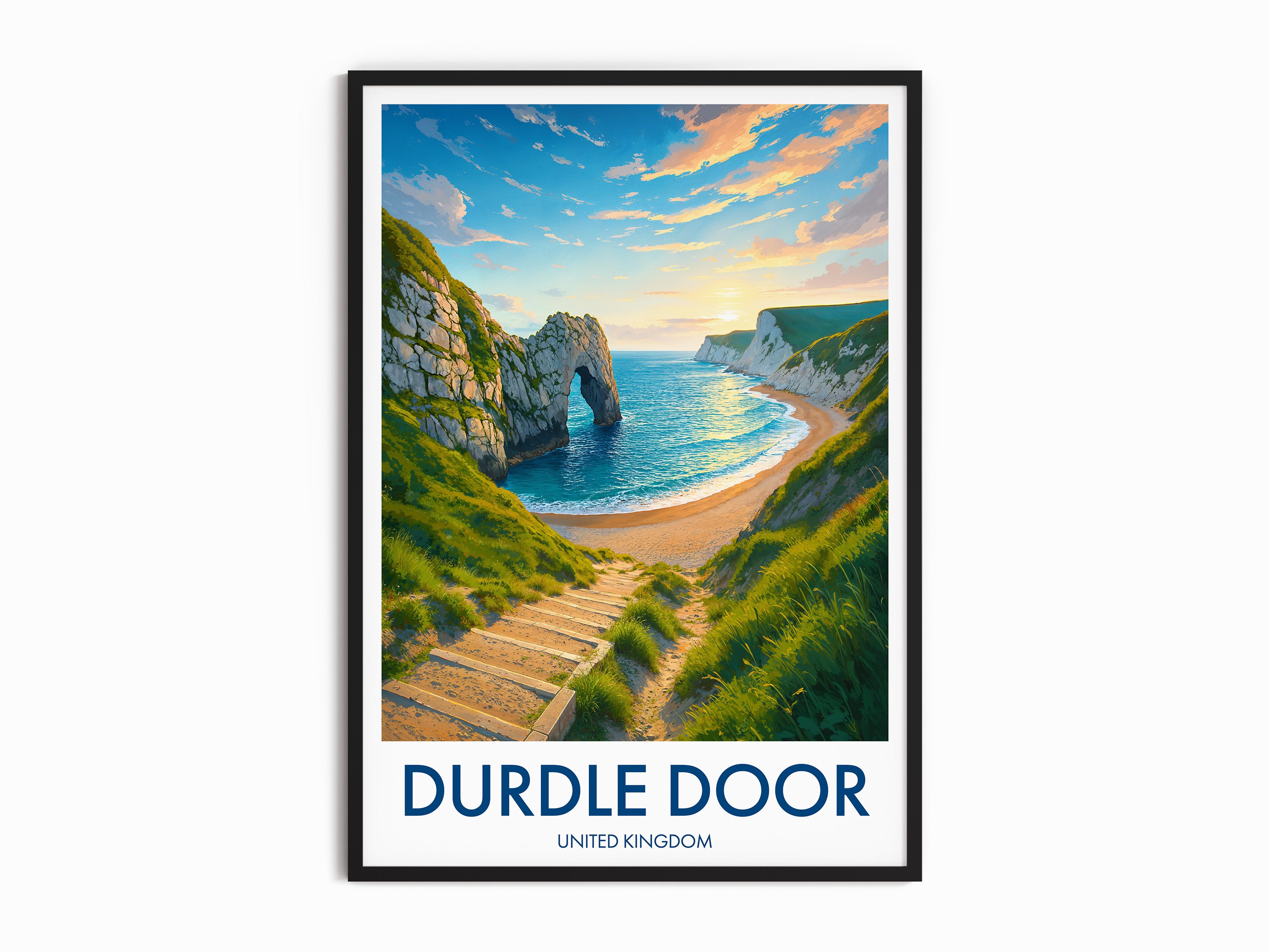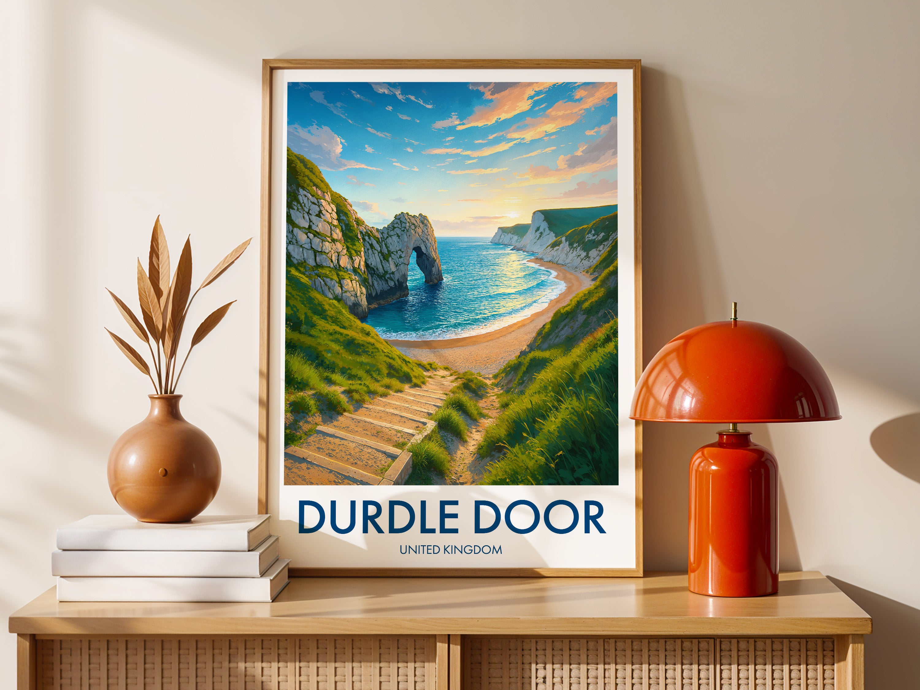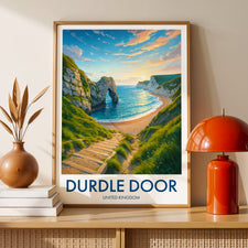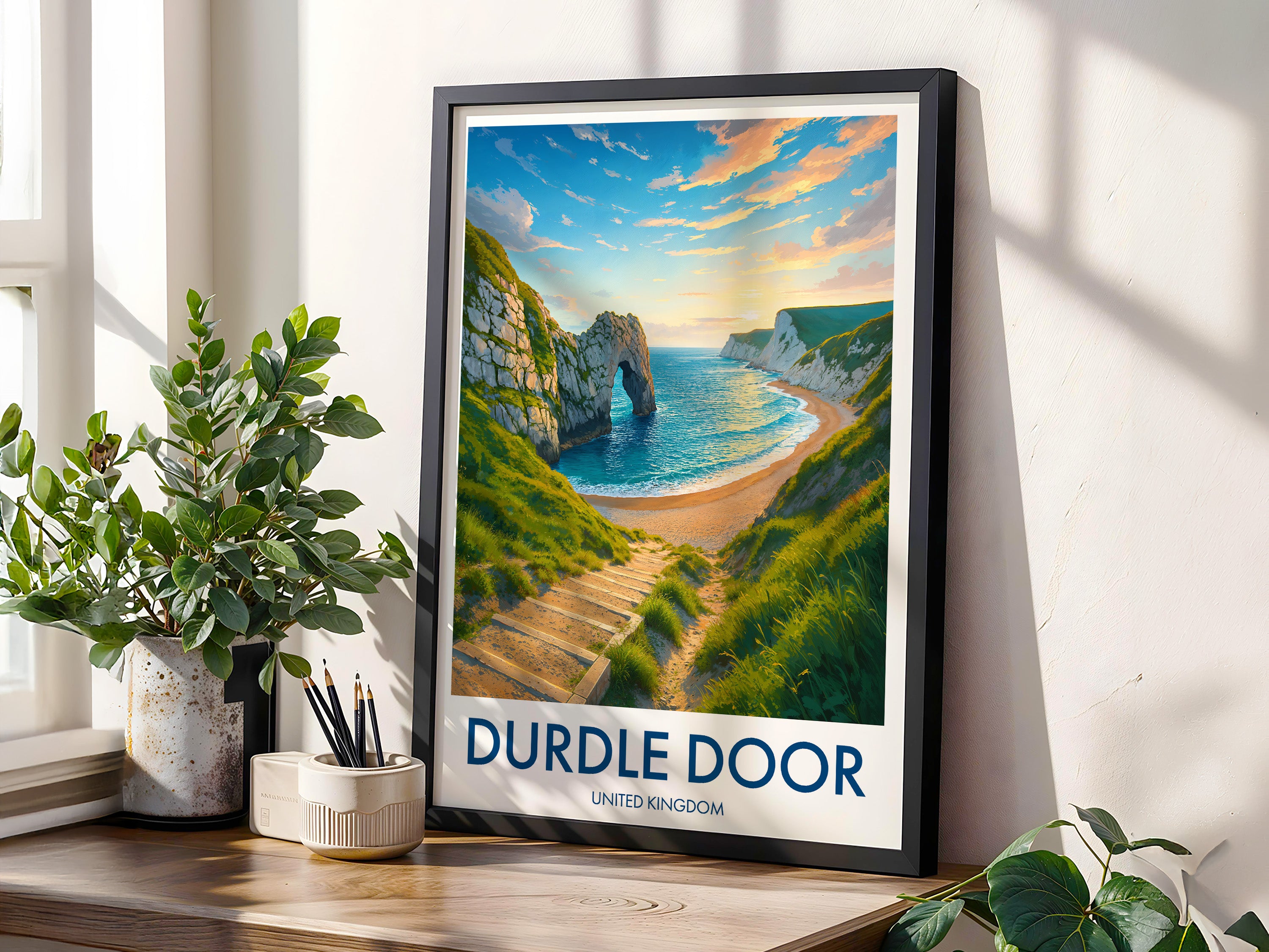 Add coastal charm to your space with this illustrated Durdle Door print. This vibrant design captures Dorset’s famous rock arch and scenic Jurassic Coast views.