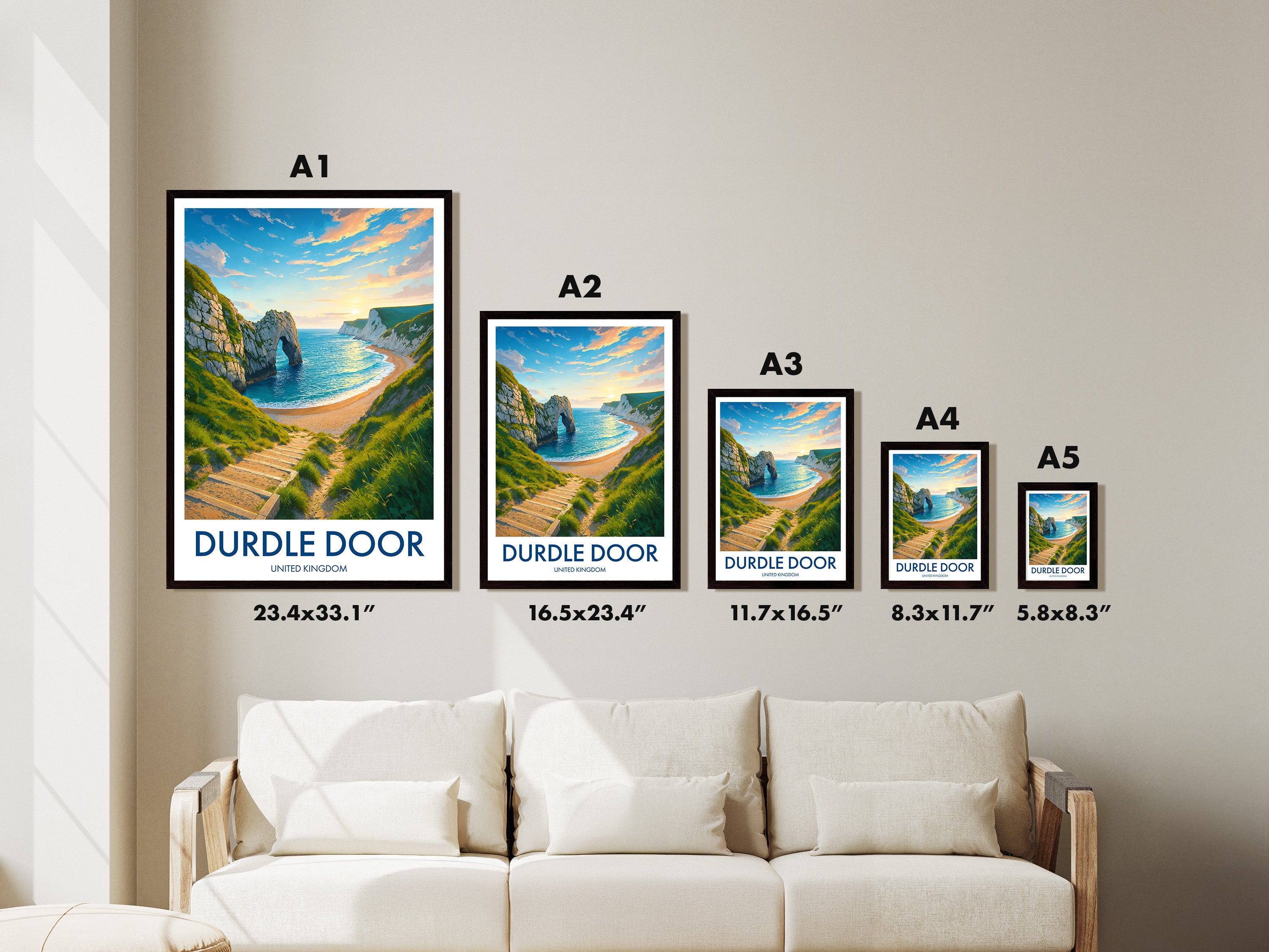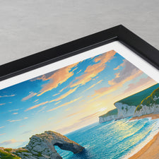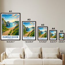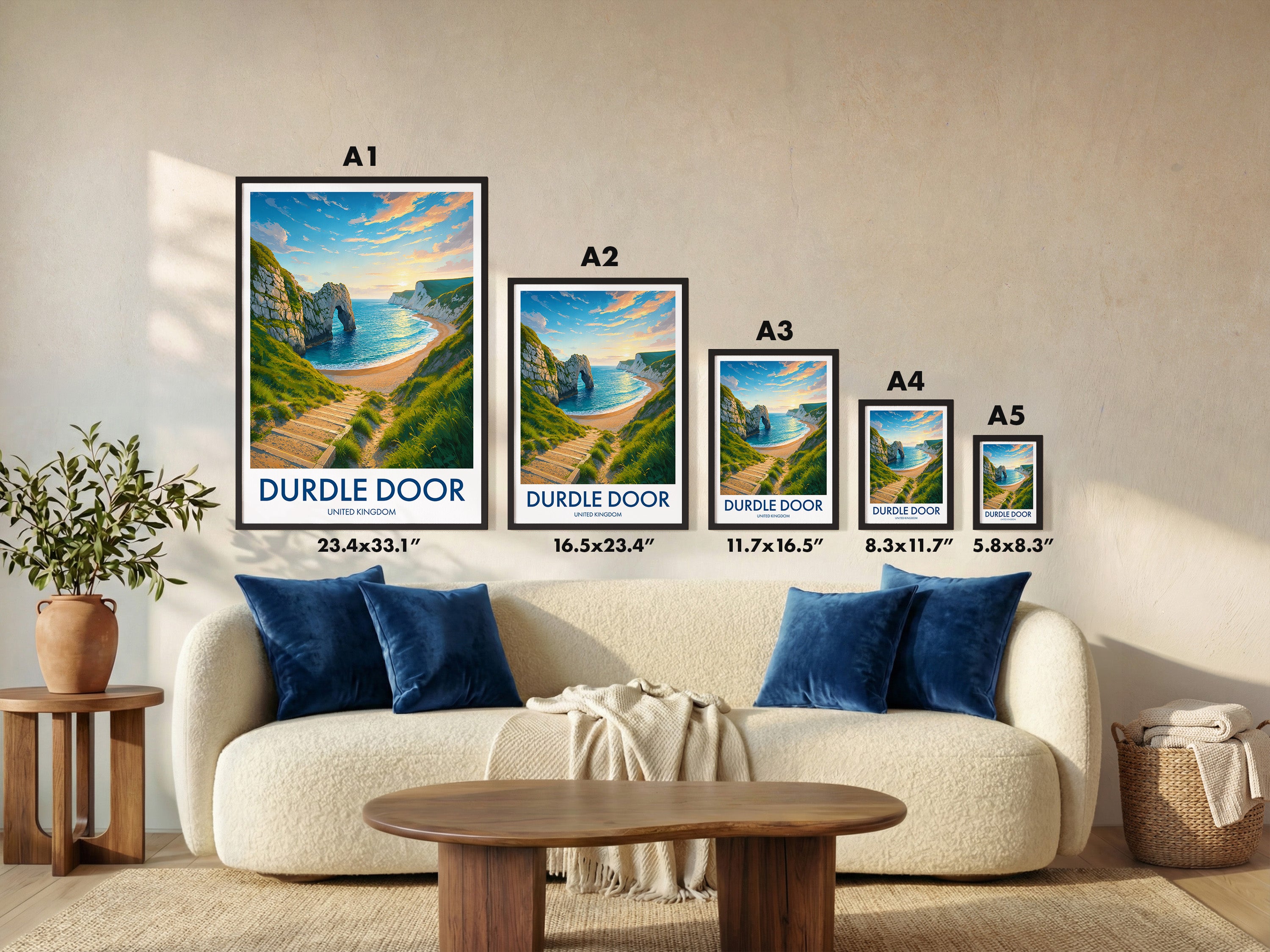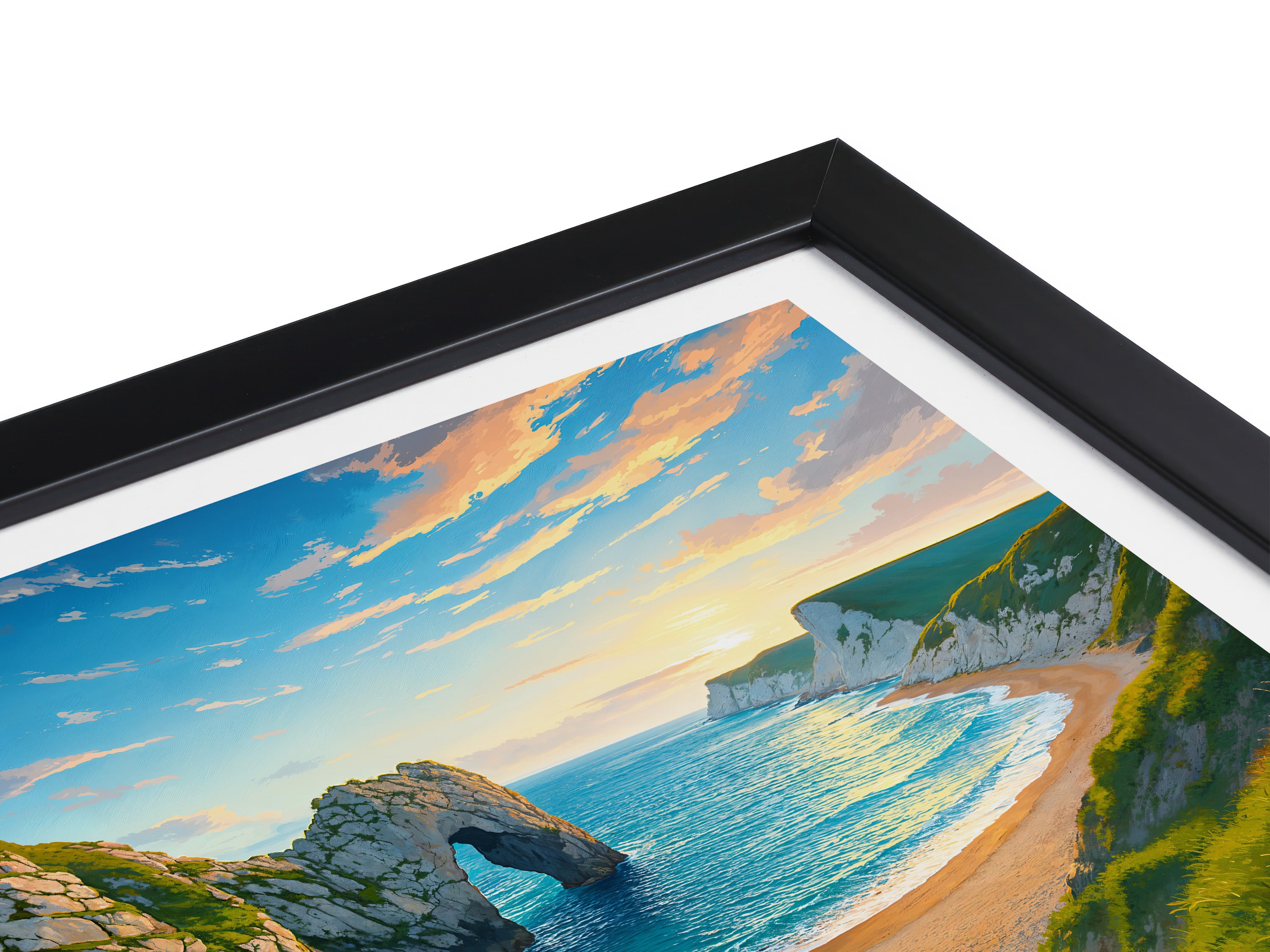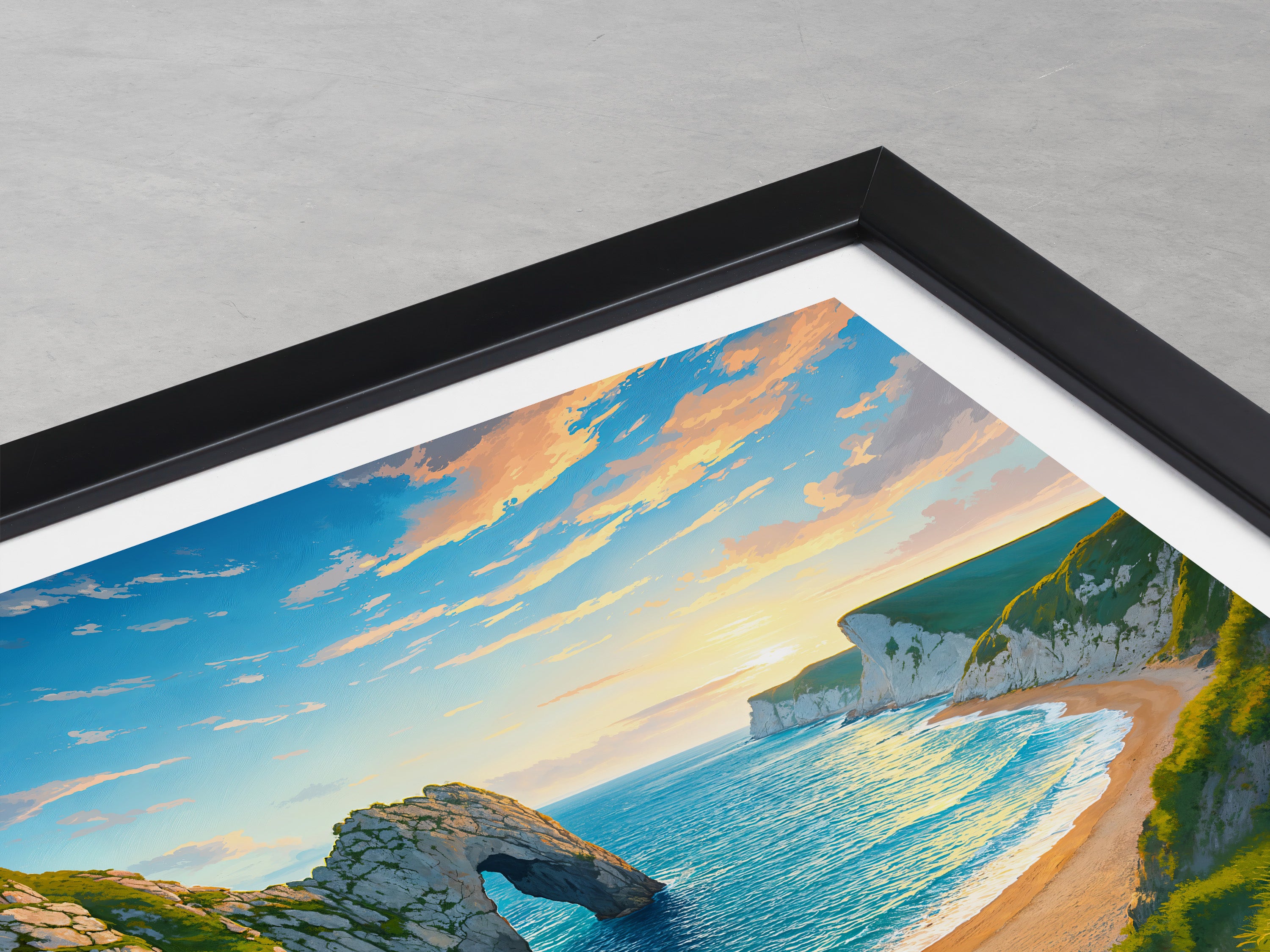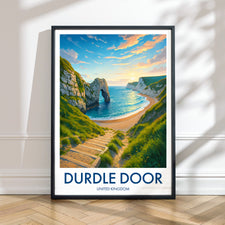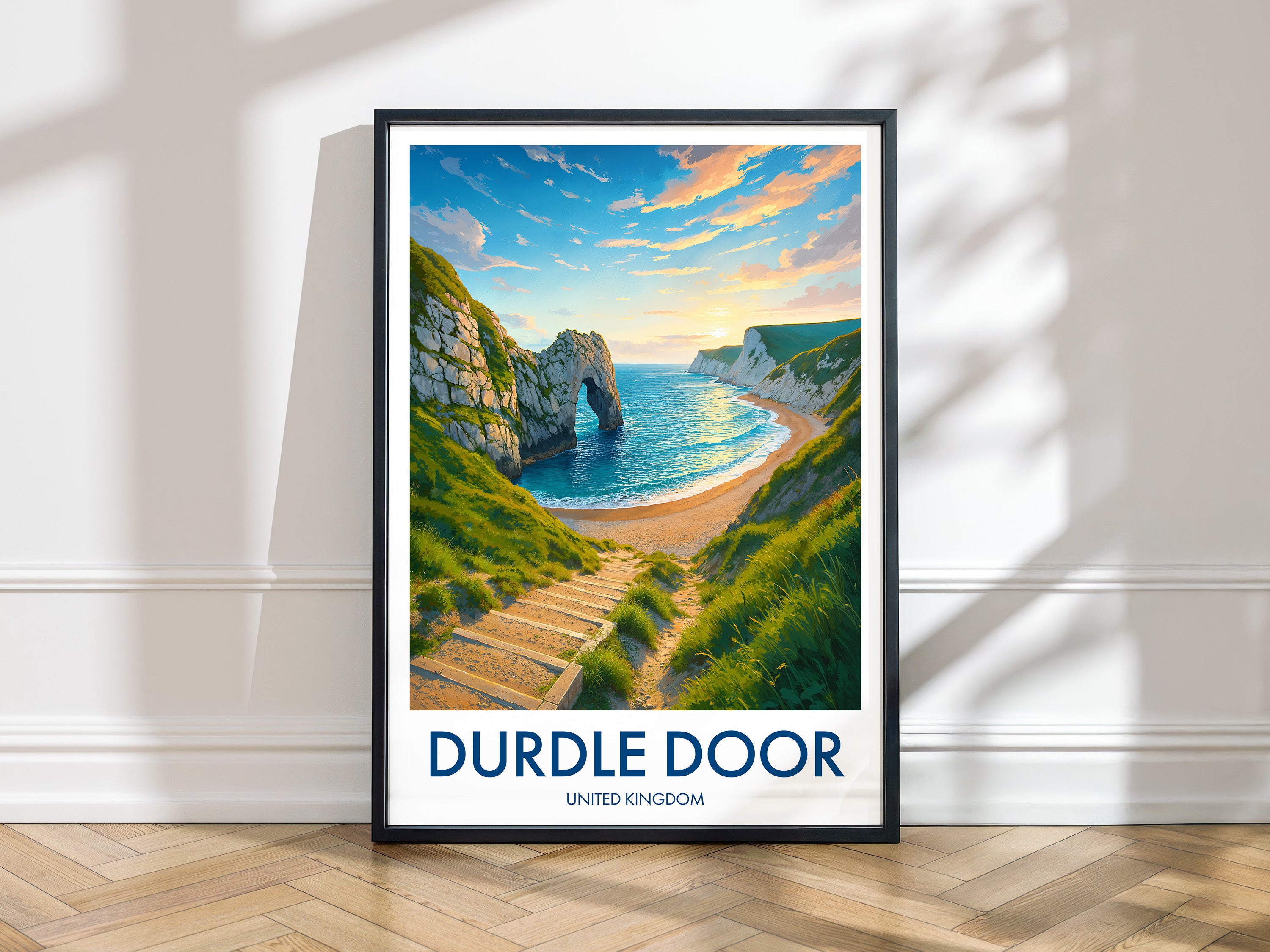 Add coastal charm to your space with this illustrated Durdle Door print. This vibrant design captures Dorset’s famous rock arch and scenic Jurassic Coast views.