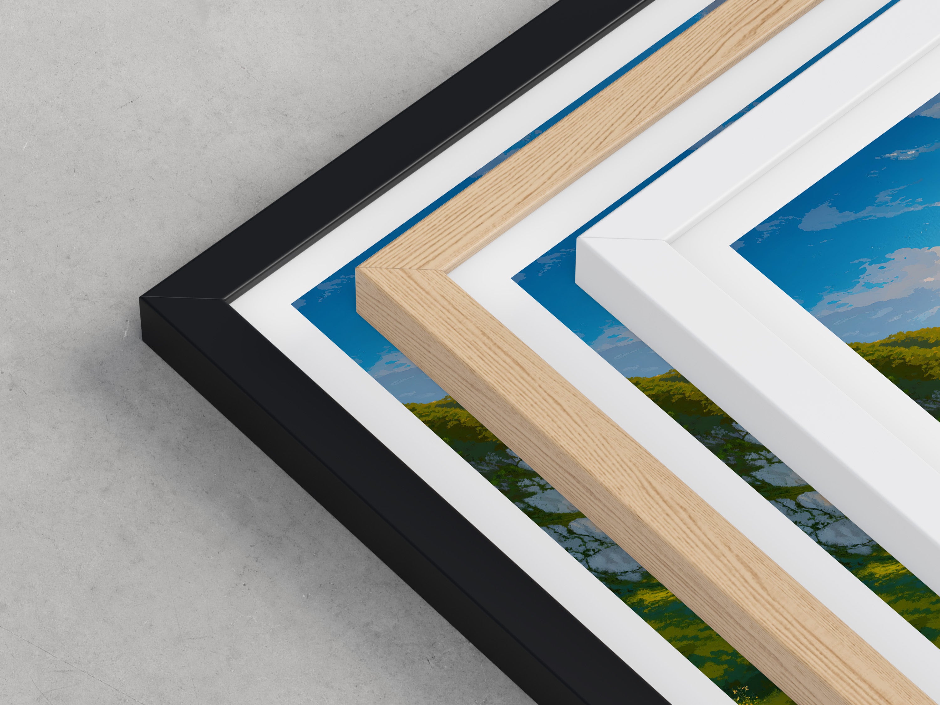 Framed options use sustainably sourced wooden frames in black, white, or natural wood, ready to hang.