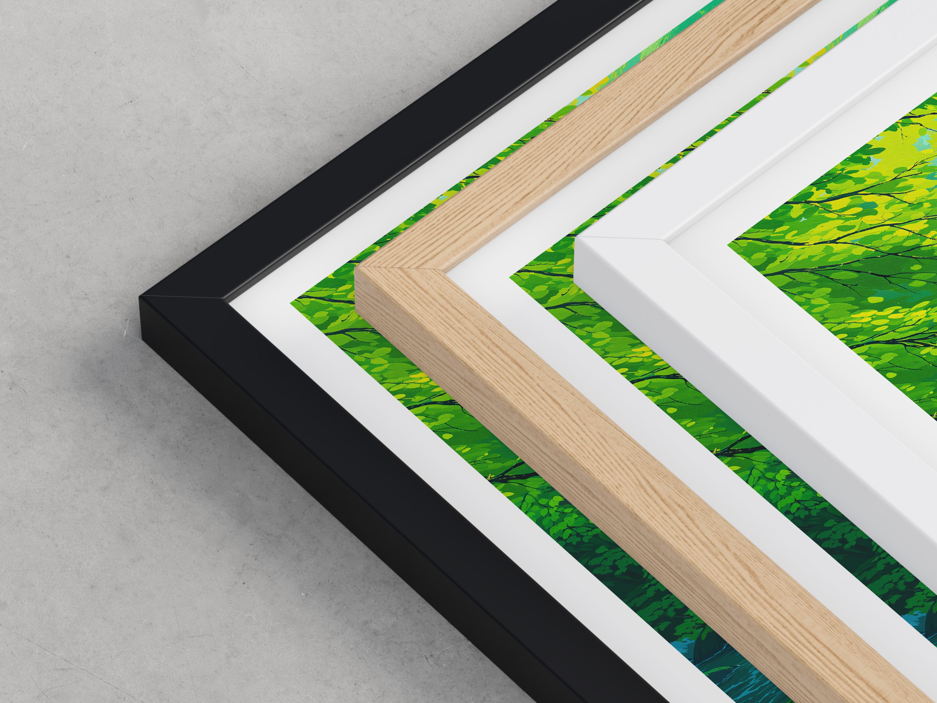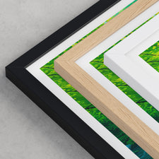 Framed options use sustainably sourced wooden frames in black, white, or natural wood, ready to hang.