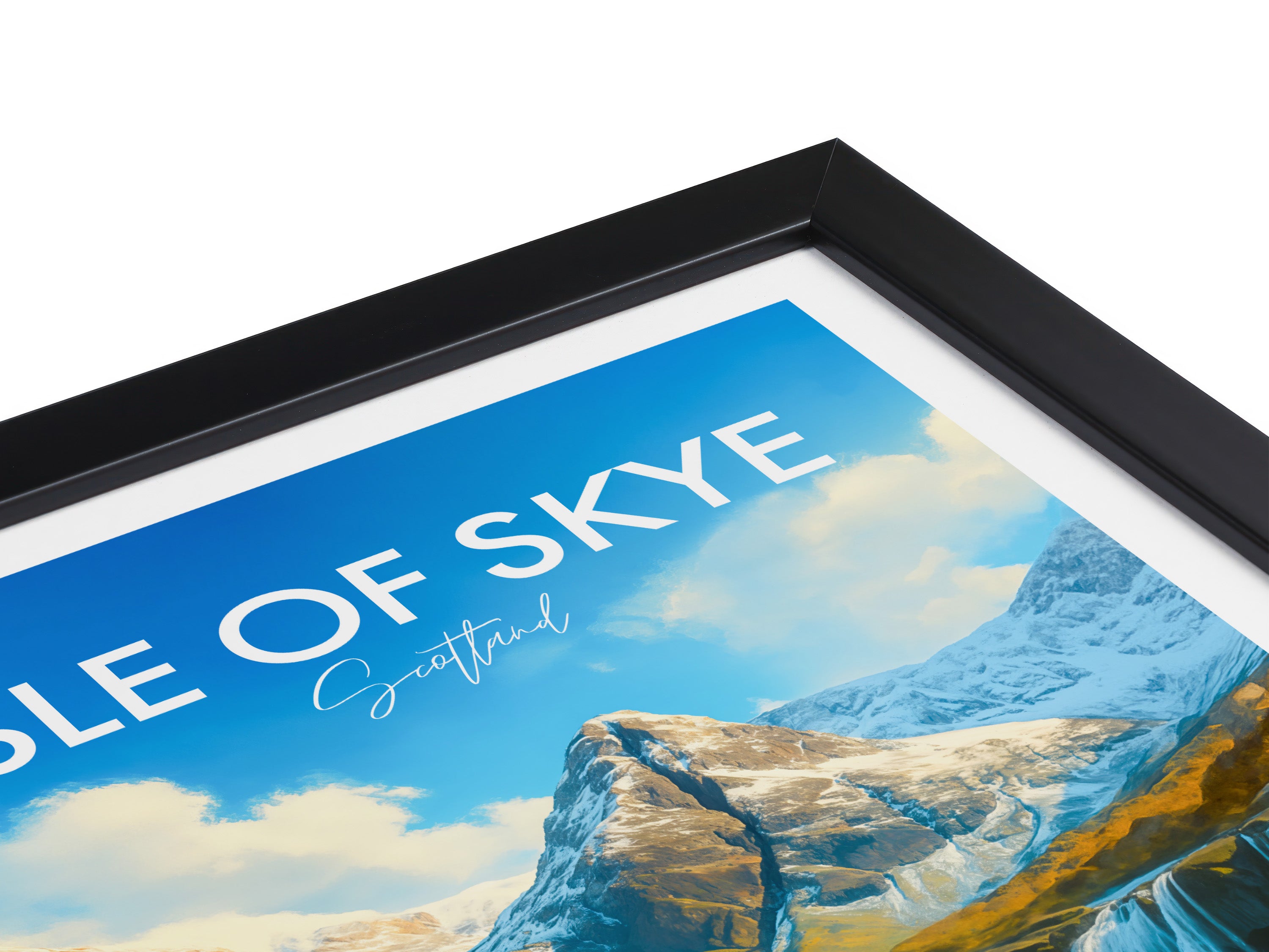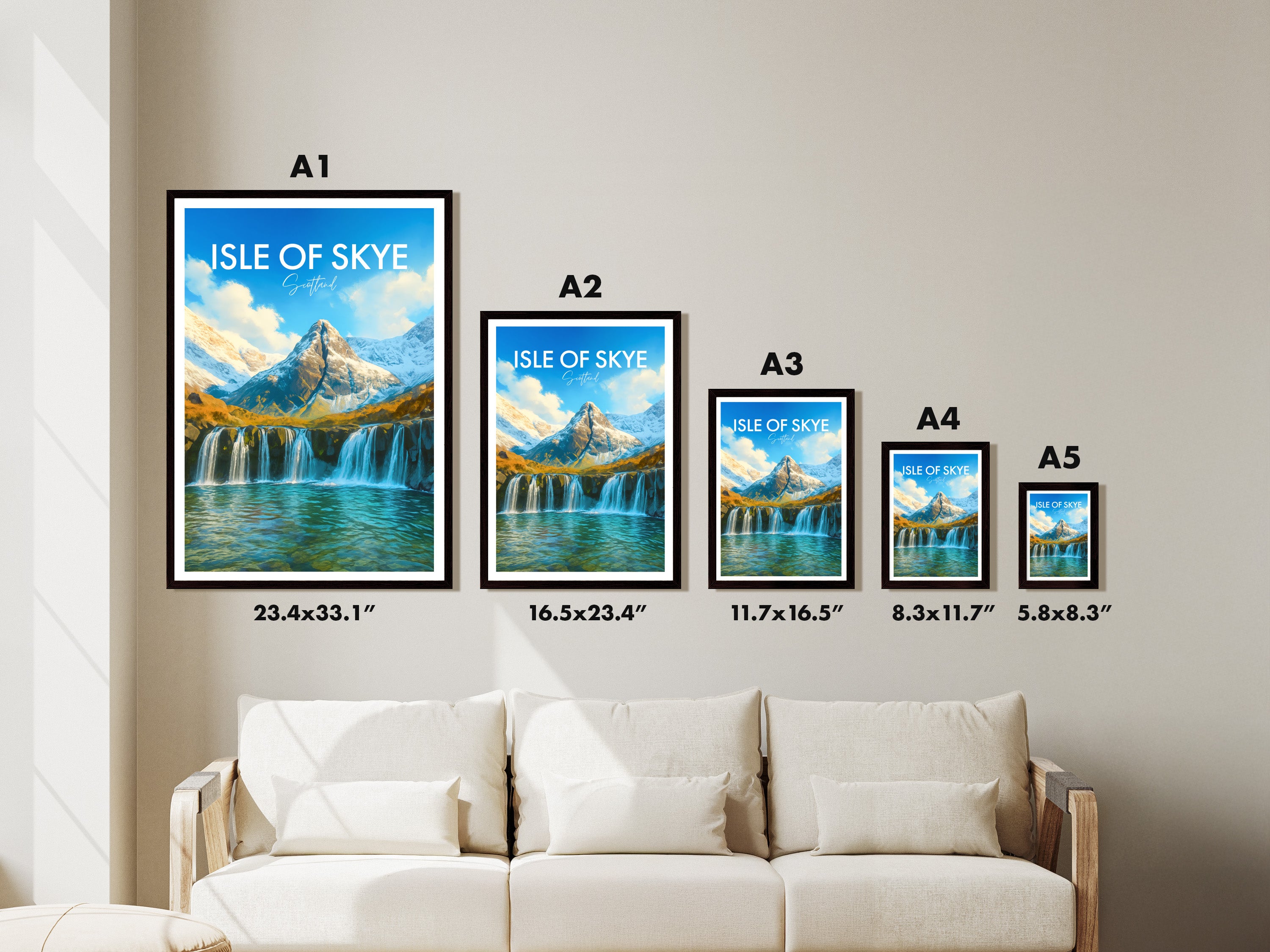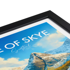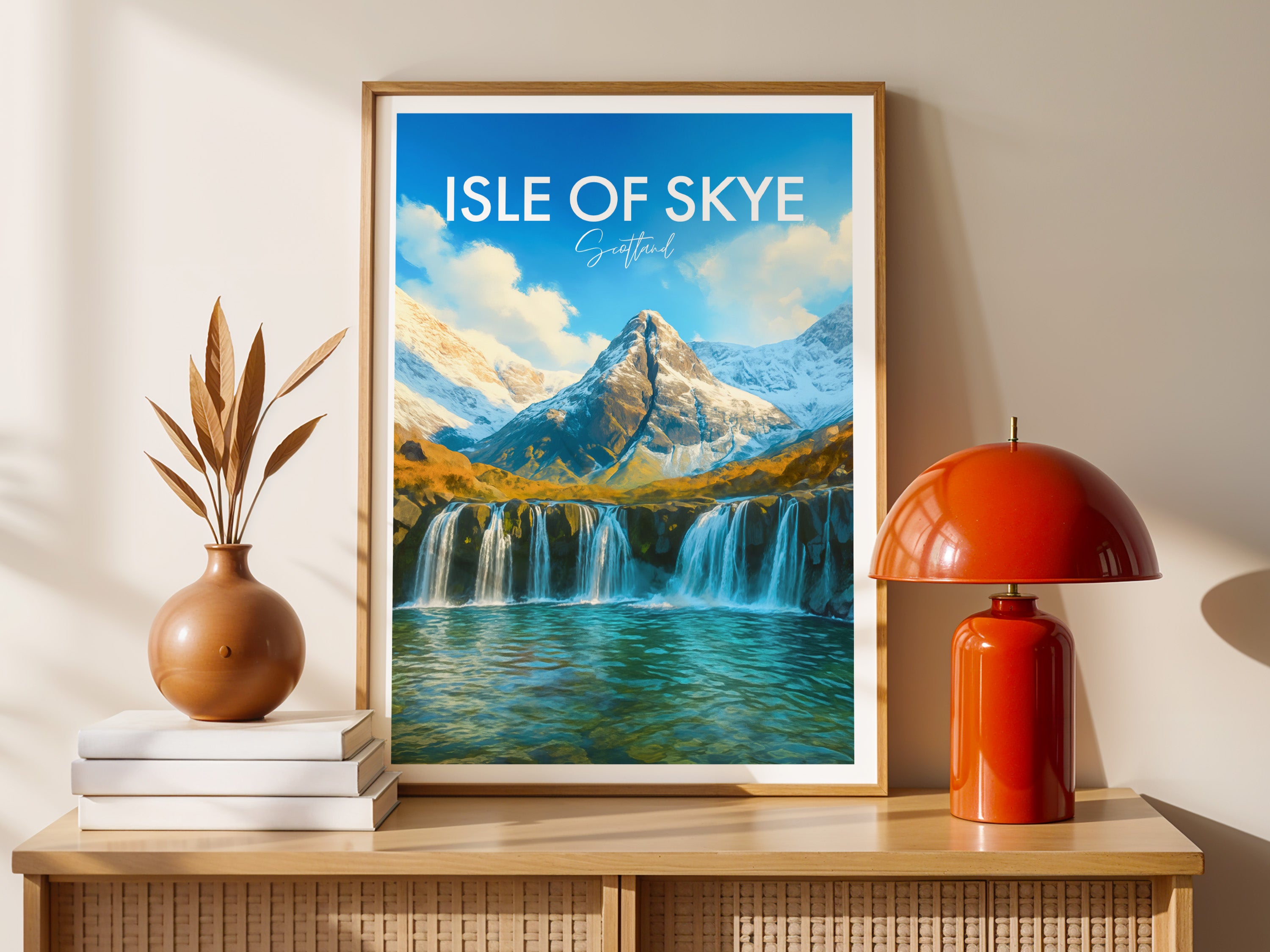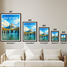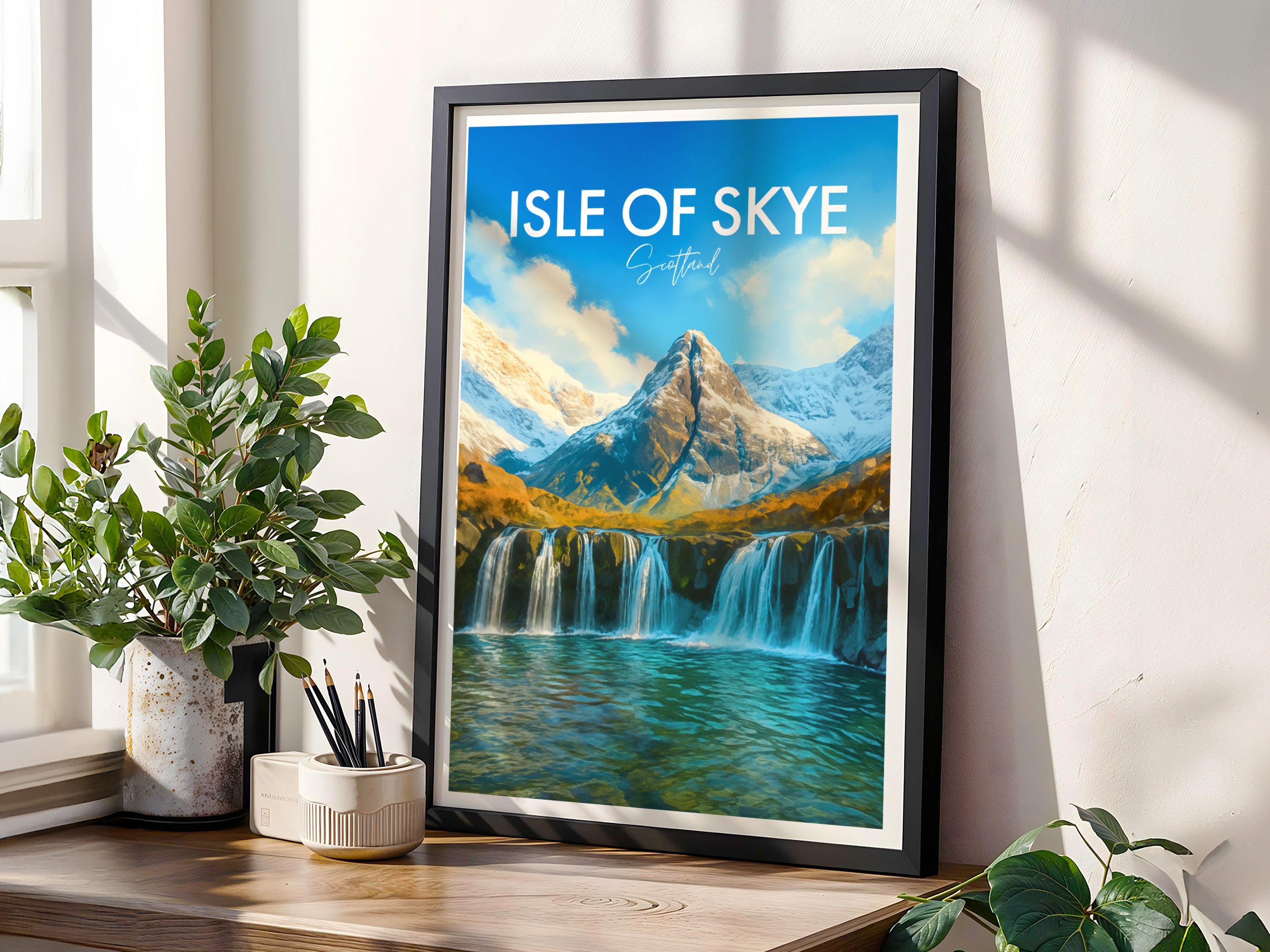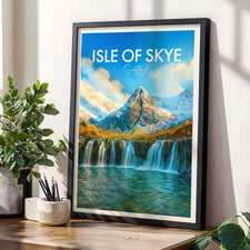 Crystal-clear waterfalls cascade into turquoise pools beneath rugged peaks on the Isle of Skye. This illustrated print celebrates the magic of Scotland’s famous Fairy Pools.