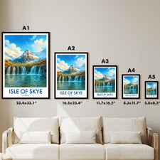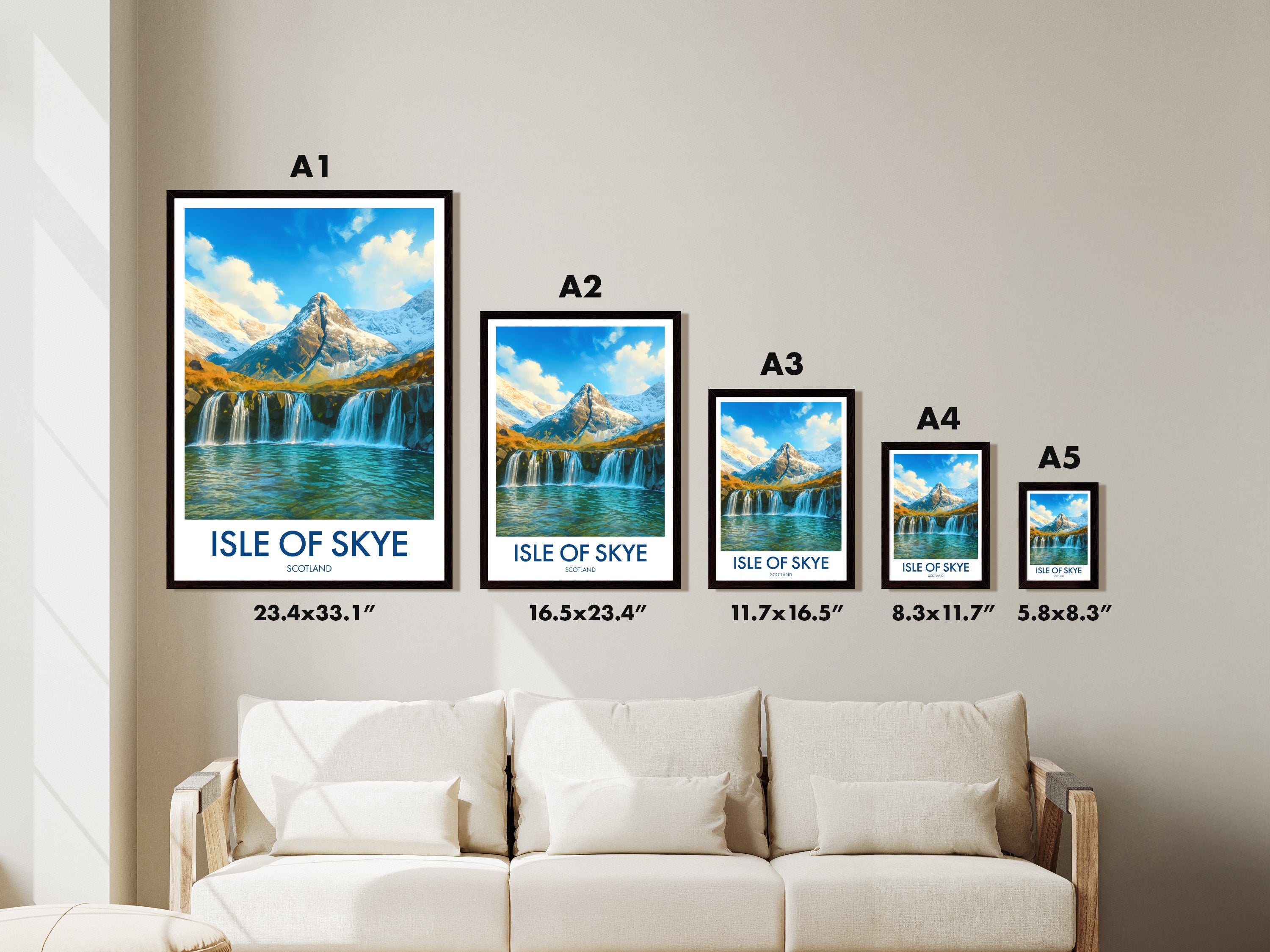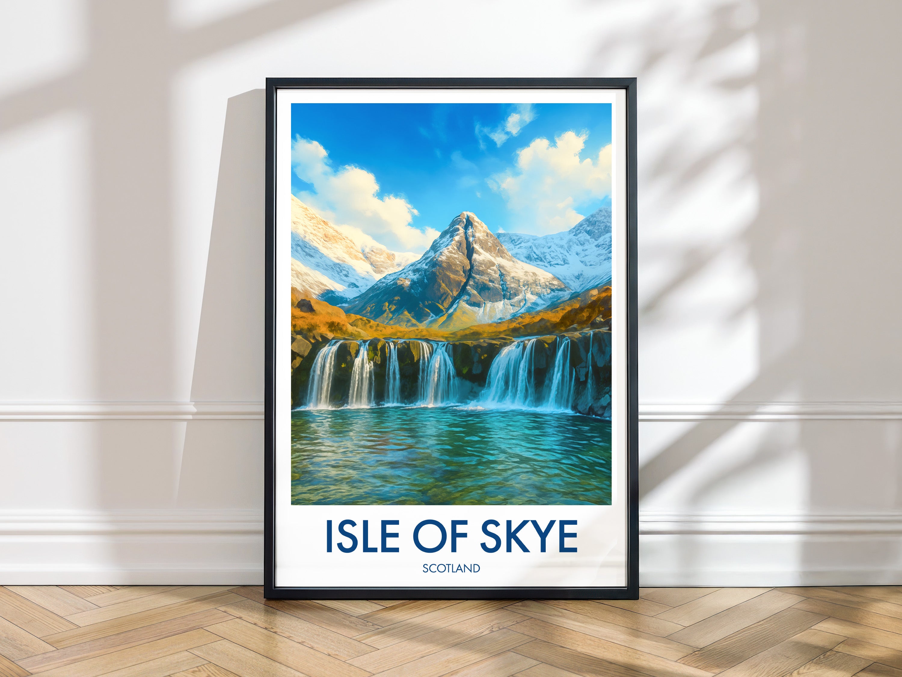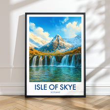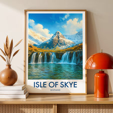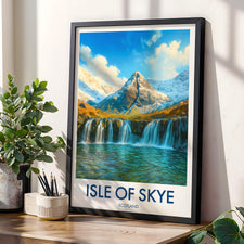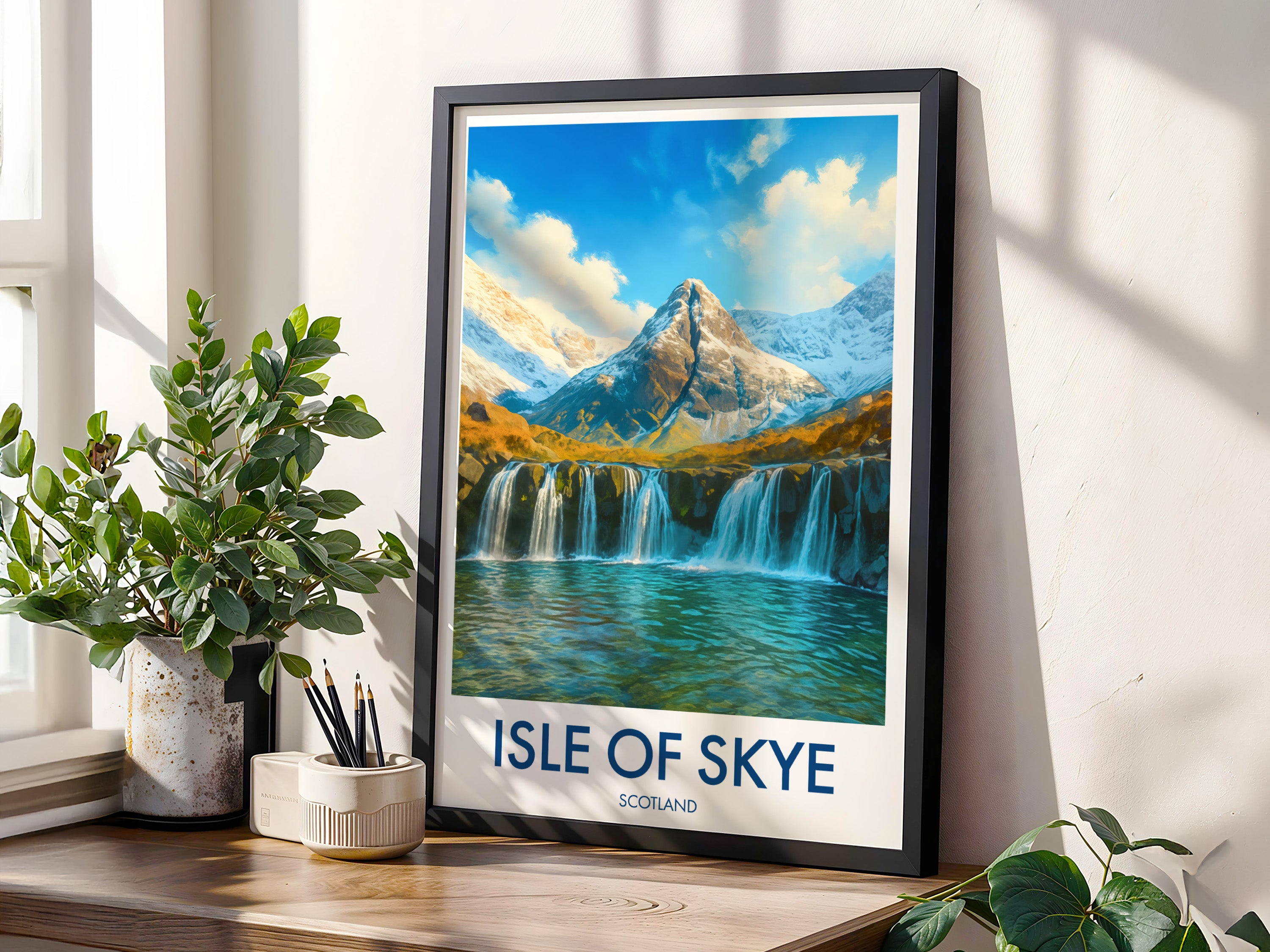 Crystal-clear waterfalls cascade into turquoise pools beneath rugged peaks on the Isle of Skye. This illustrated print celebrates the magic of Scotland’s famous Fairy Pools.