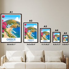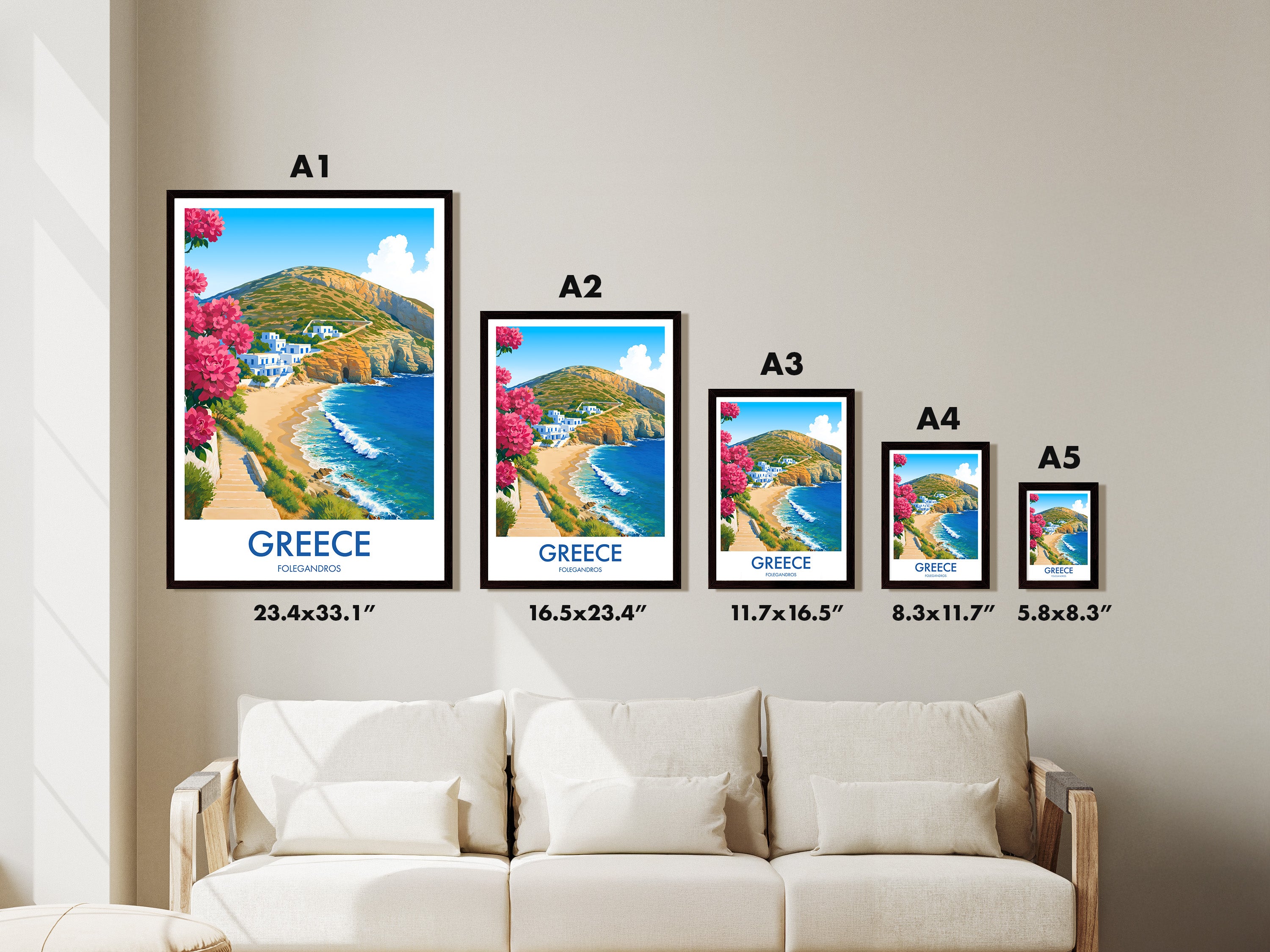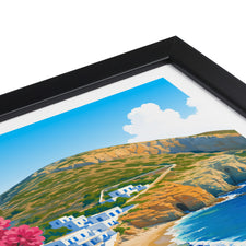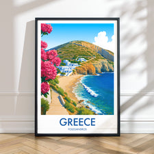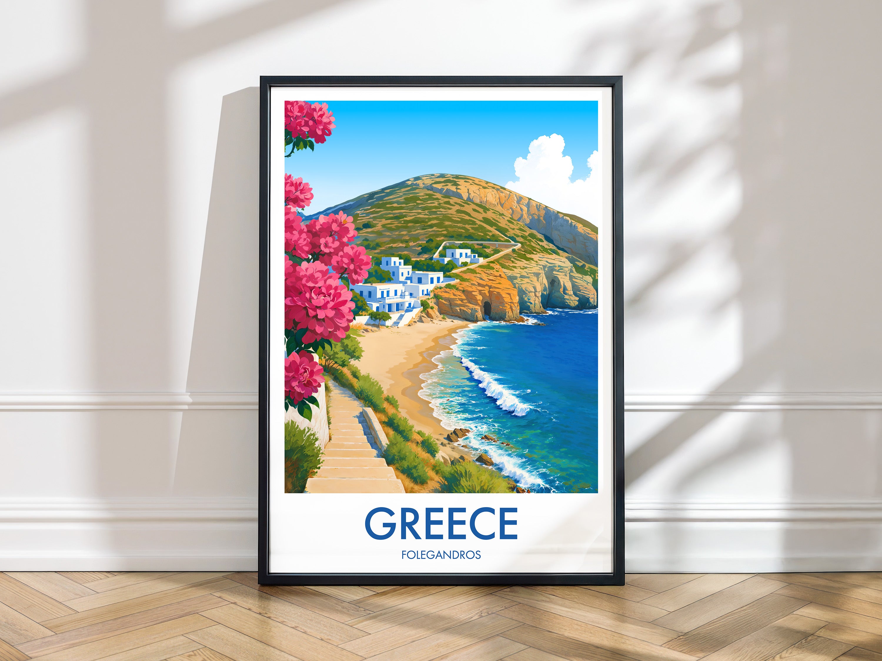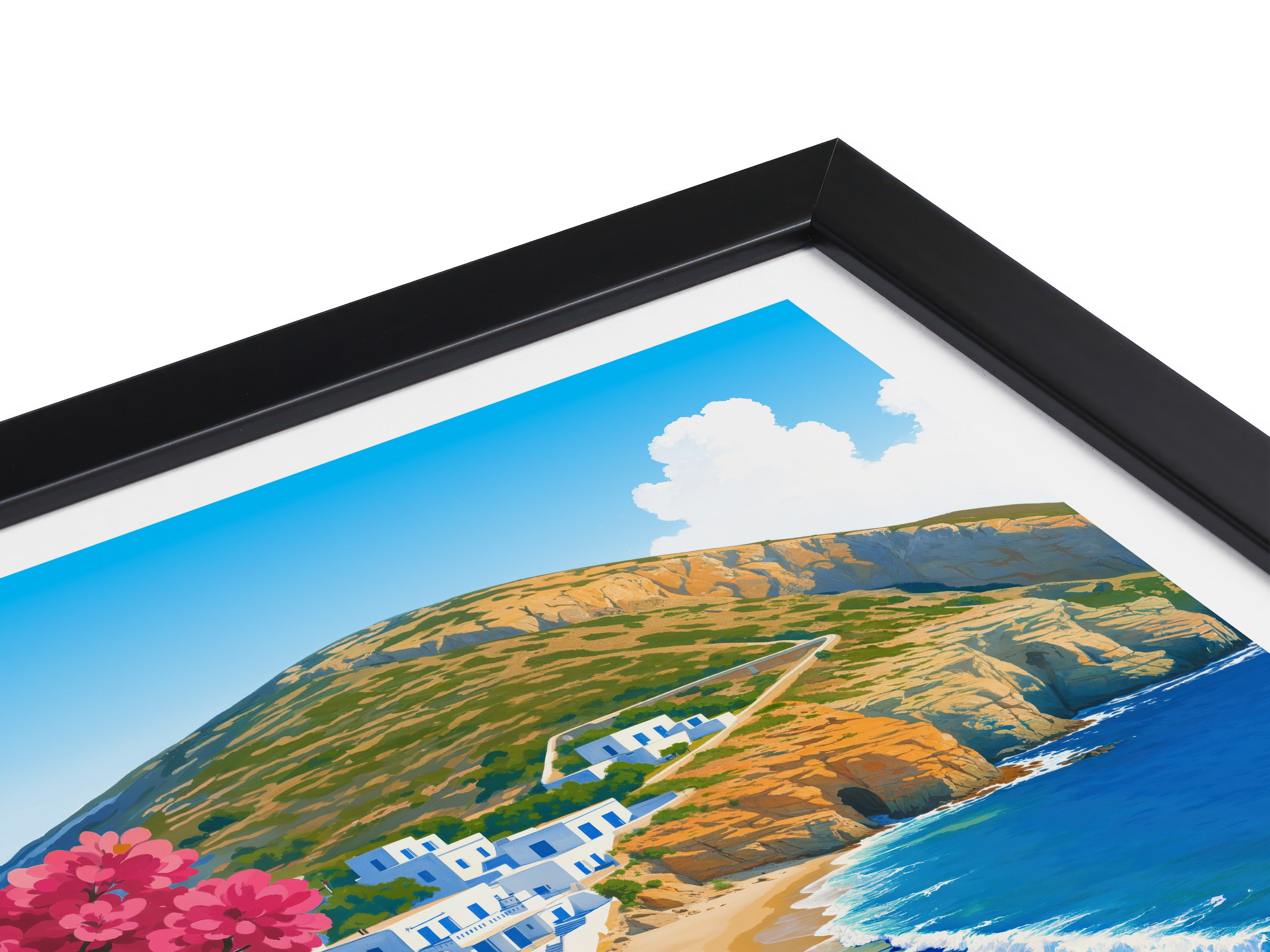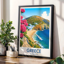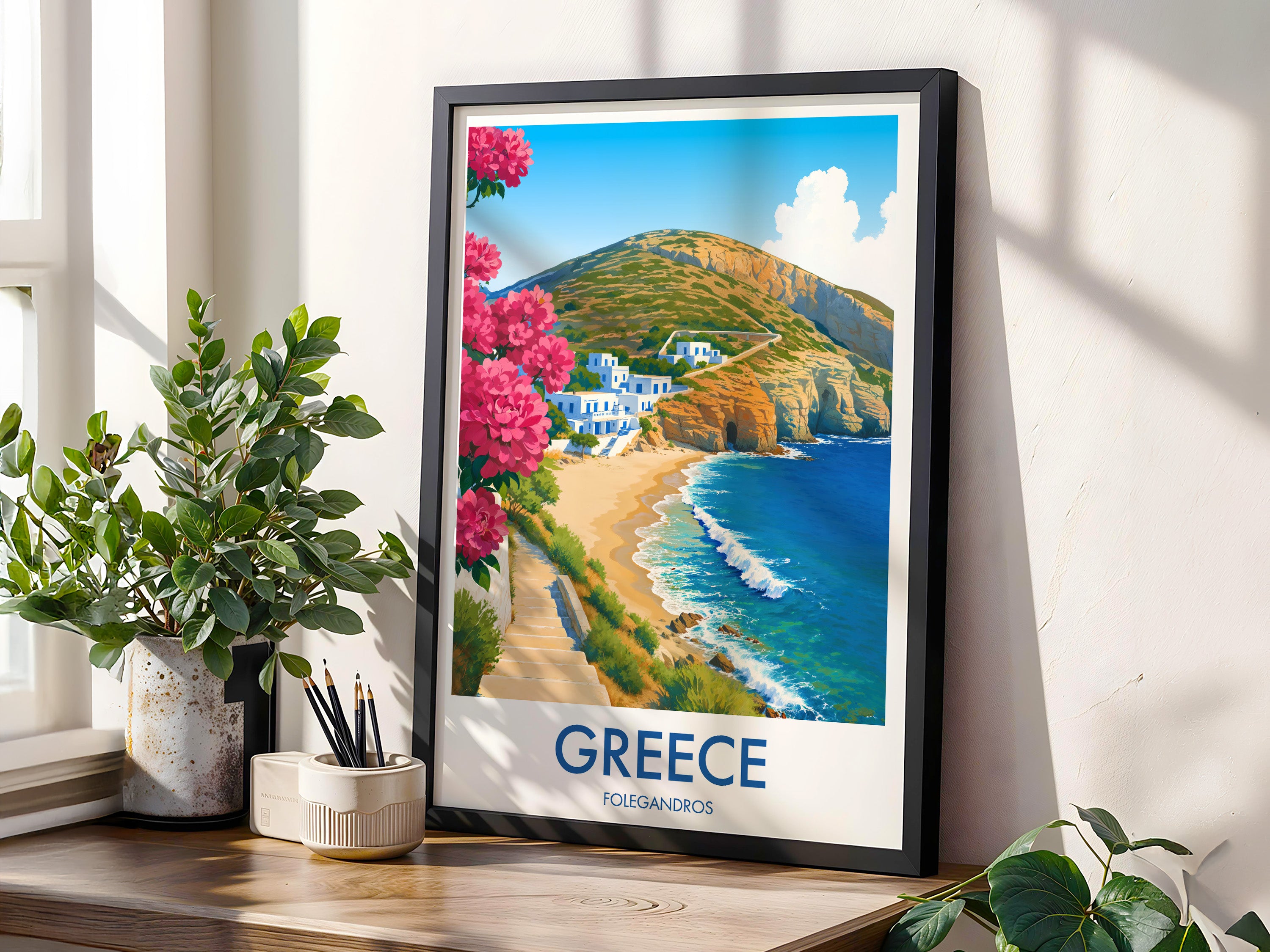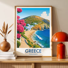 Capture the laid-back beauty of the Cyclades with this illustrated print of Folegandros. With whitewashed houses, golden cliffs, and blooming bougainvillaea, it’s a vivid portrait of Greek island life.