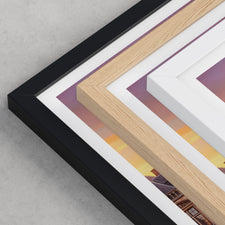 Framed options use sustainably sourced wooden frames in black, white, or natural wood, ready to hang.