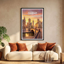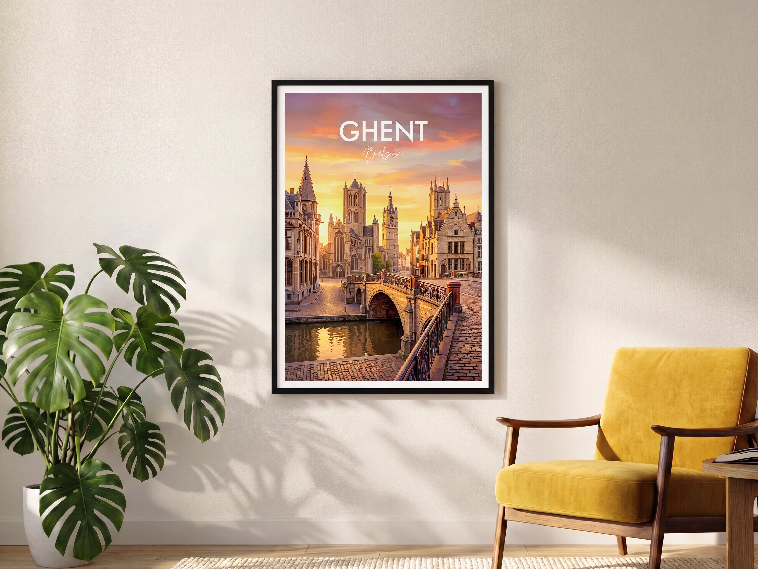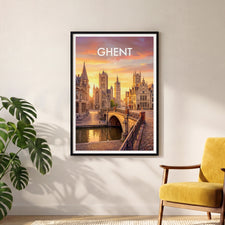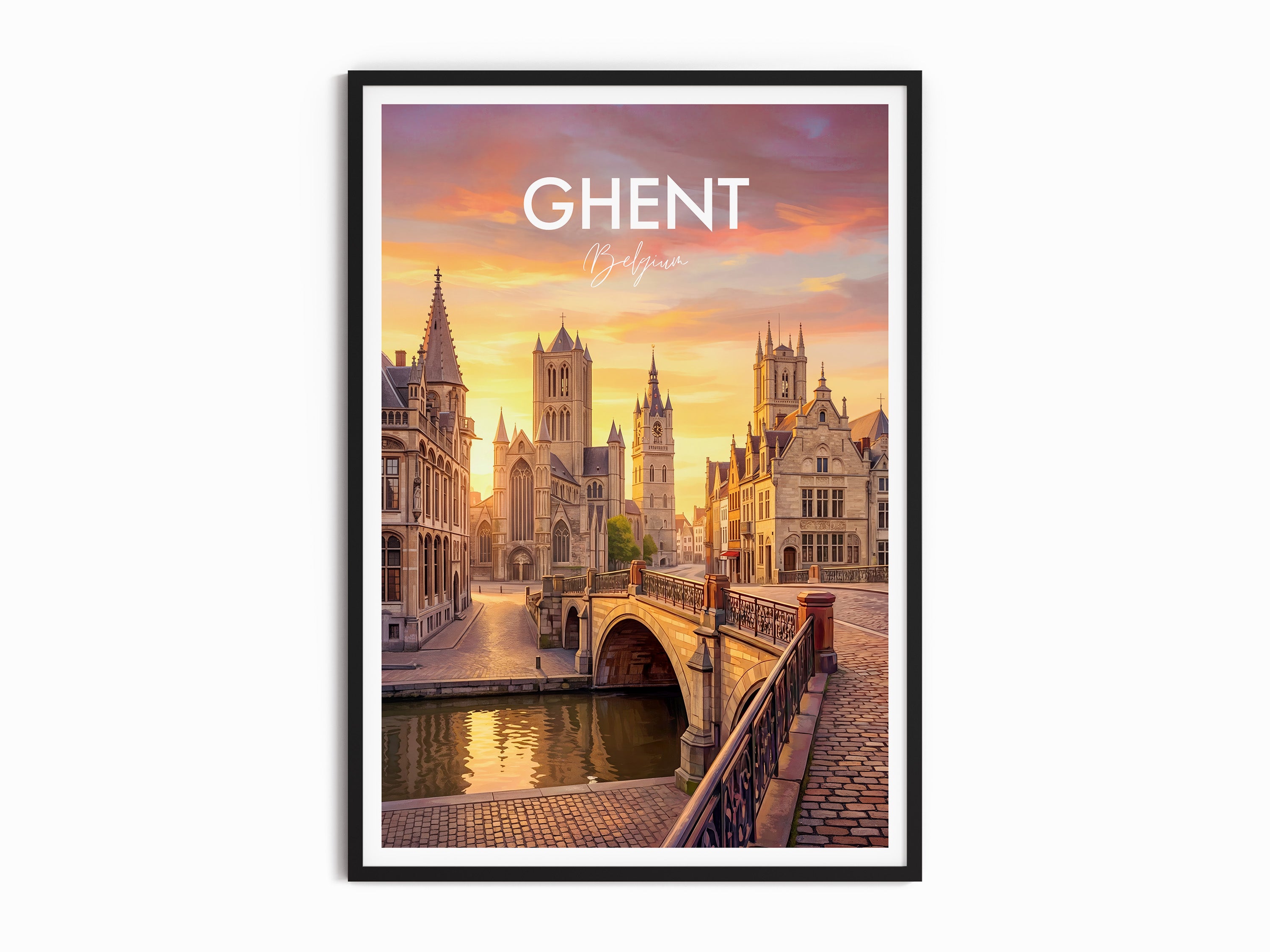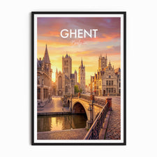 Discover the charm of Belgium with this Ghent print. Featuring the iconic Saint Michael's Bridge at sunset, this travel poster captures the historic bridge and charming canal below. Perfect as home wall art, a memorable gift, or a unique souvenir, it brings the beauty of Ghent right to your space. Ideal for living rooms, bedrooms, and office decor.
