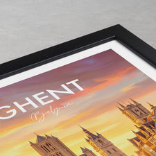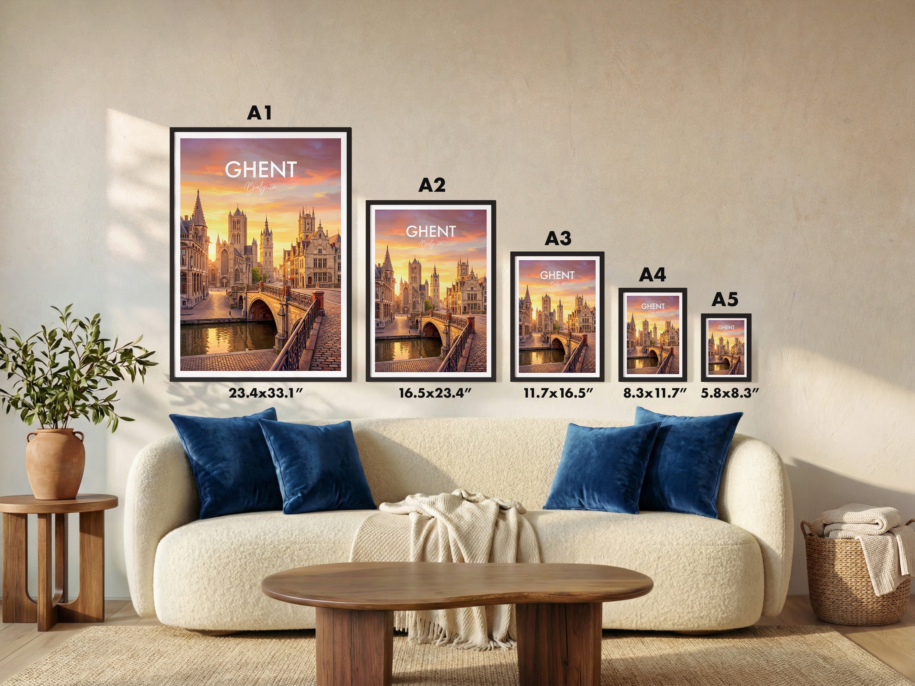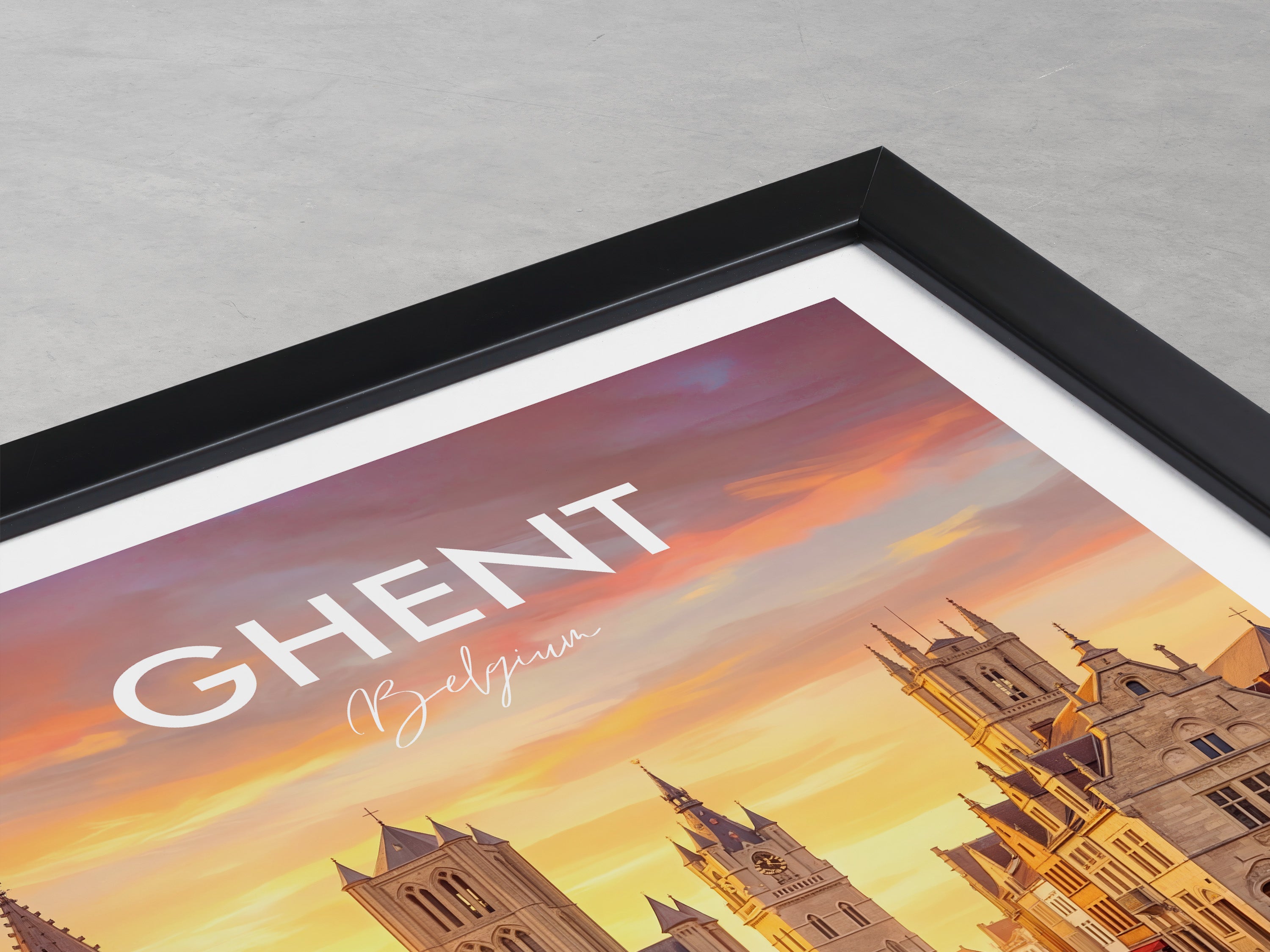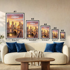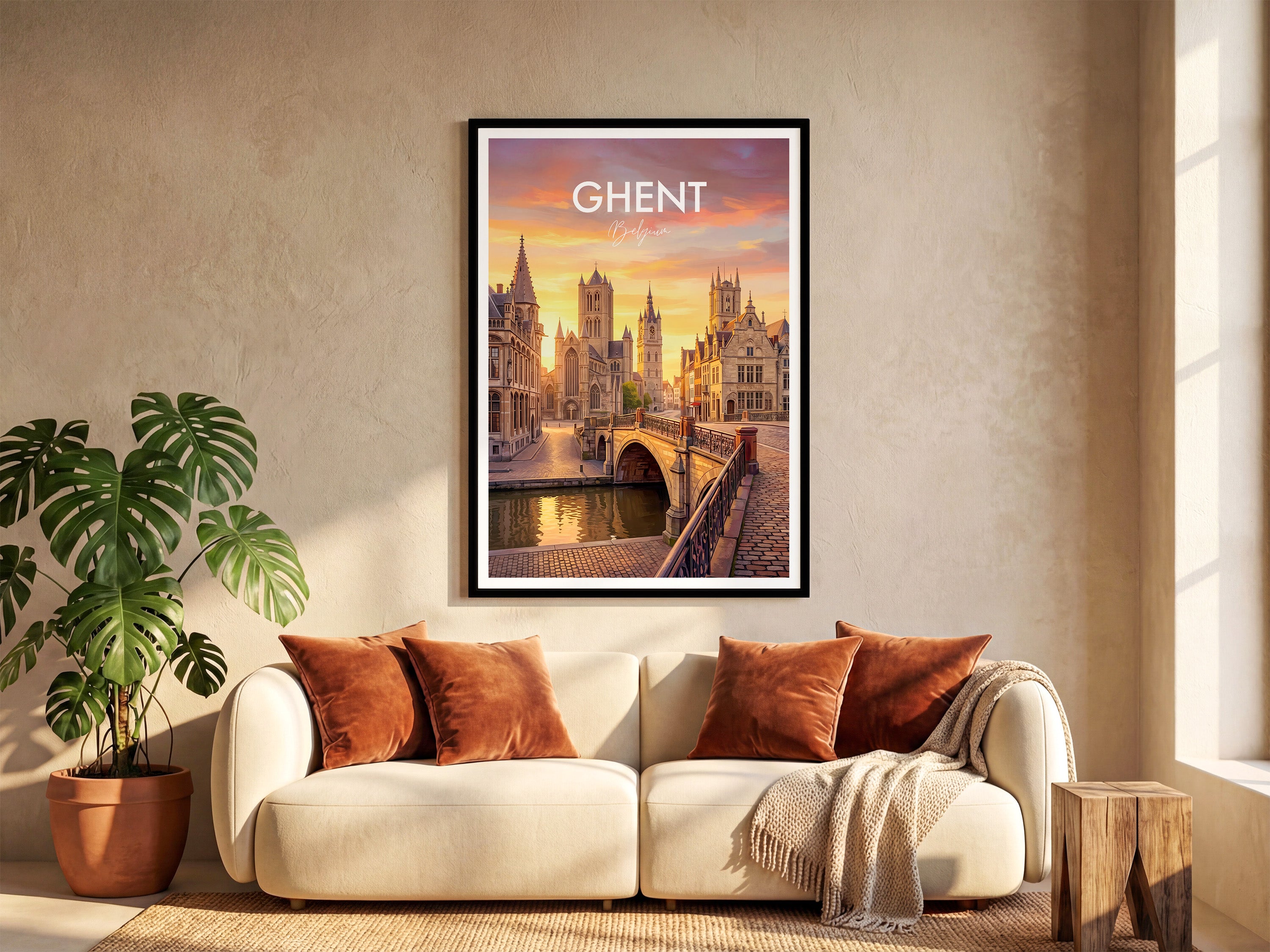 Discover the charm of Belgium with this Ghent print. Featuring the iconic Saint Michael's Bridge at sunset, this travel poster captures the historic bridge and charming canal below. Perfect as home wall art, a memorable gift, or a unique souvenir, it brings the beauty of Ghent right to your space. Ideal for living rooms, bedrooms, and office decor.