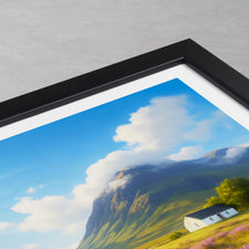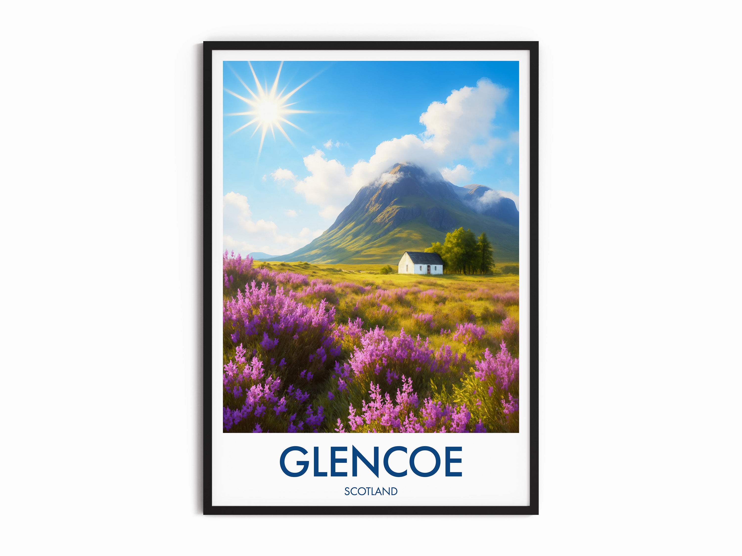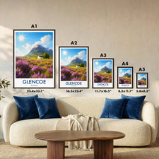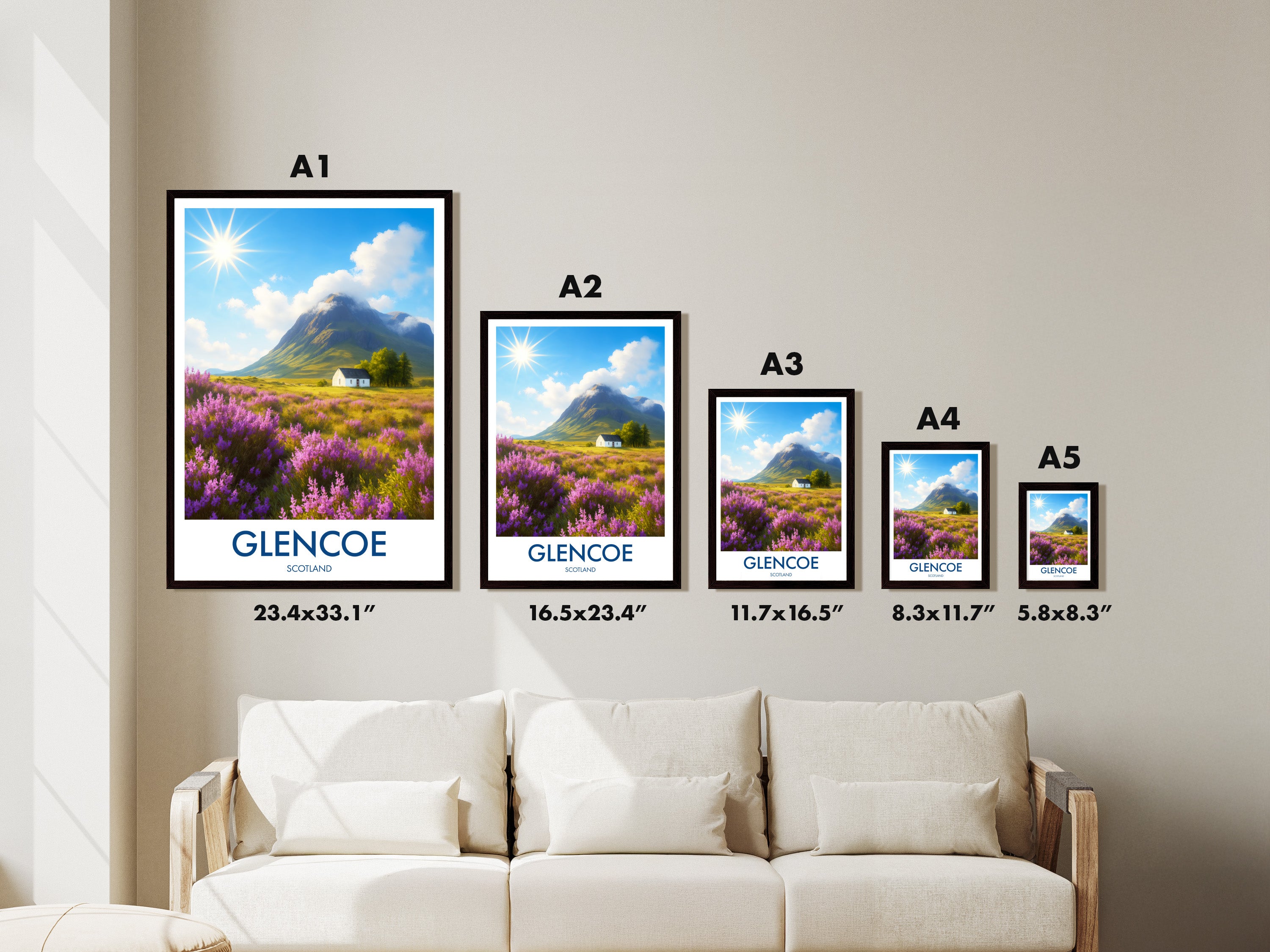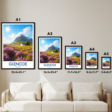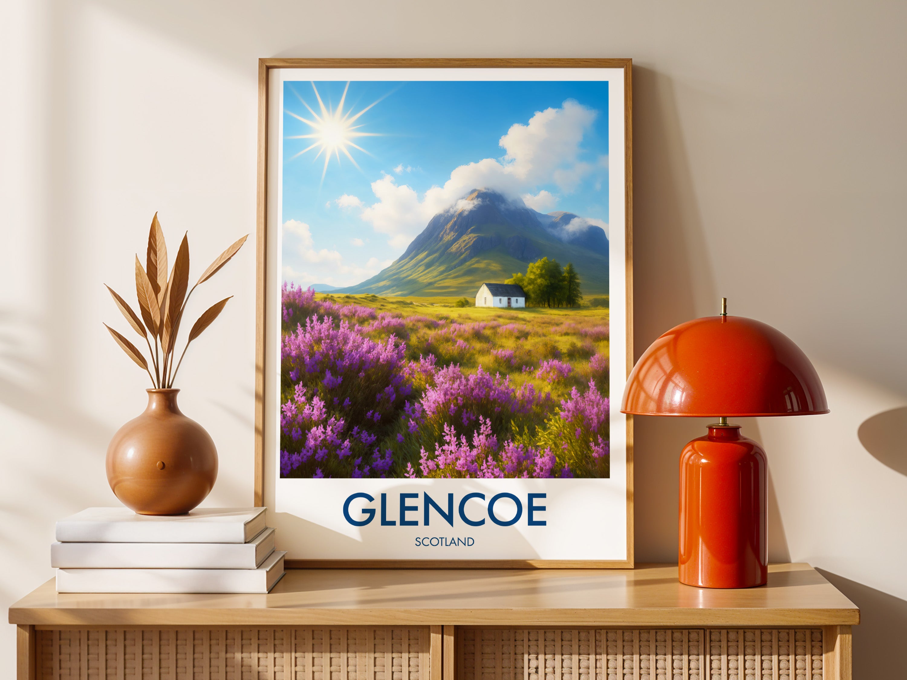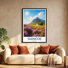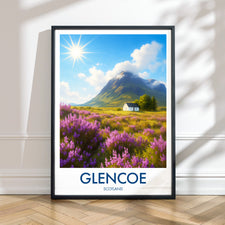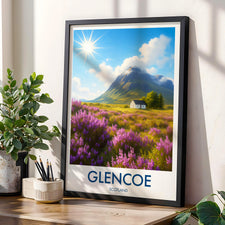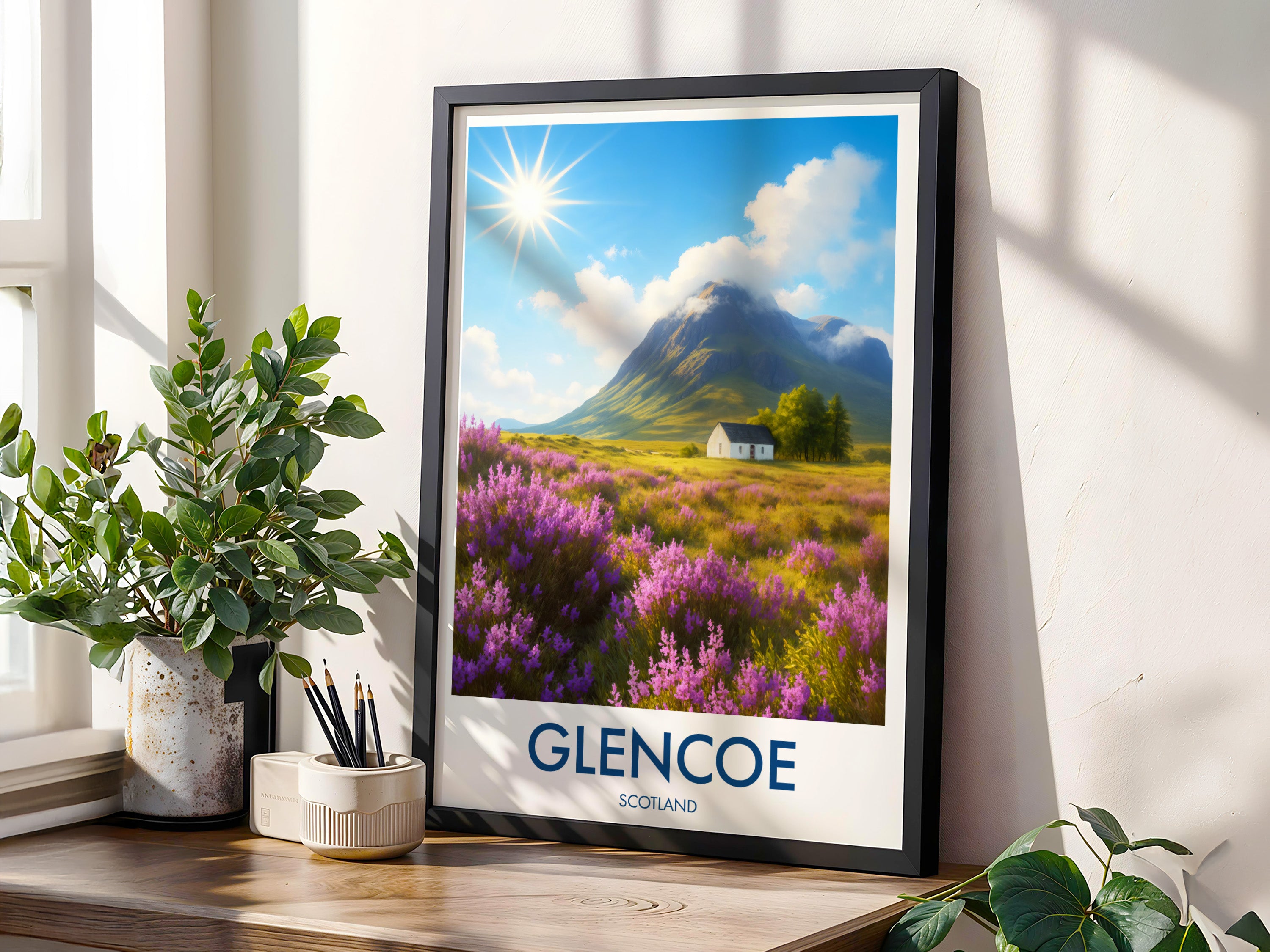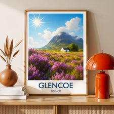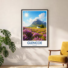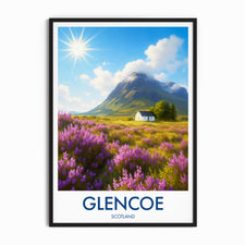 Purple heather fields stretch across the Highlands with a lone white cottage framed by dramatic peaks. This illustrated print captures the timeless beauty of Glencoe.