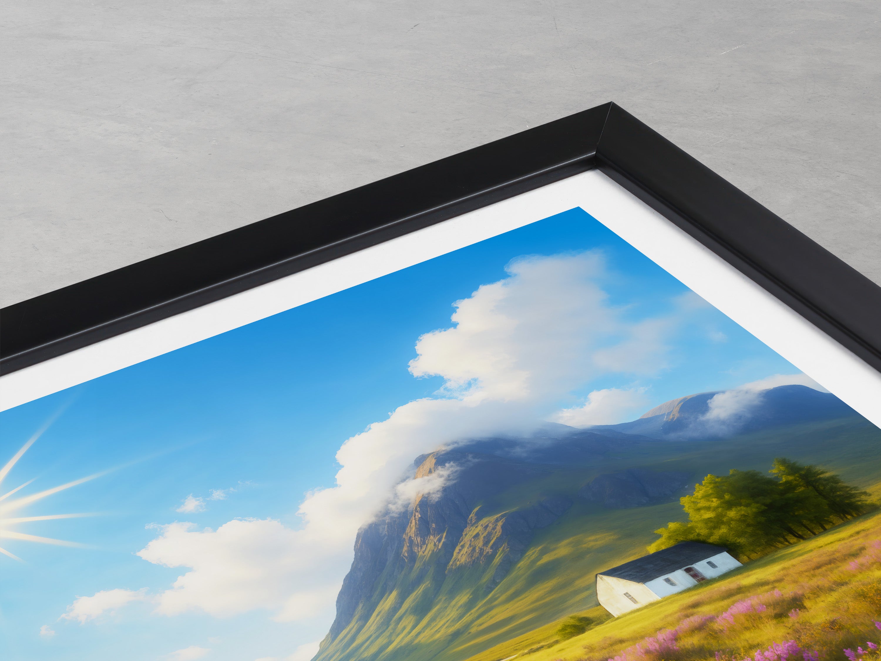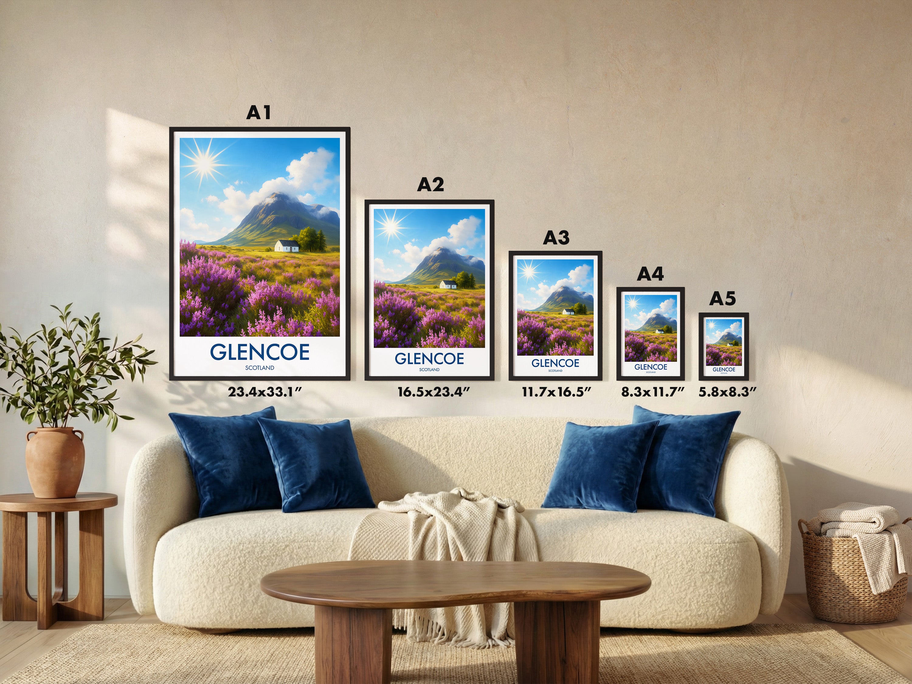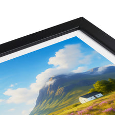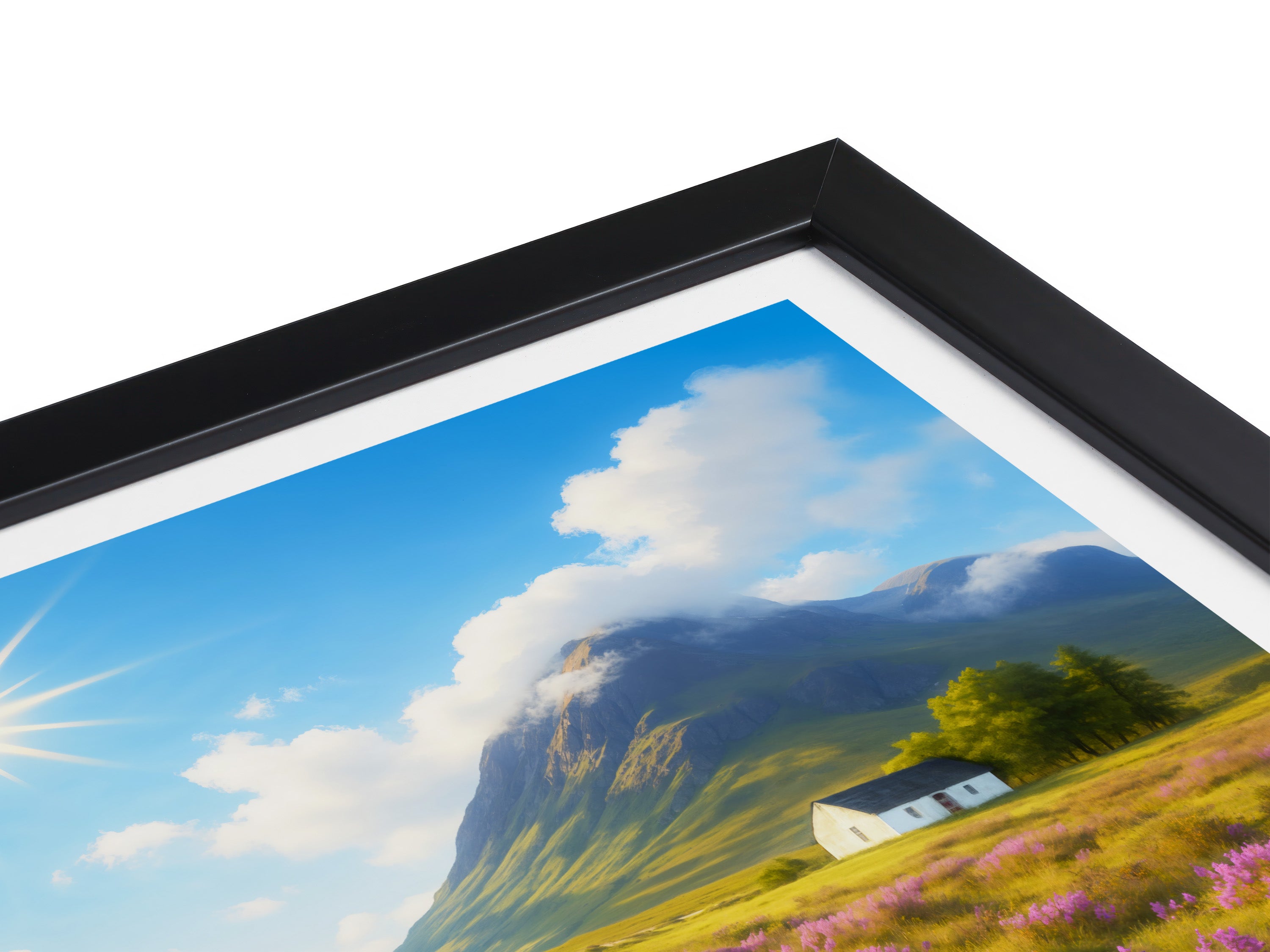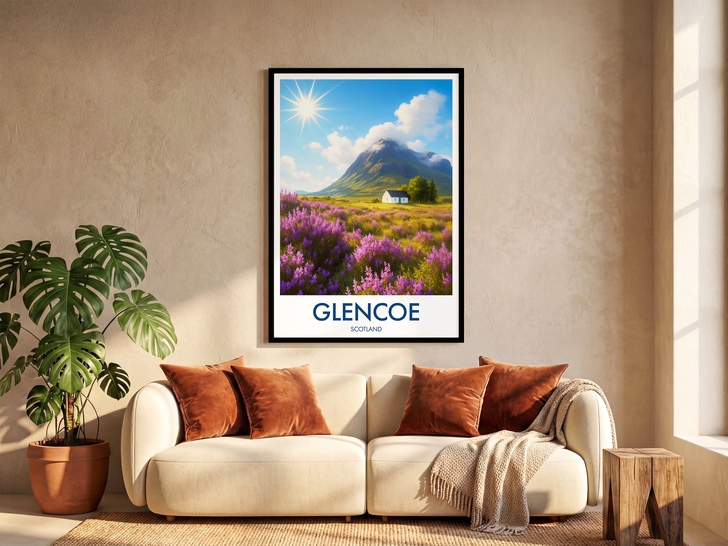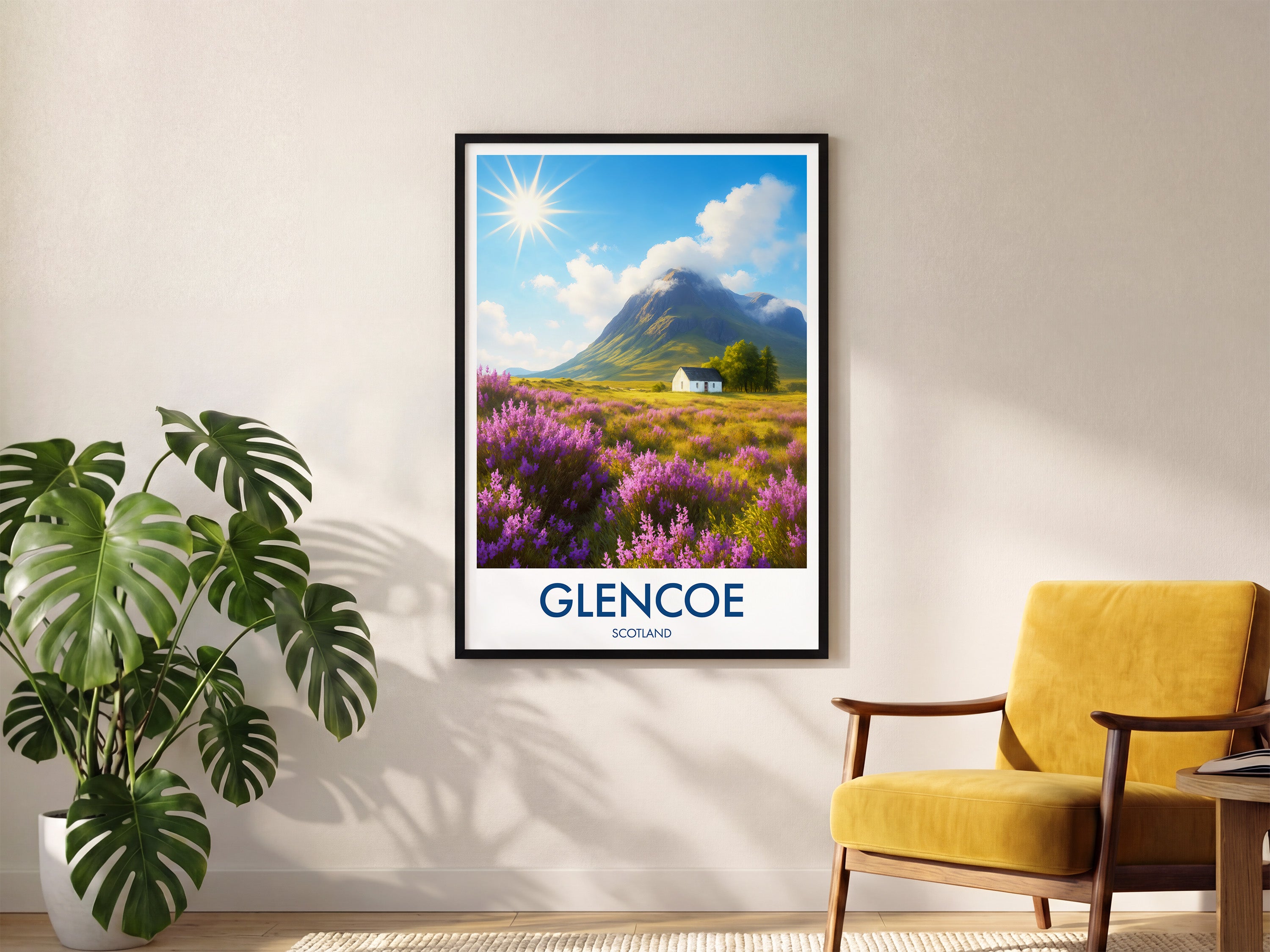 Purple heather fields stretch across the Highlands with a lone white cottage framed by dramatic peaks. This illustrated print captures the timeless beauty of Glencoe.