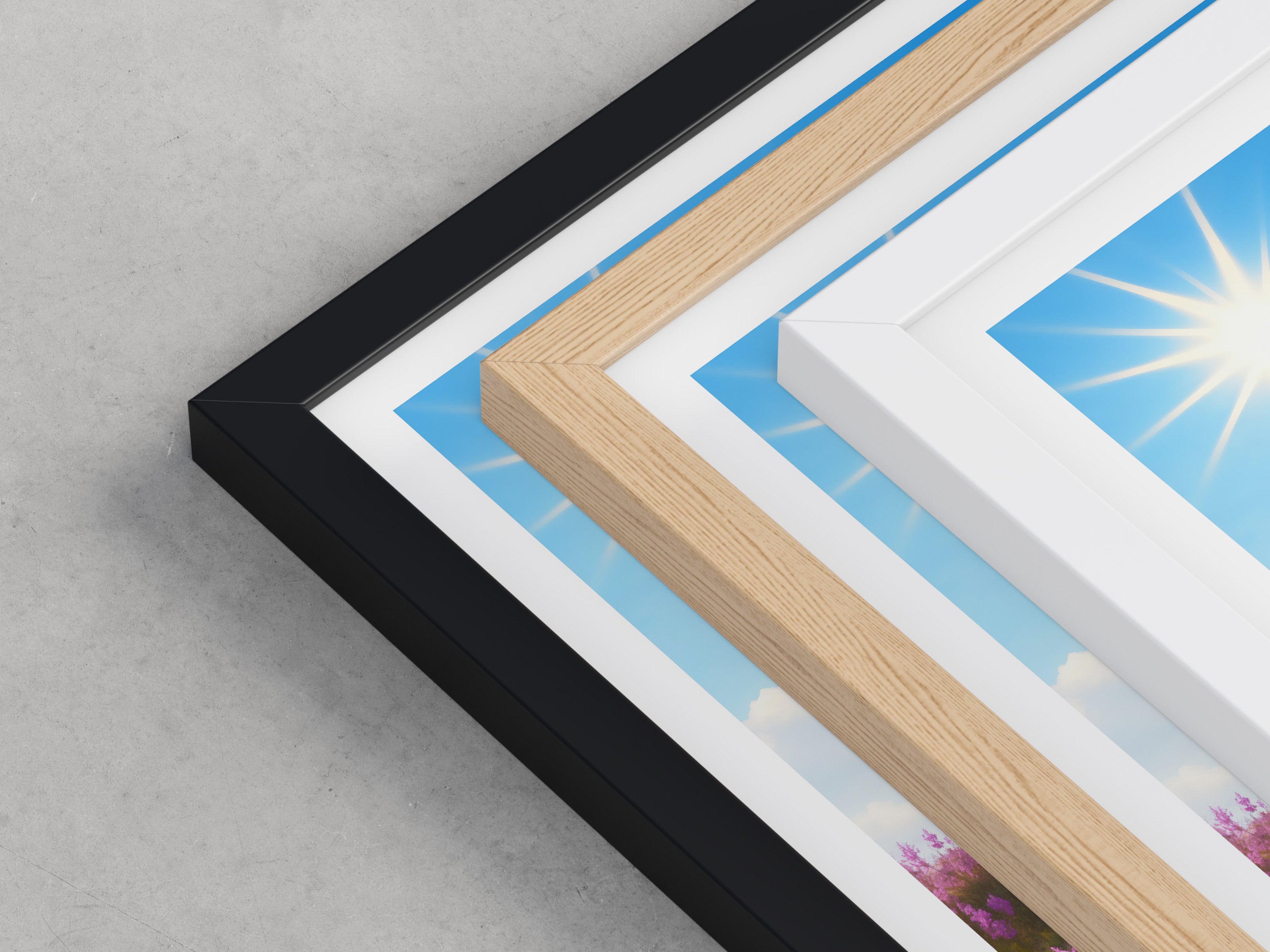 Framed options use sustainably sourced wooden frames in black, white, or natural wood, ready to hang.