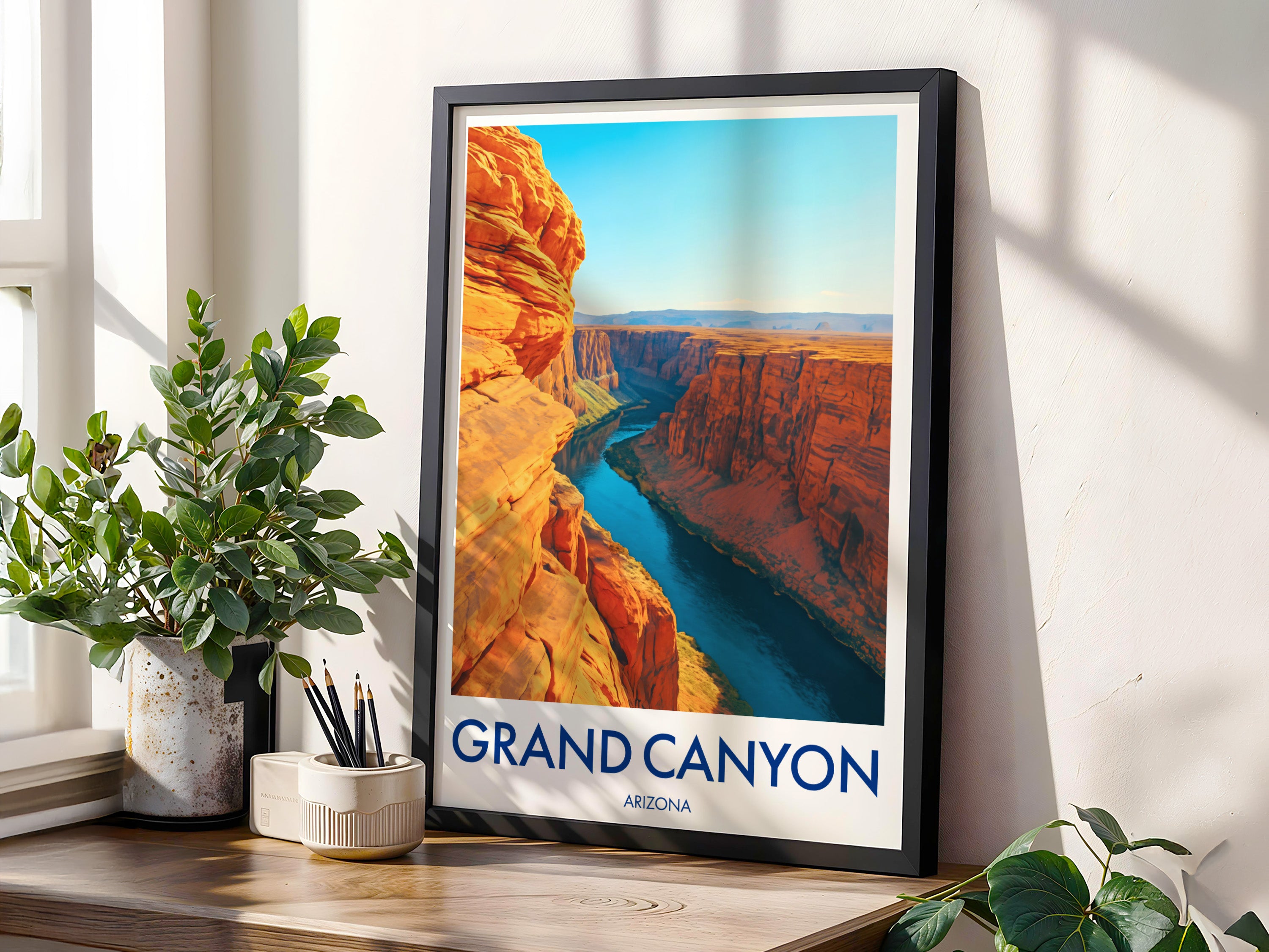 The Colorado River winds through sheer red cliffs of the Grand Canyon, carving deep gorges into the desert. This illustrated print showcases the canyon’s scale and timeless beauty.