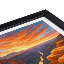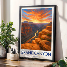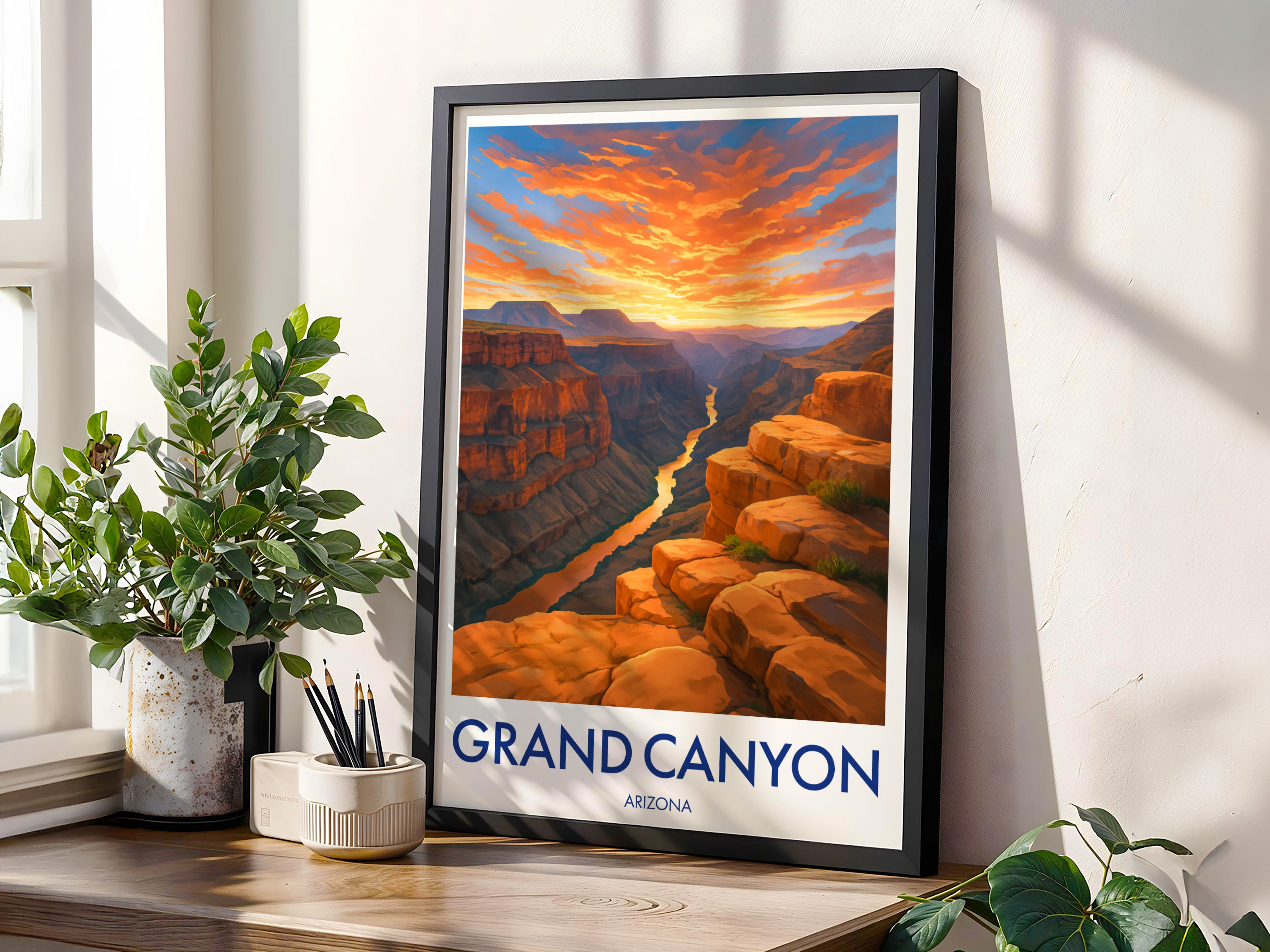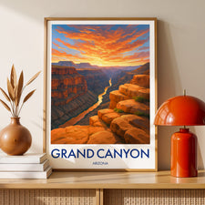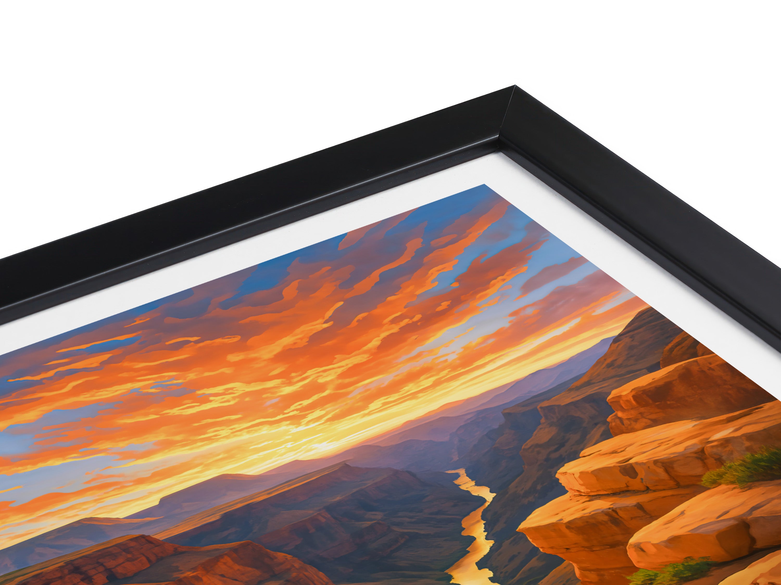 Toroweap Overlook in Arizona’s Grand Canyon, sheer cliffs plunge to the Colorado River as sunset lights the sky. This illustrated print captures the canyon’s raw, natural beauty.