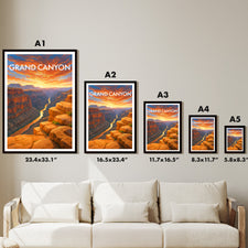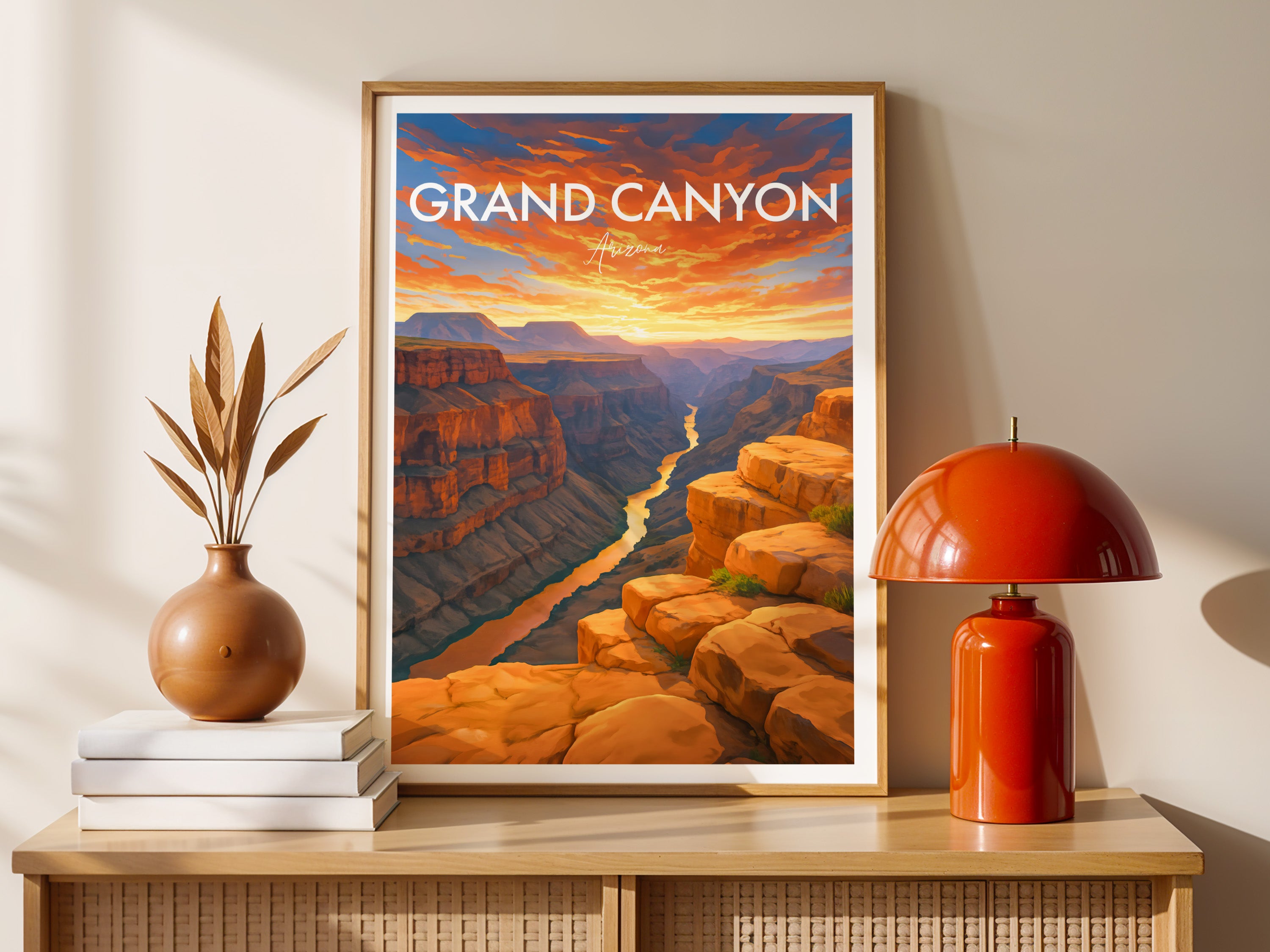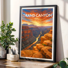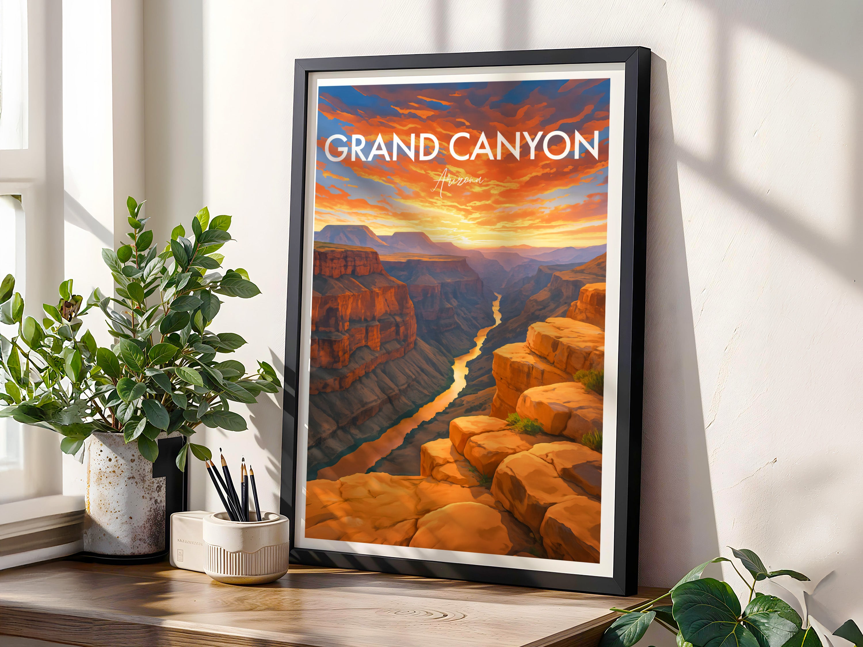Toroweap Overlook in Arizona’s Grand Canyon, sheer cliffs plunge to the Colorado River as sunset lights the sky. This illustrated print captures the canyon’s raw, natural beauty.