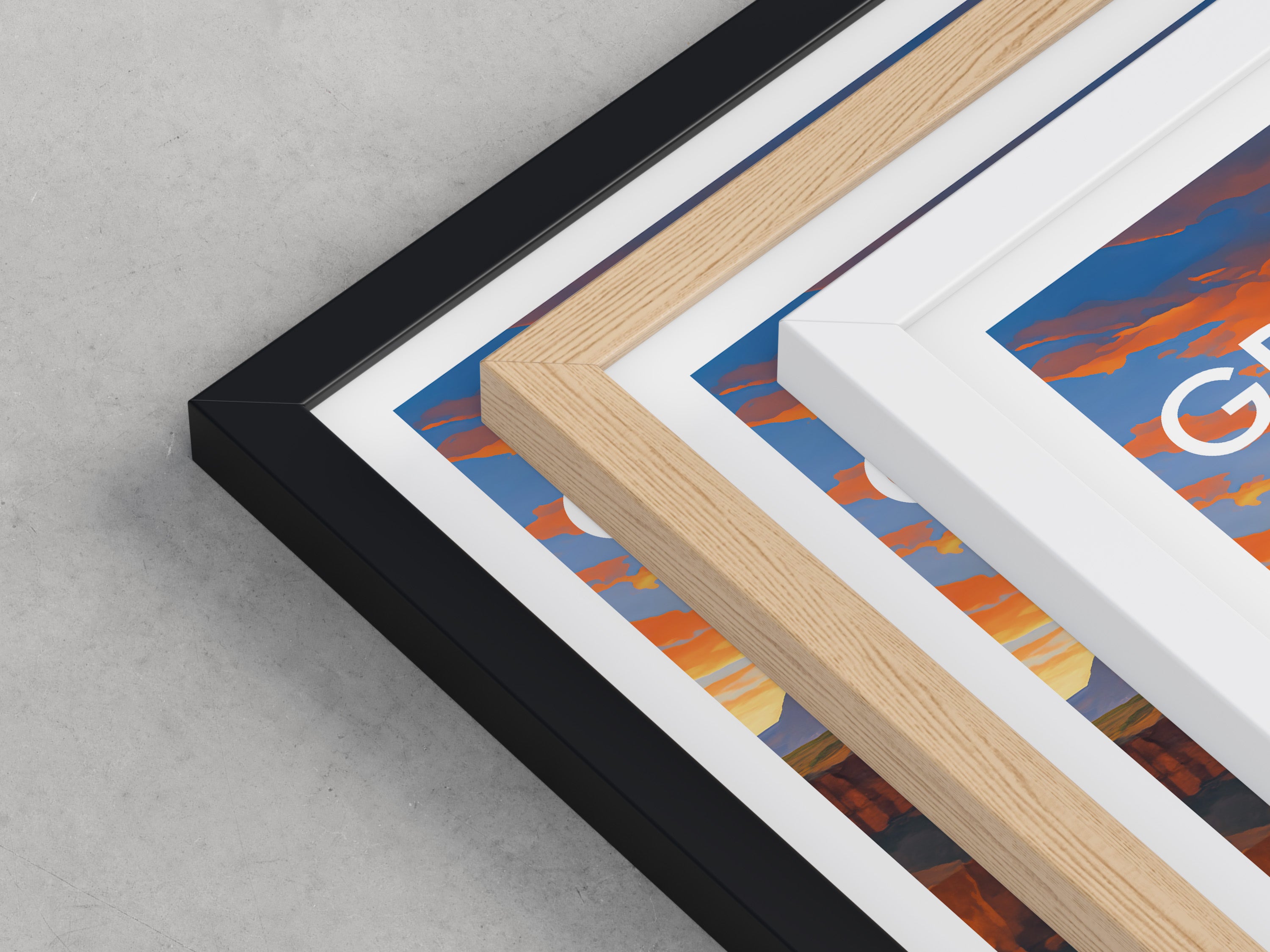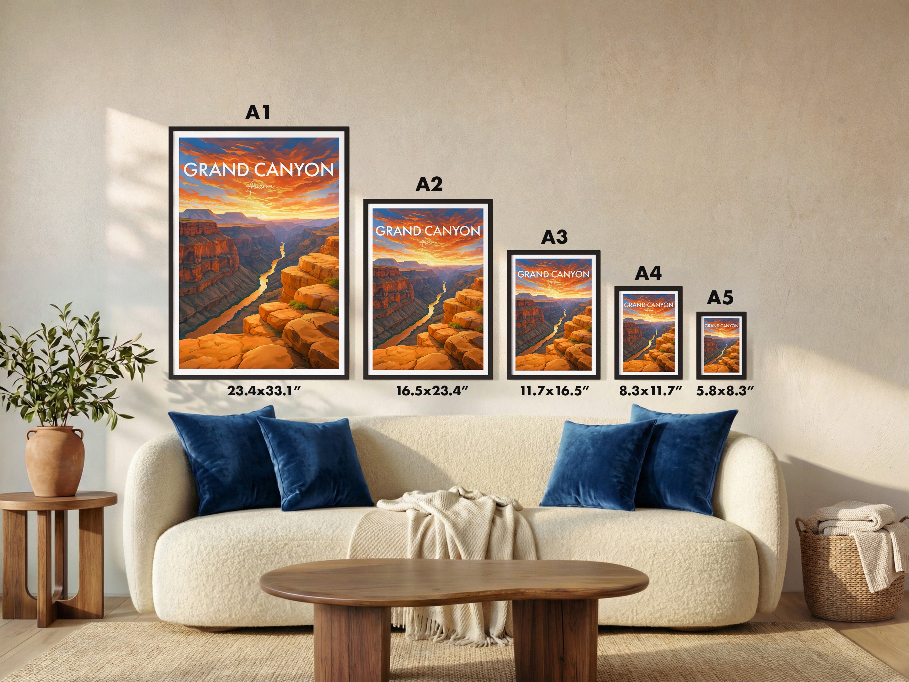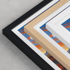 Framed options use sustainably sourced wooden frames in black, white, or natural wood, ready to hang.