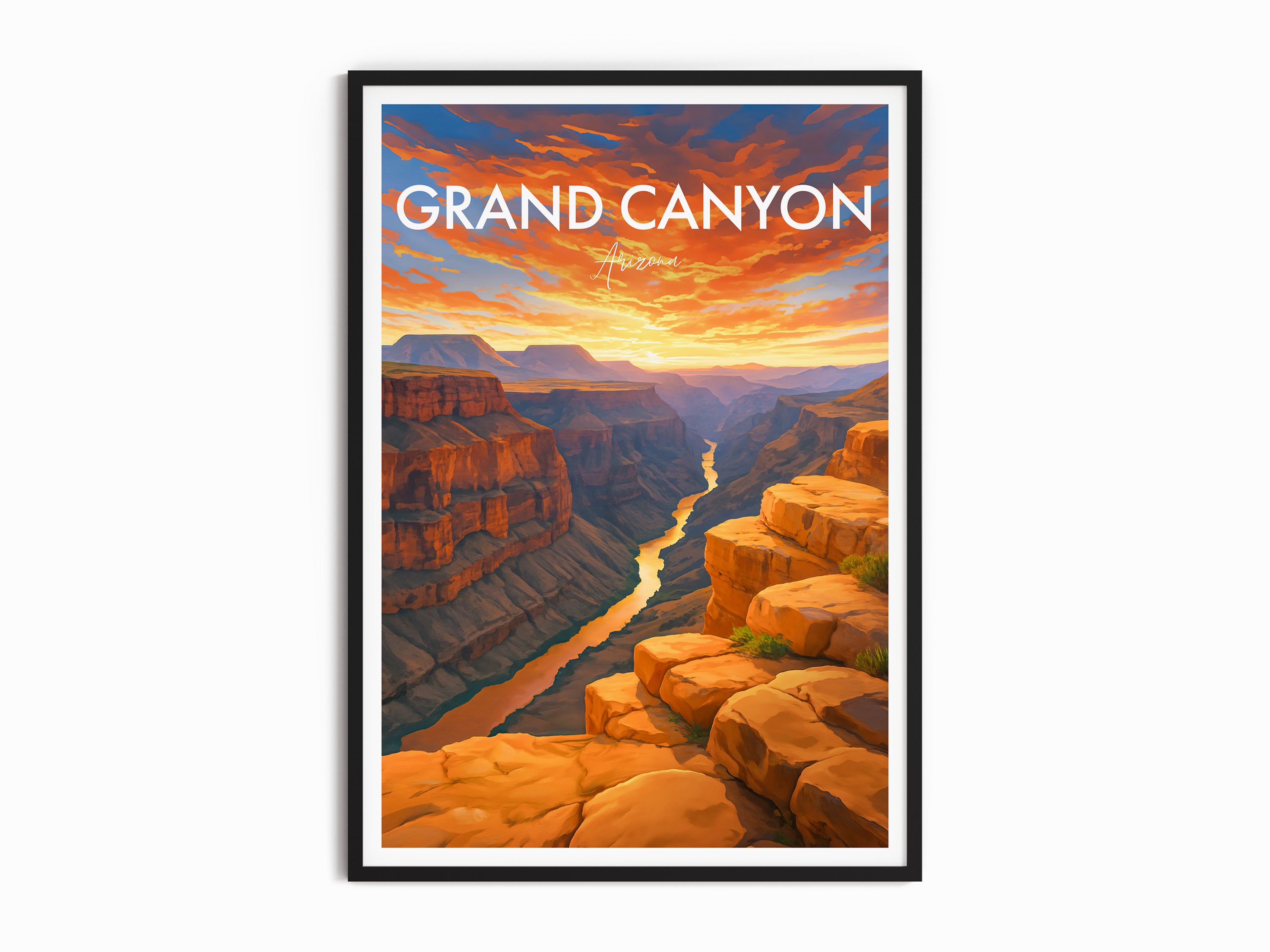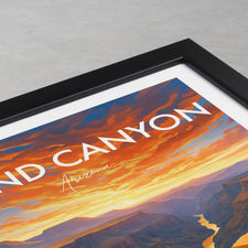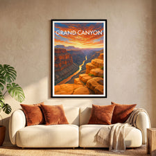 Toroweap Overlook in Arizona’s Grand Canyon, sheer cliffs plunge to the Colorado River as sunset lights the sky. This illustrated print captures the canyon’s raw, natural beauty.