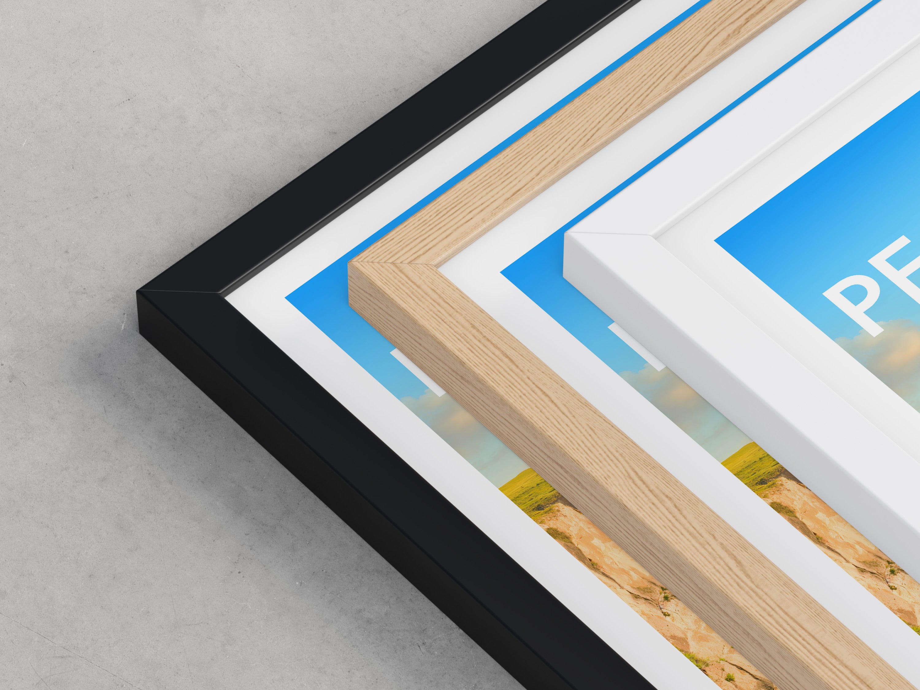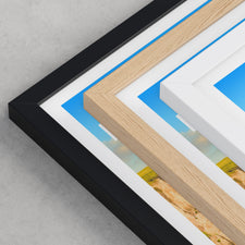 Framed options use sustainably sourced wooden frames in black, white, or natural wood, ready to hang.