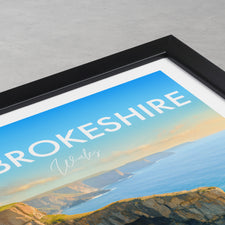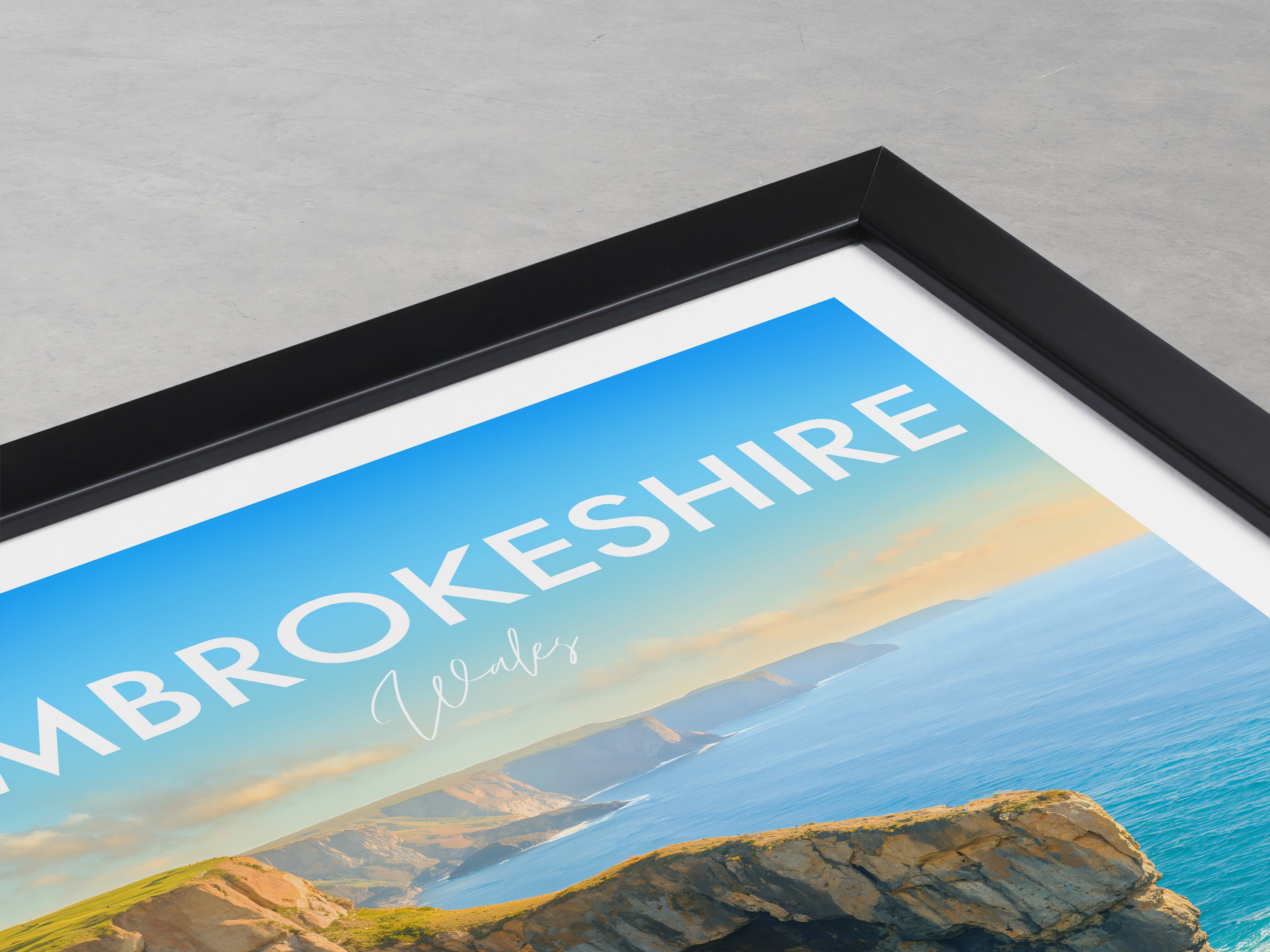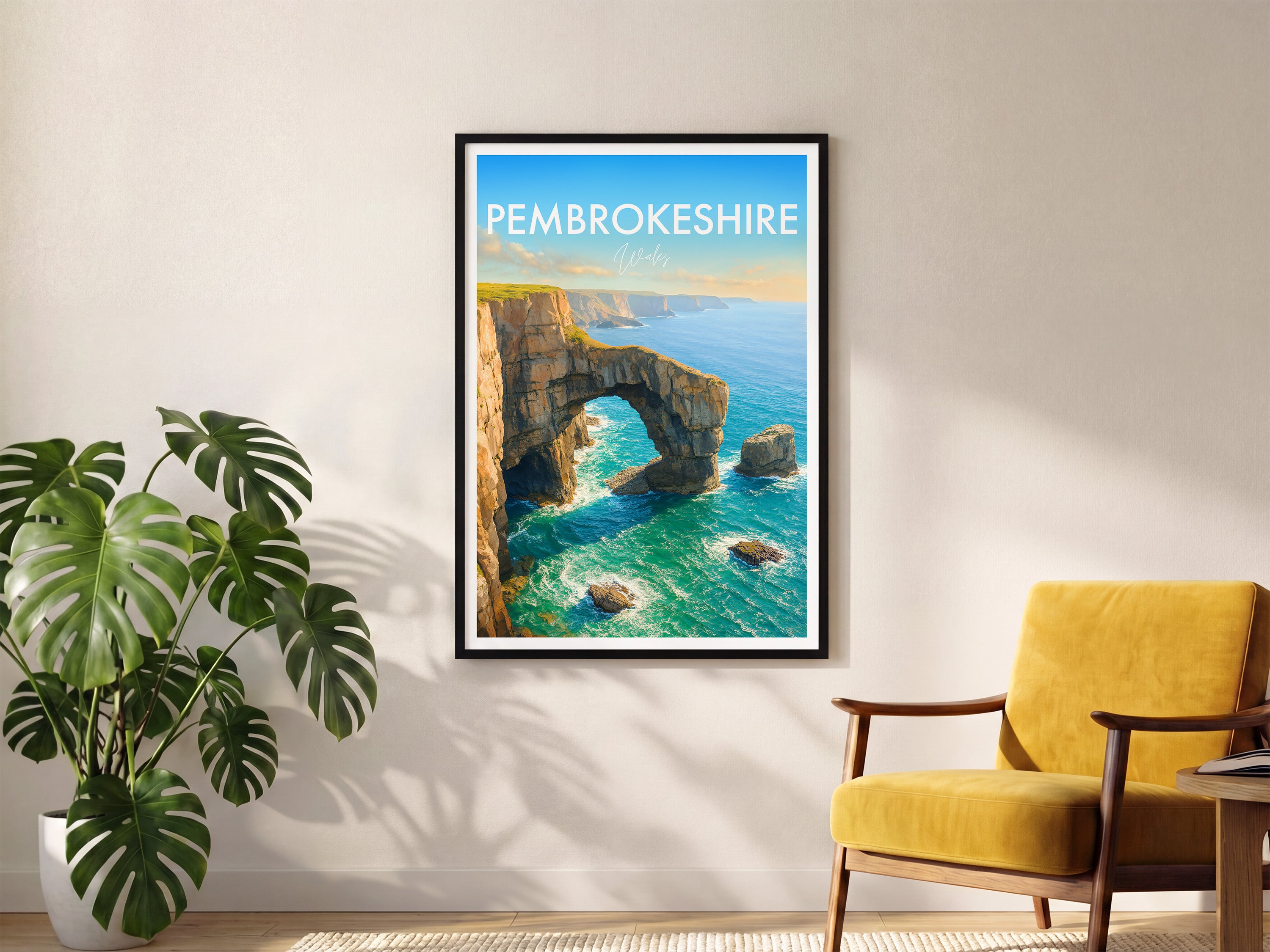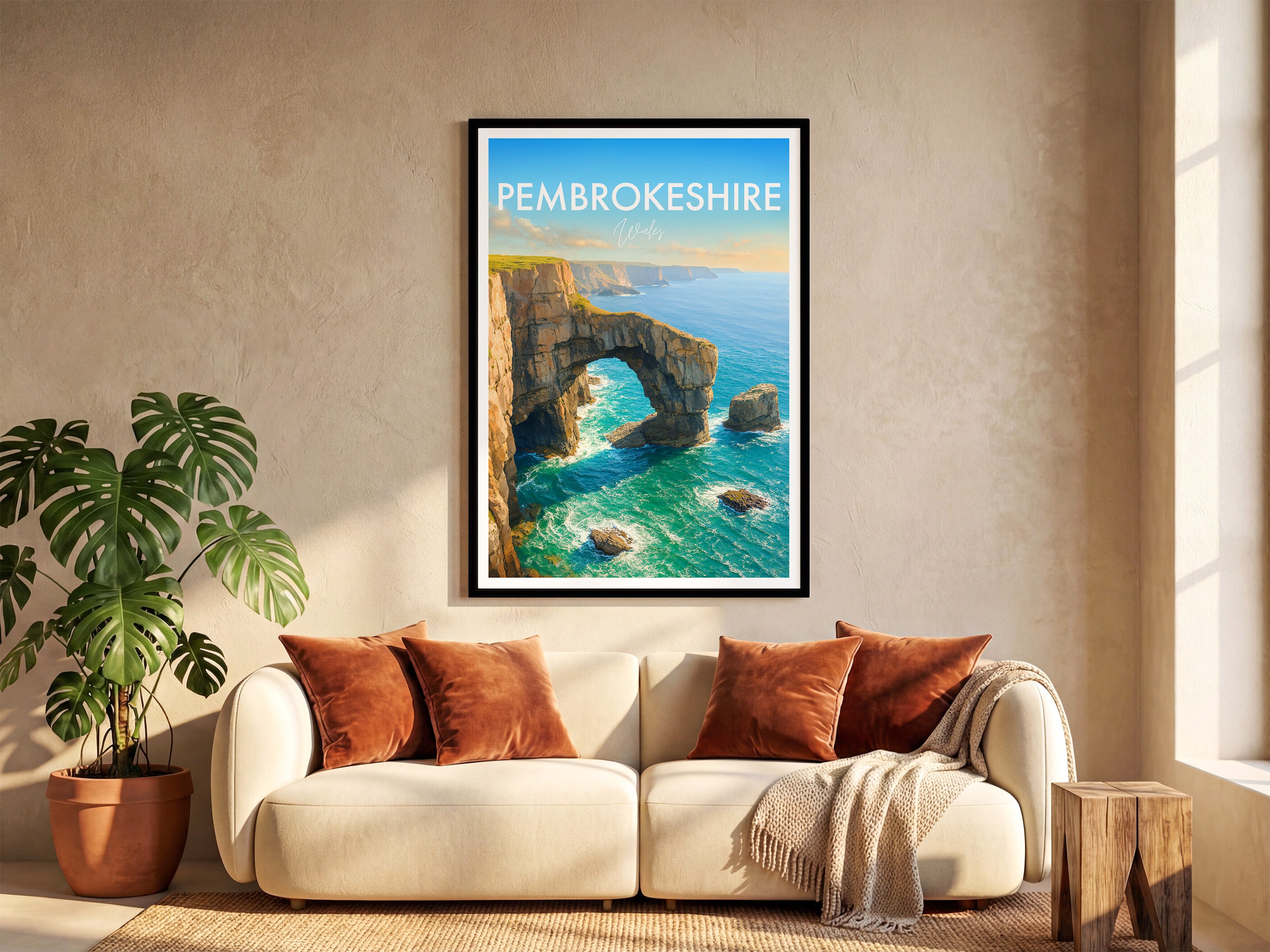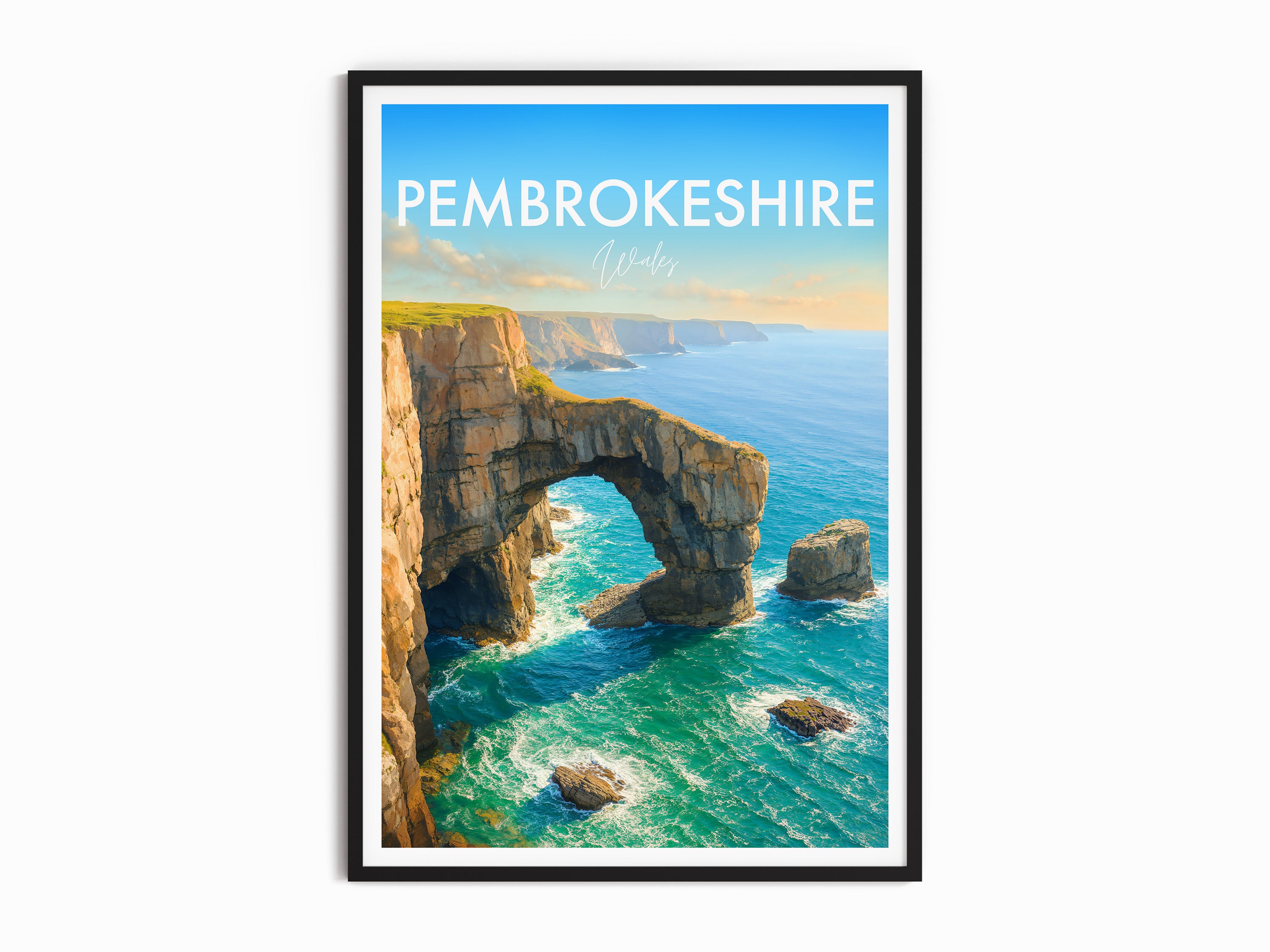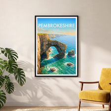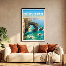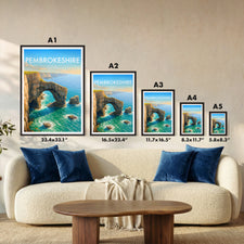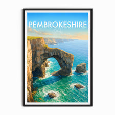 The natural arch of the Green Bridge of Wales forms a striking figure on the southern coastline of Pembrokeshire Coast National Park. This poster captures its iconic yet rugged beauty.