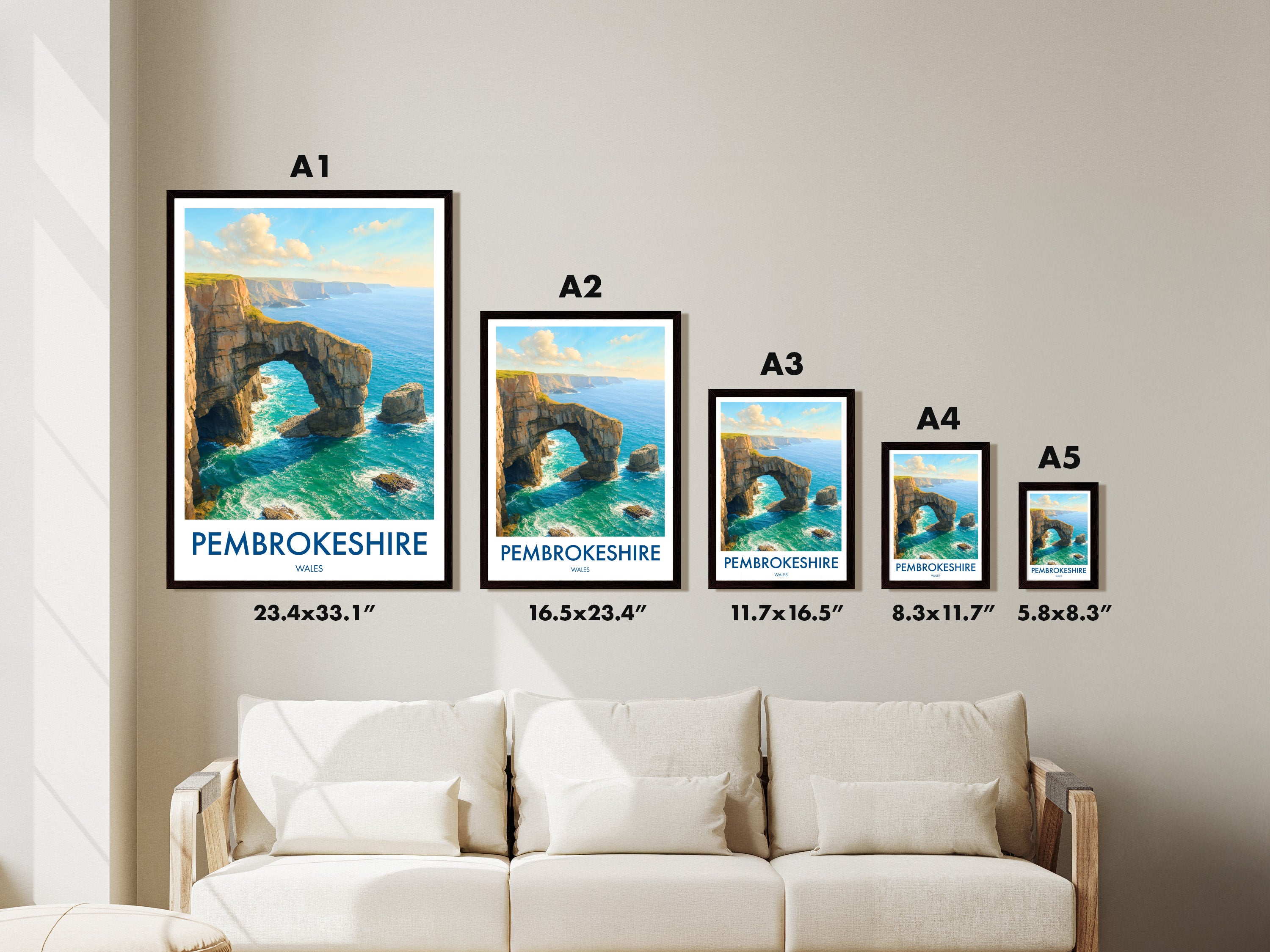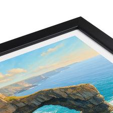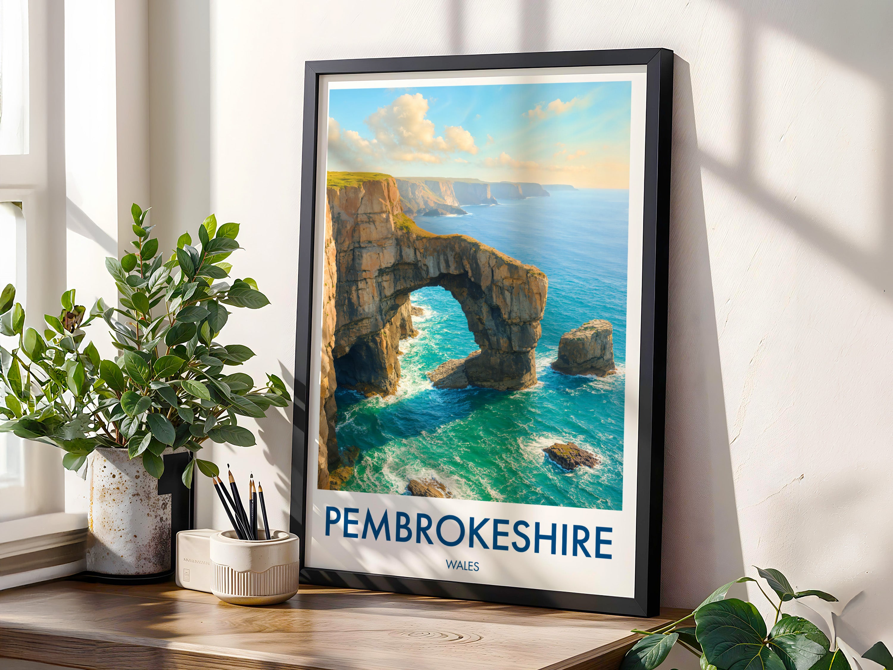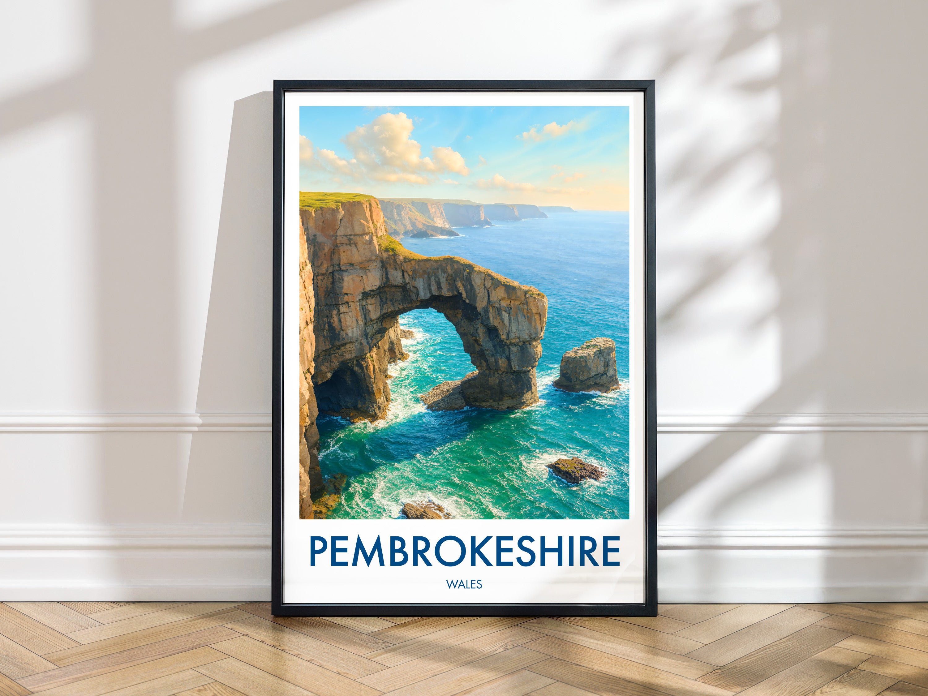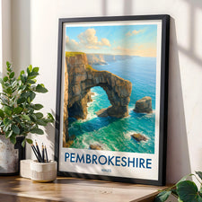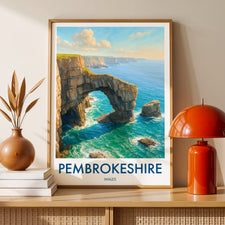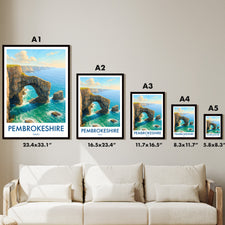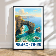 The natural arch of the Green Bridge of Wales forms a striking figure on the southern coastline of Pembrokeshire Coast National Park. This poster captures its iconic yet rugged beauty.