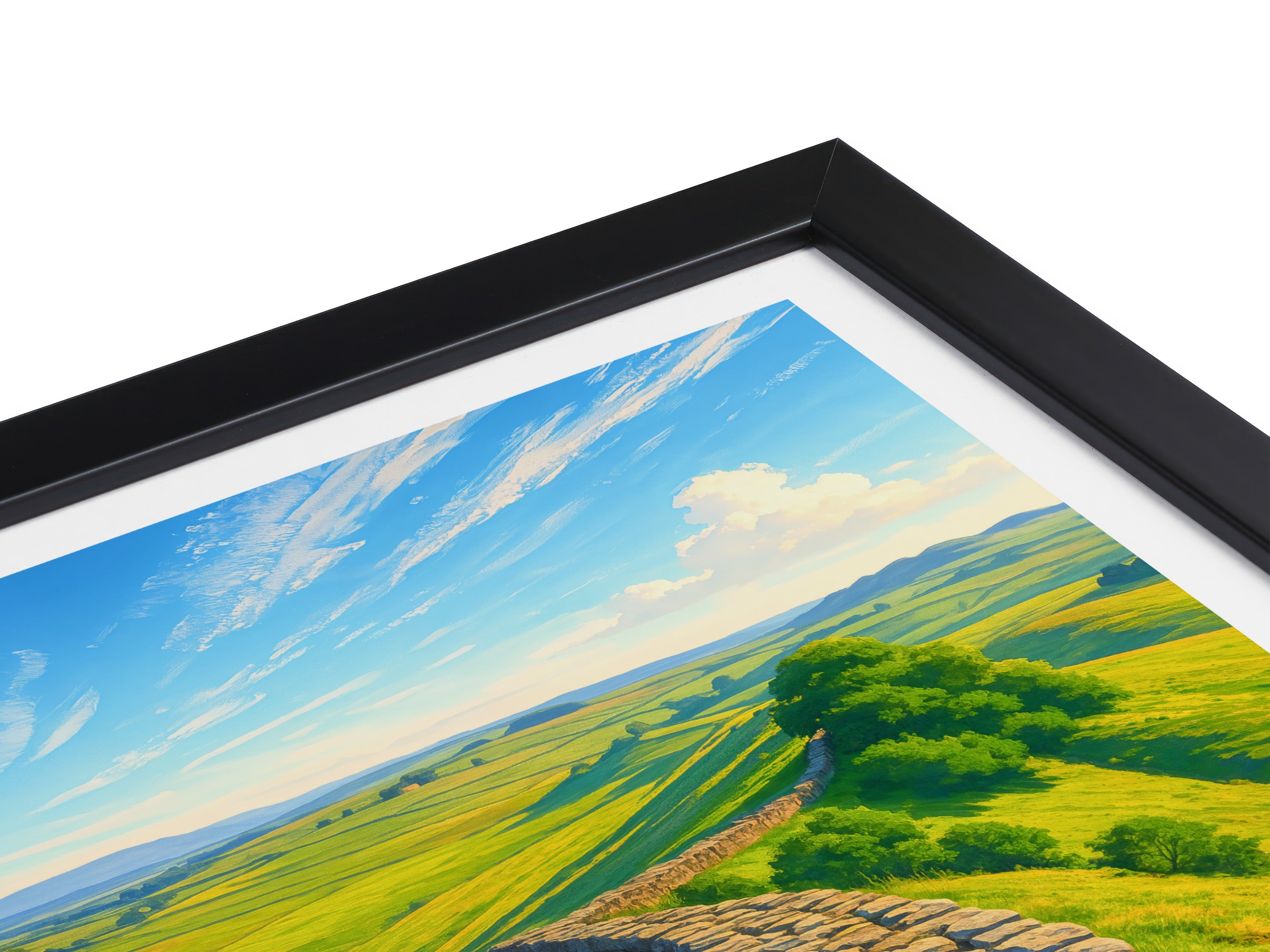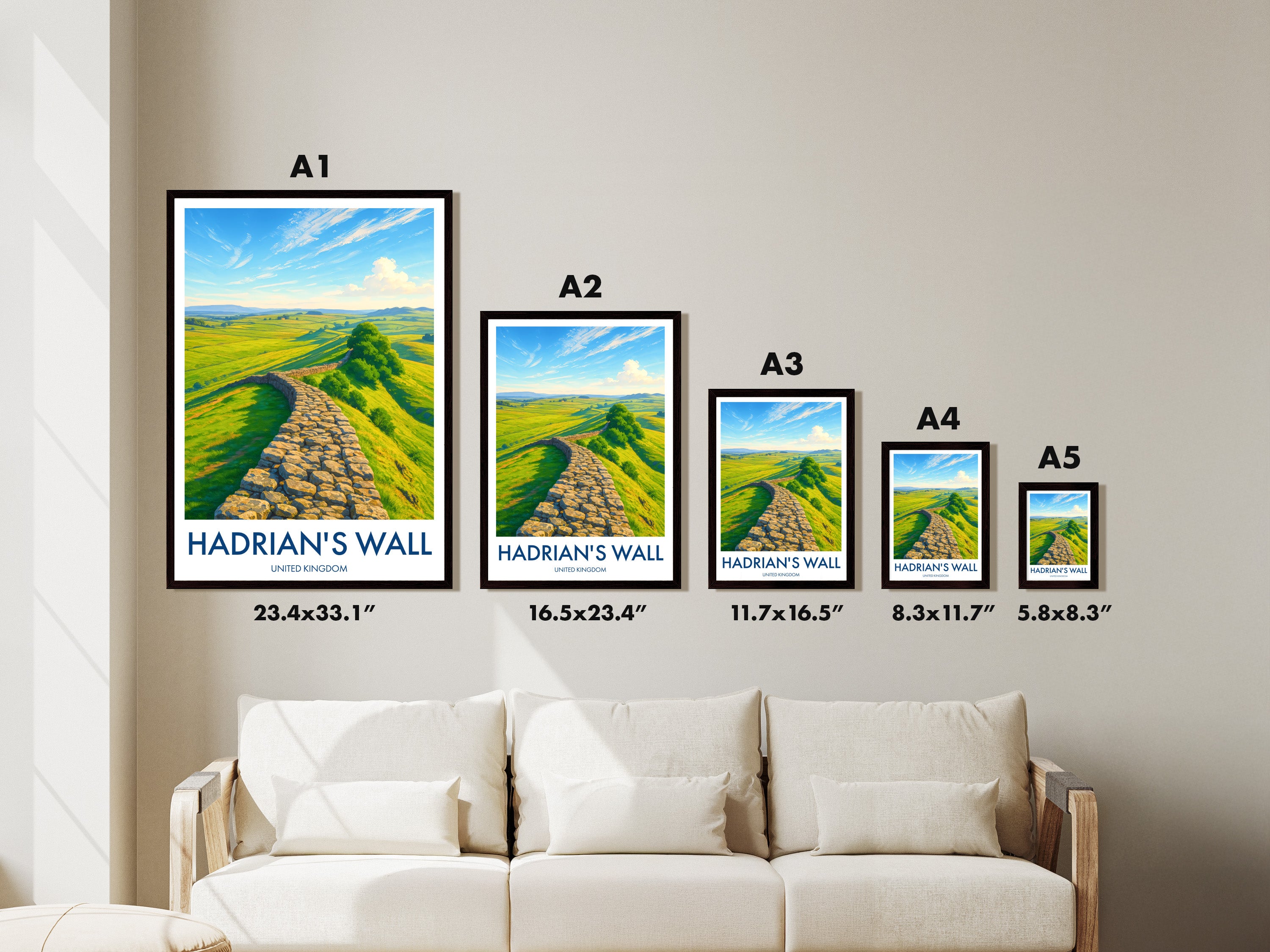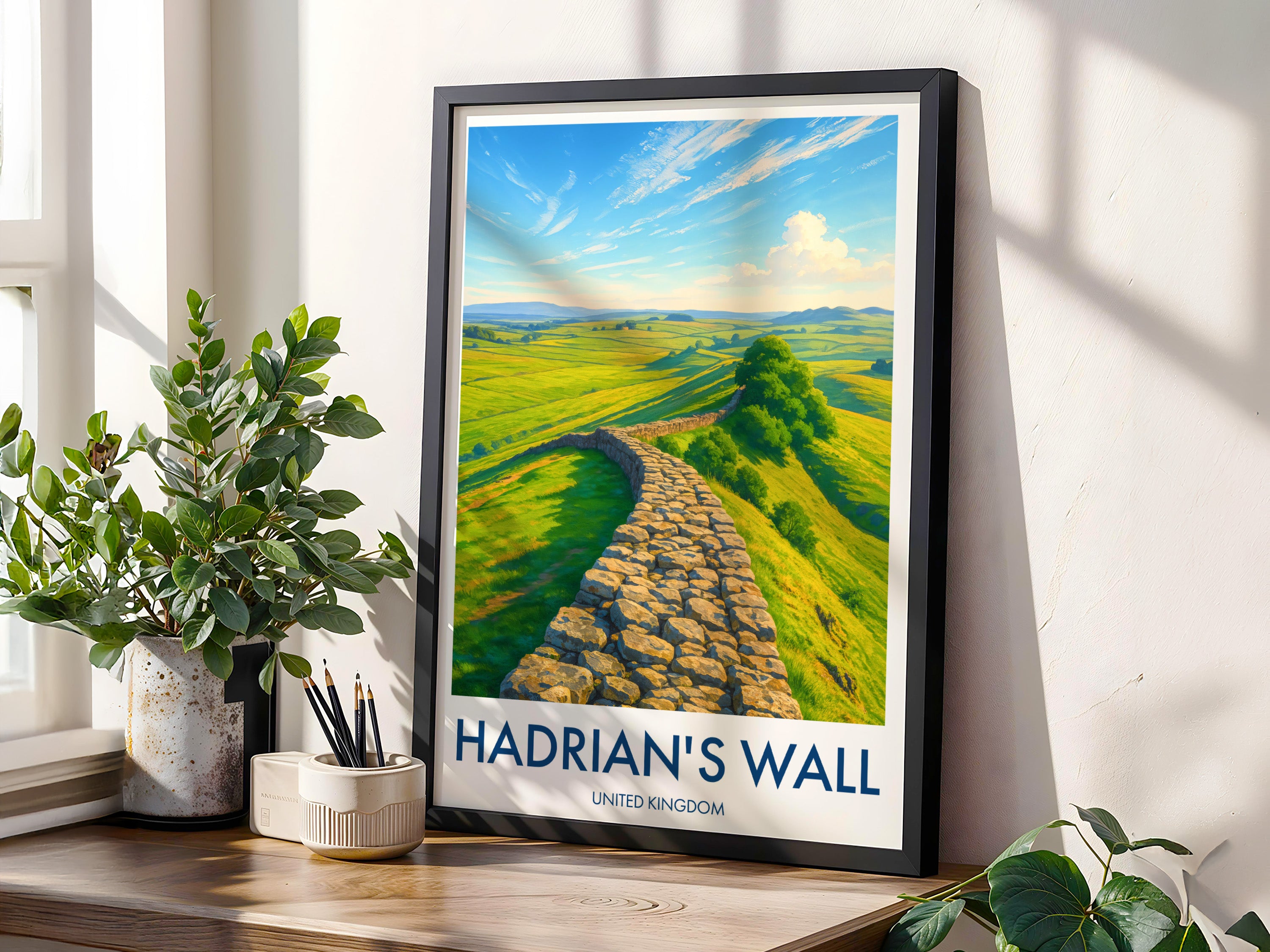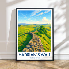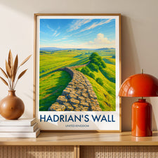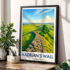 Capture the historic essence of Hadrian's Wall with this picturesque print. Set against the sprawling landscapes of Northumberland National Park, this poster brings a piece of Roman Britain into your home.