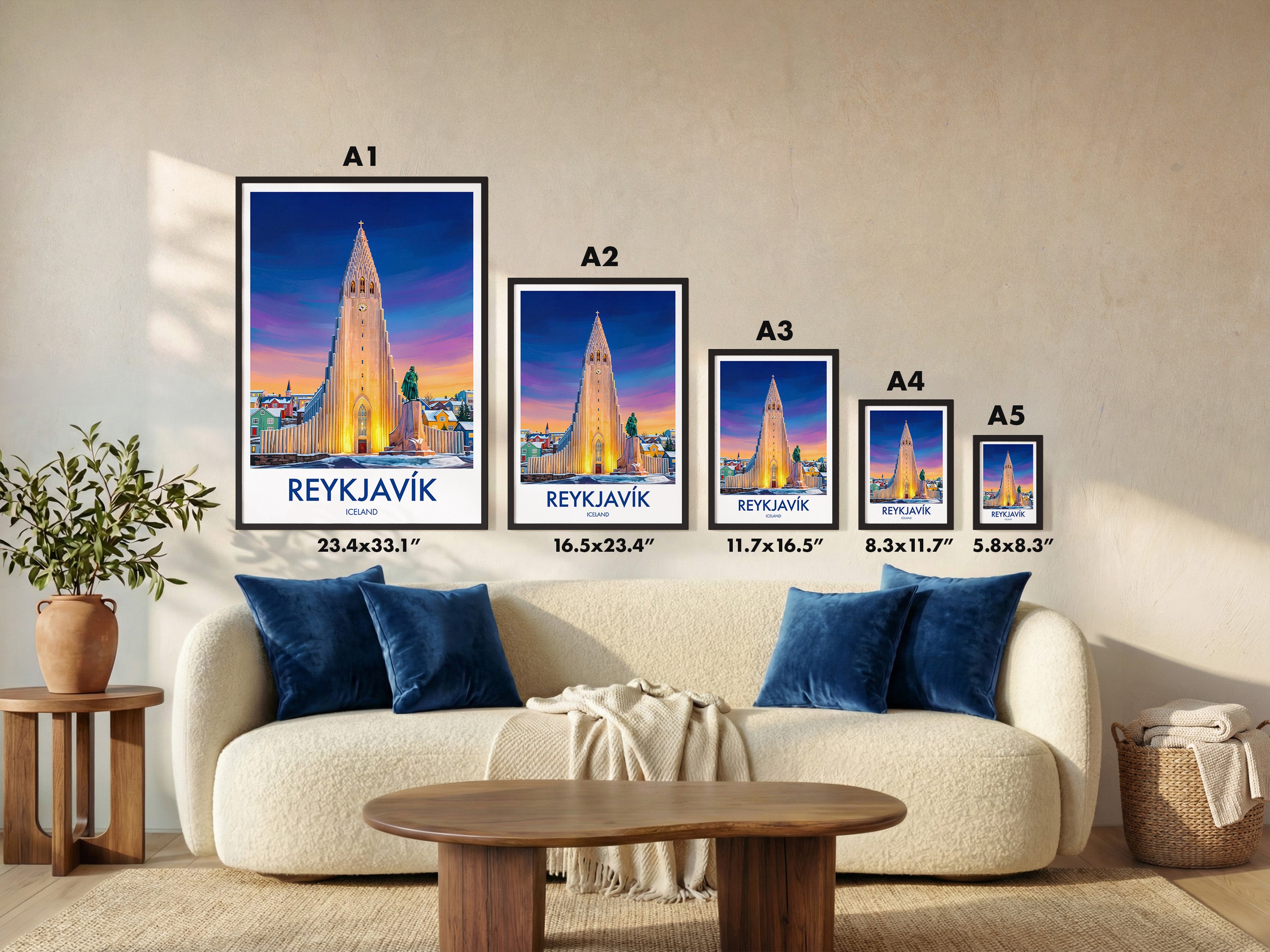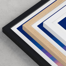 Framed options use sustainably sourced wooden frames in black, white, or natural wood, ready to hang.