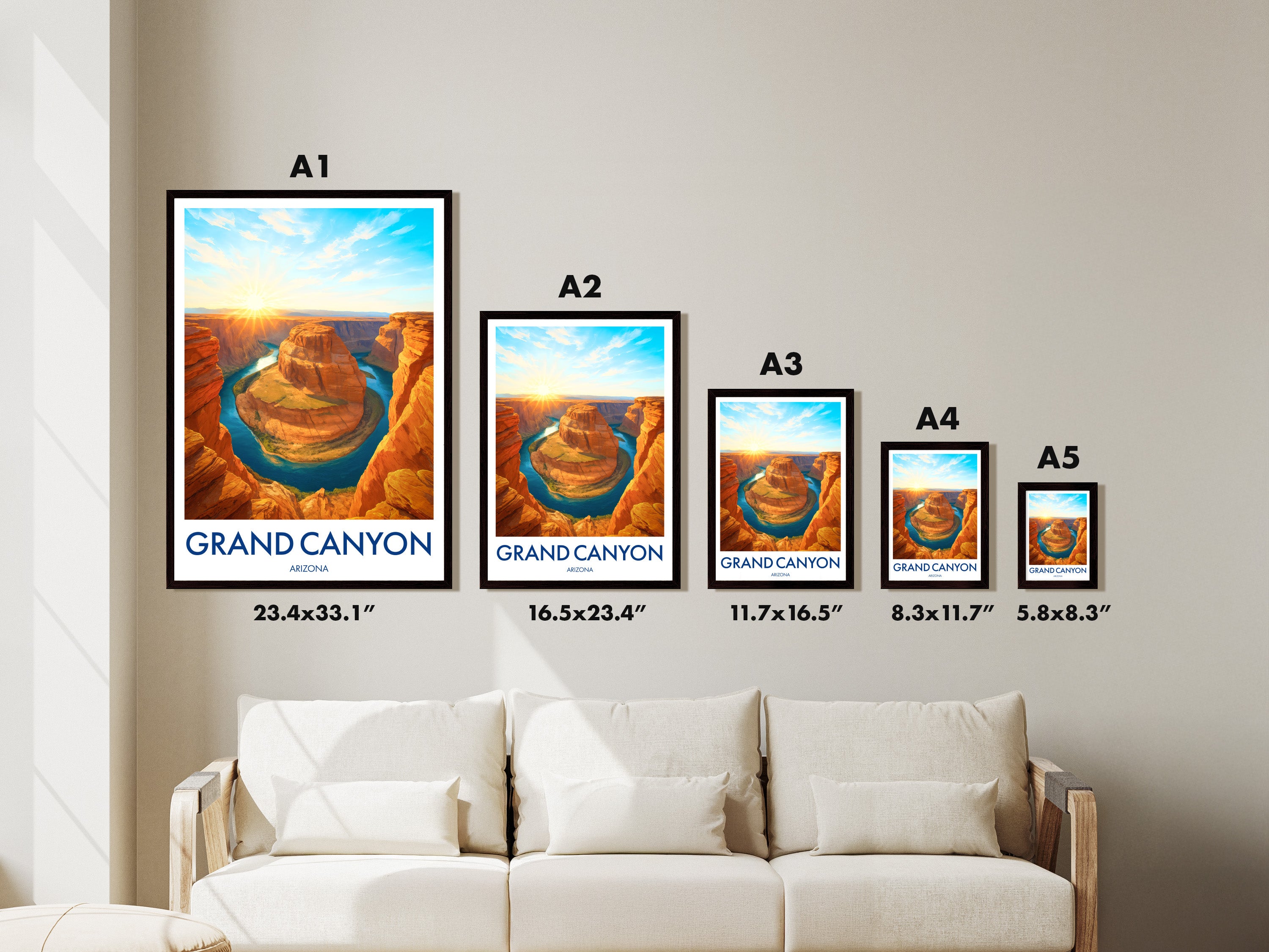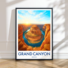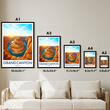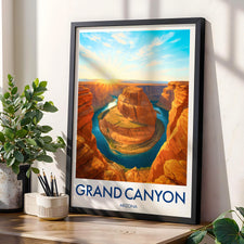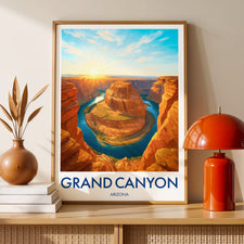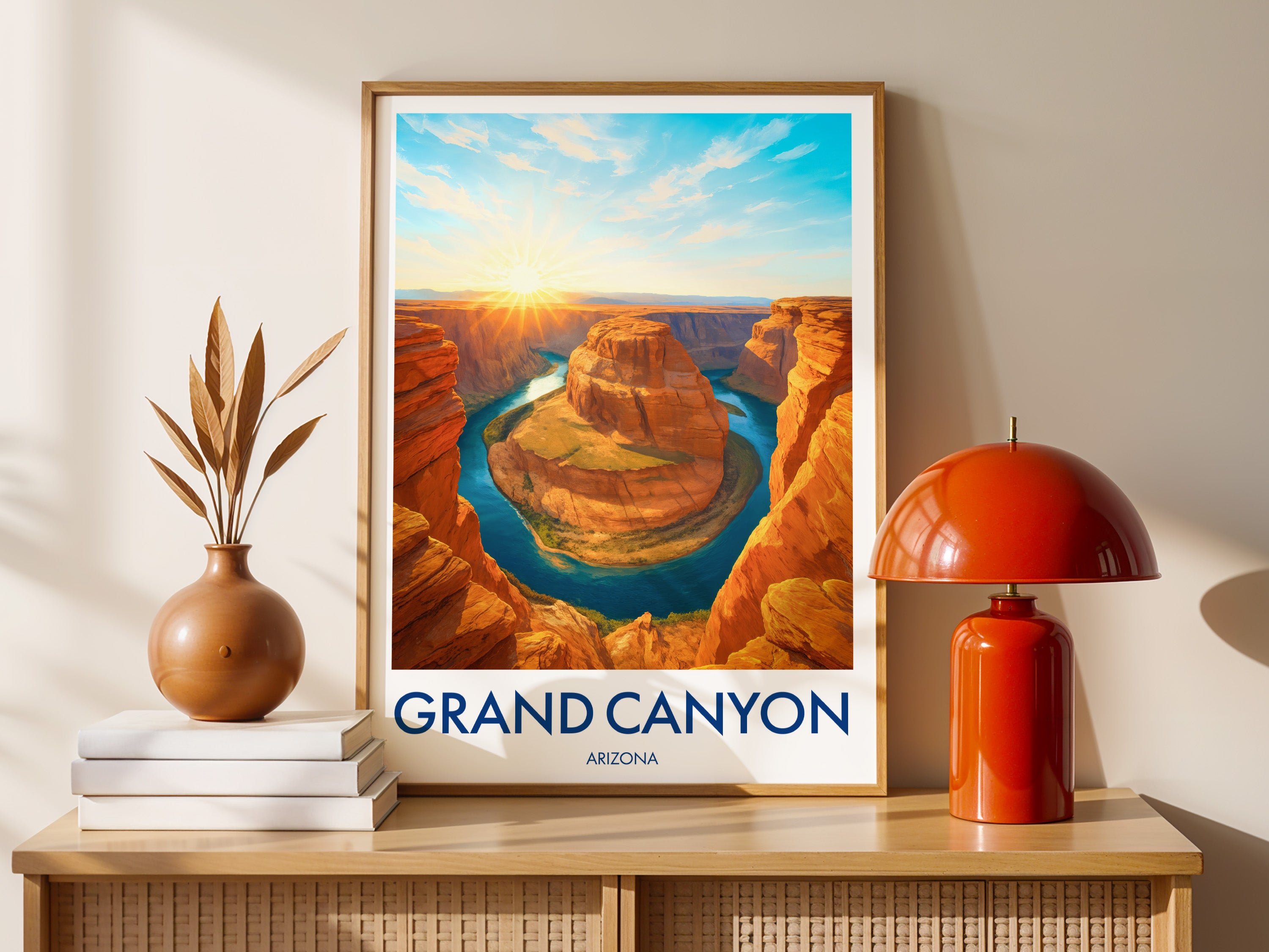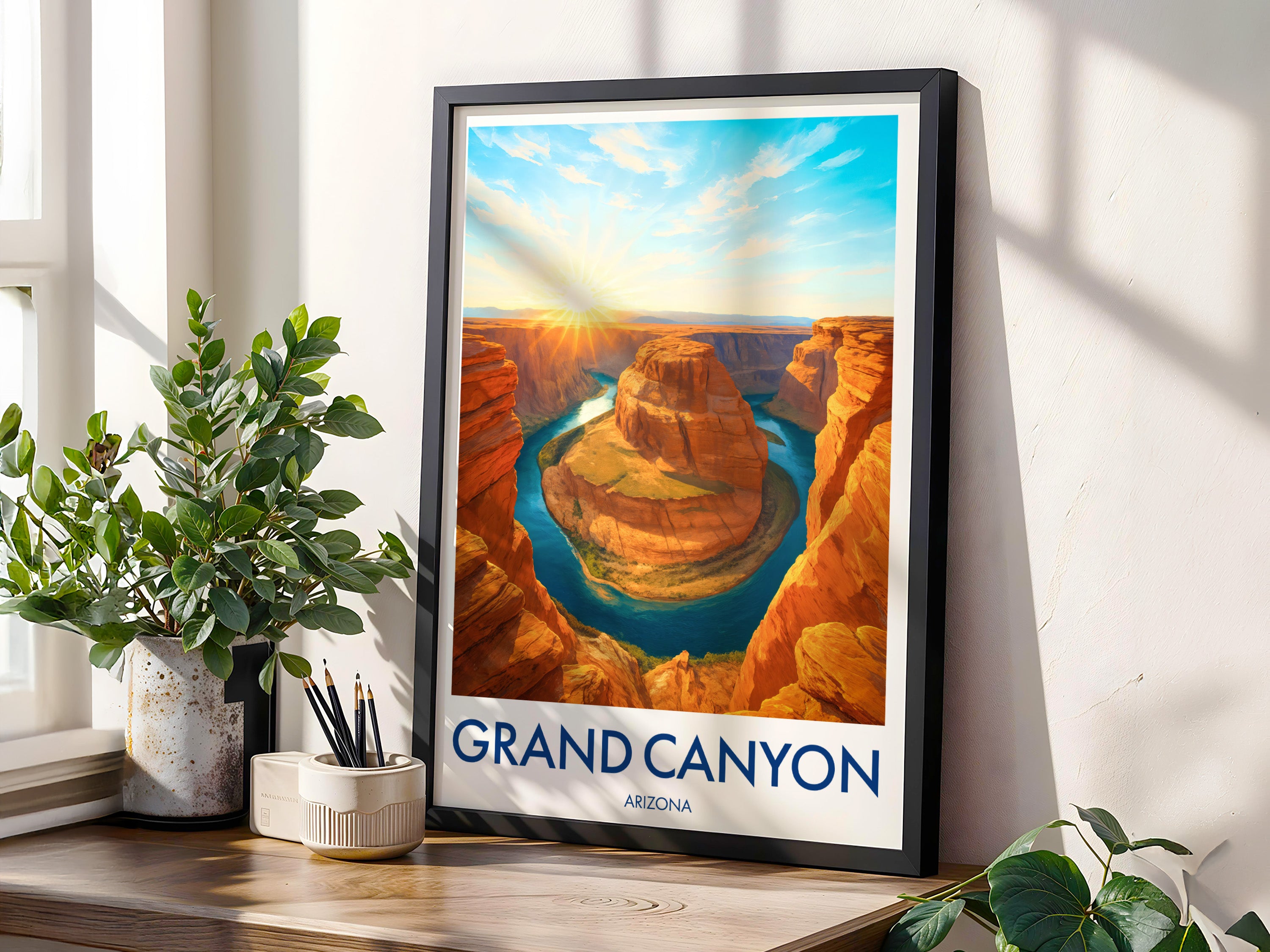 Horseshoe Bend near the Grand Canyon in Arizona reveals the river curving beneath towering red rock cliffs. This illustrated print captures one of the area's most iconic viewpoints.