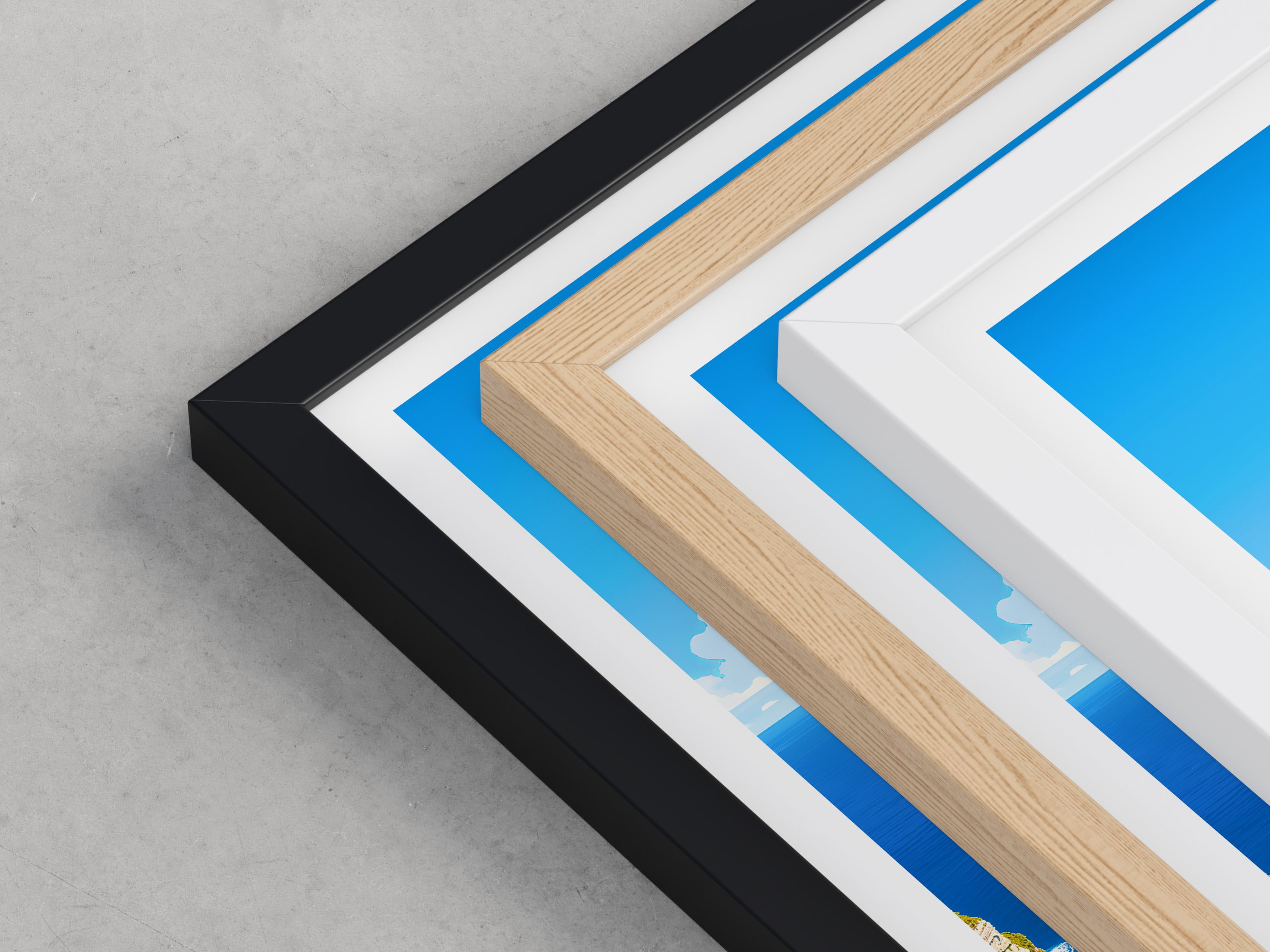 Framed options use sustainably sourced wooden frames in black, white, or natural wood, ready to hang.
